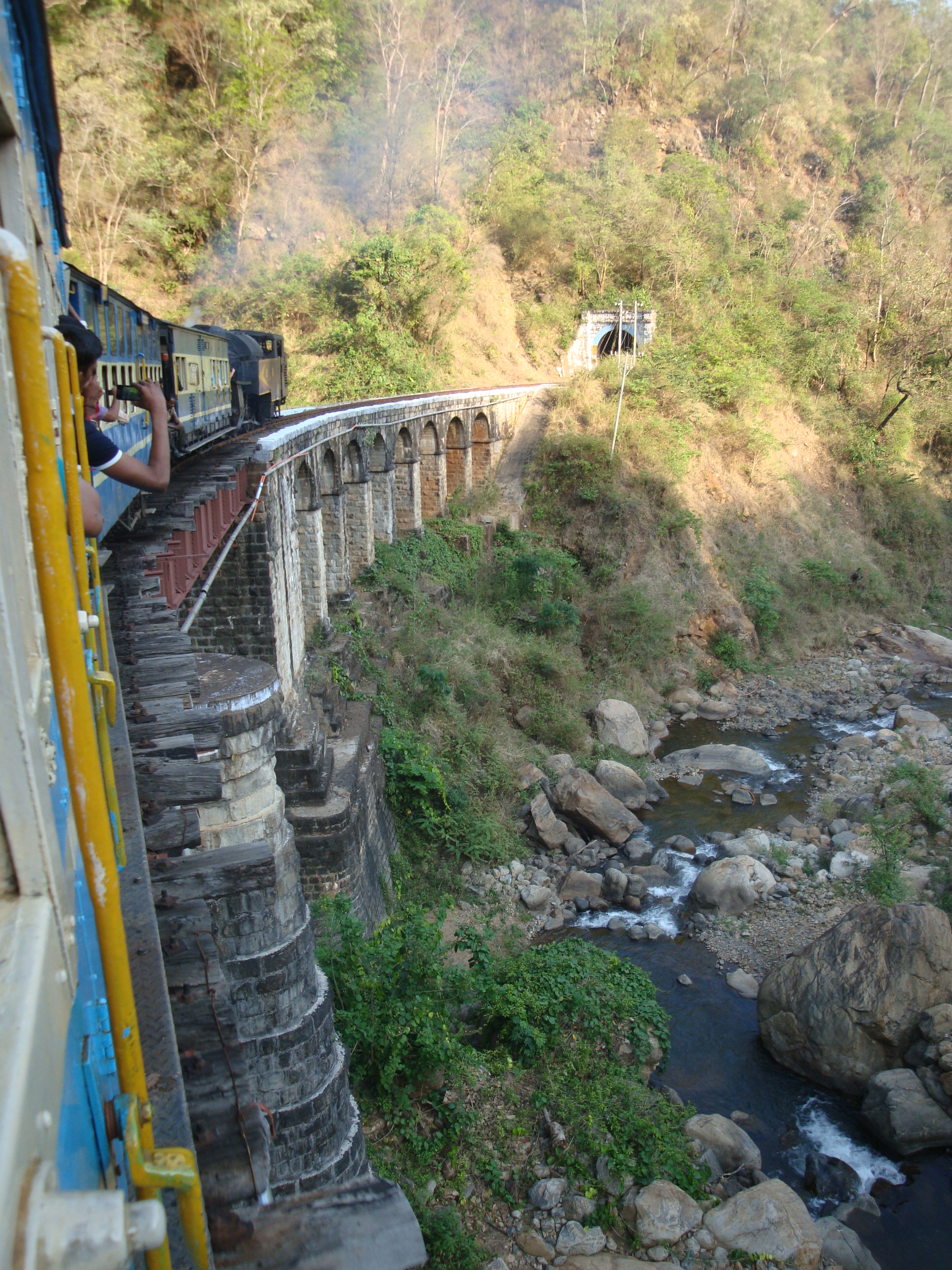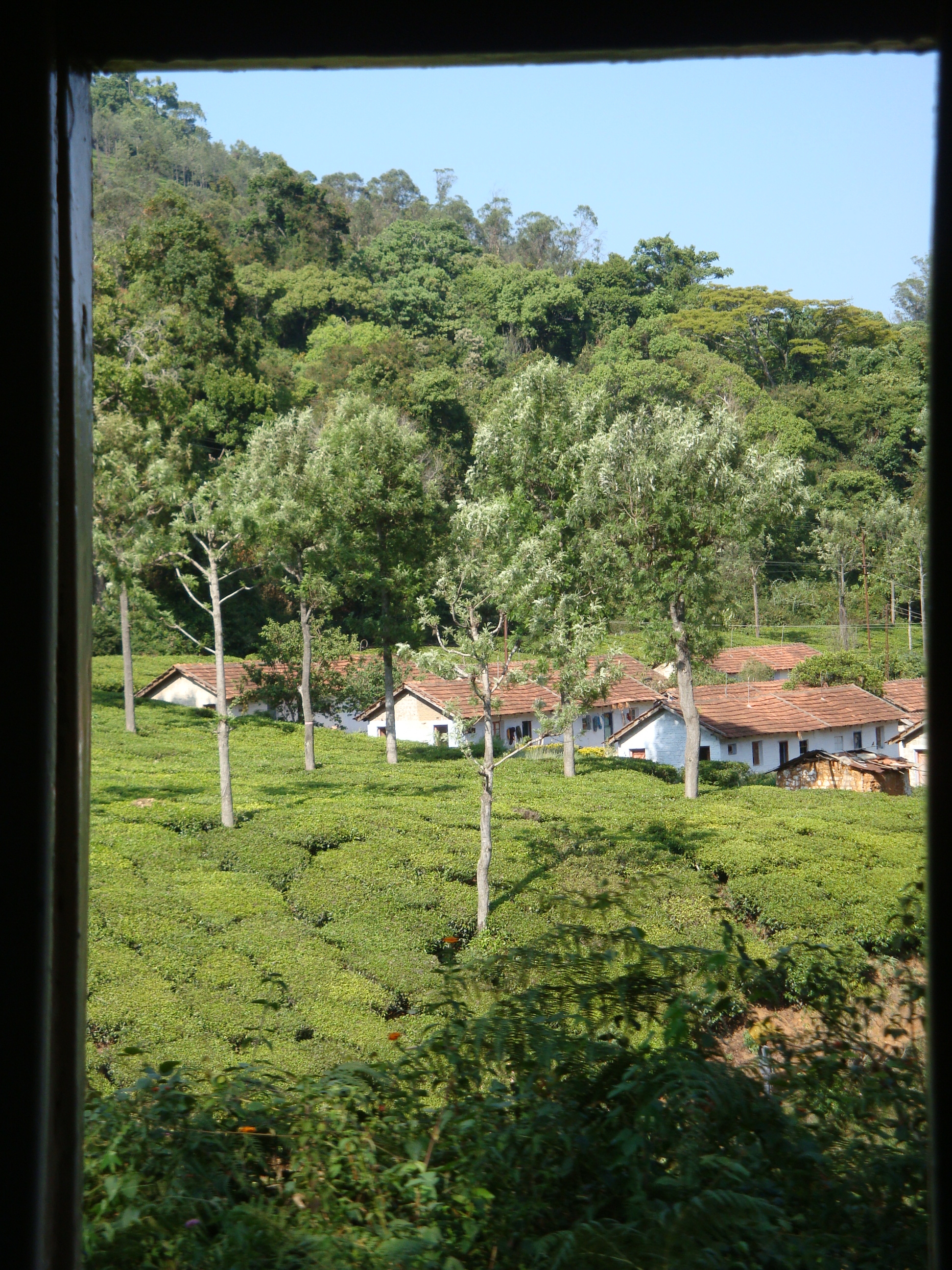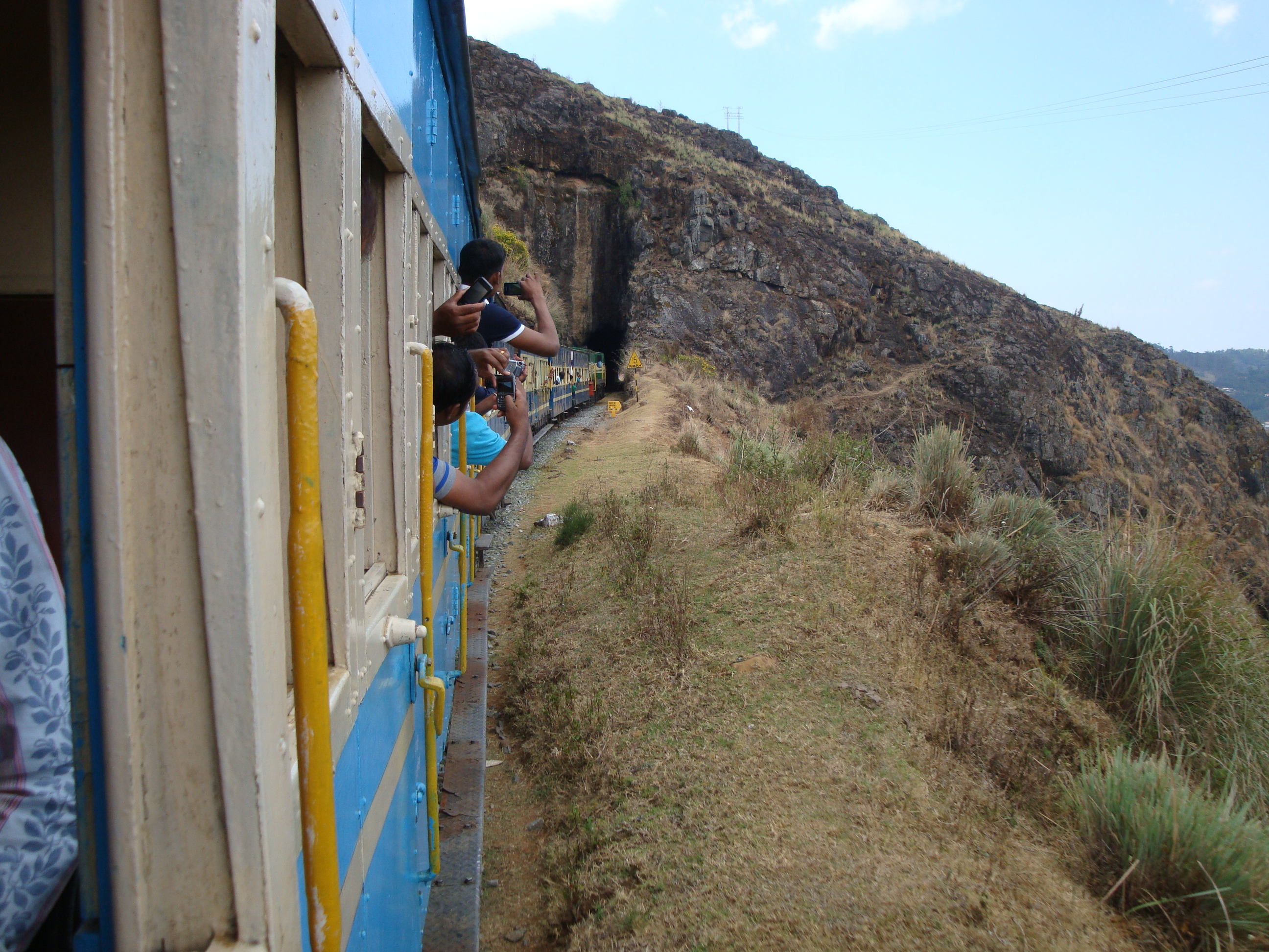 Very much like the ones in the Mysore museum, still dirty, greasy and decrepit, but working. We were right in the back carriage and, leaning out could see the carriages in front rattling over bridges and through tunnels, the big old engine belching out acrid diesel/coconut oil fumes that filled the tunnels and coated us in muck. The train guard behind us was also the Brakesman and boy, did he earn his keep. He spent the whole downward journey jumping from side to side, turning the brake cranks and sending up clouds of blue smoke as he tried to keep us on the rails. The views were stunning. Waterfalls, Jacaranda trees in full bloom standing amongst waves of tea bushes, the Plains far below. I loved it. Frequent stops to take on water, drink excellent India Railways Chai and feed the monkeys. Best part of the trip.
