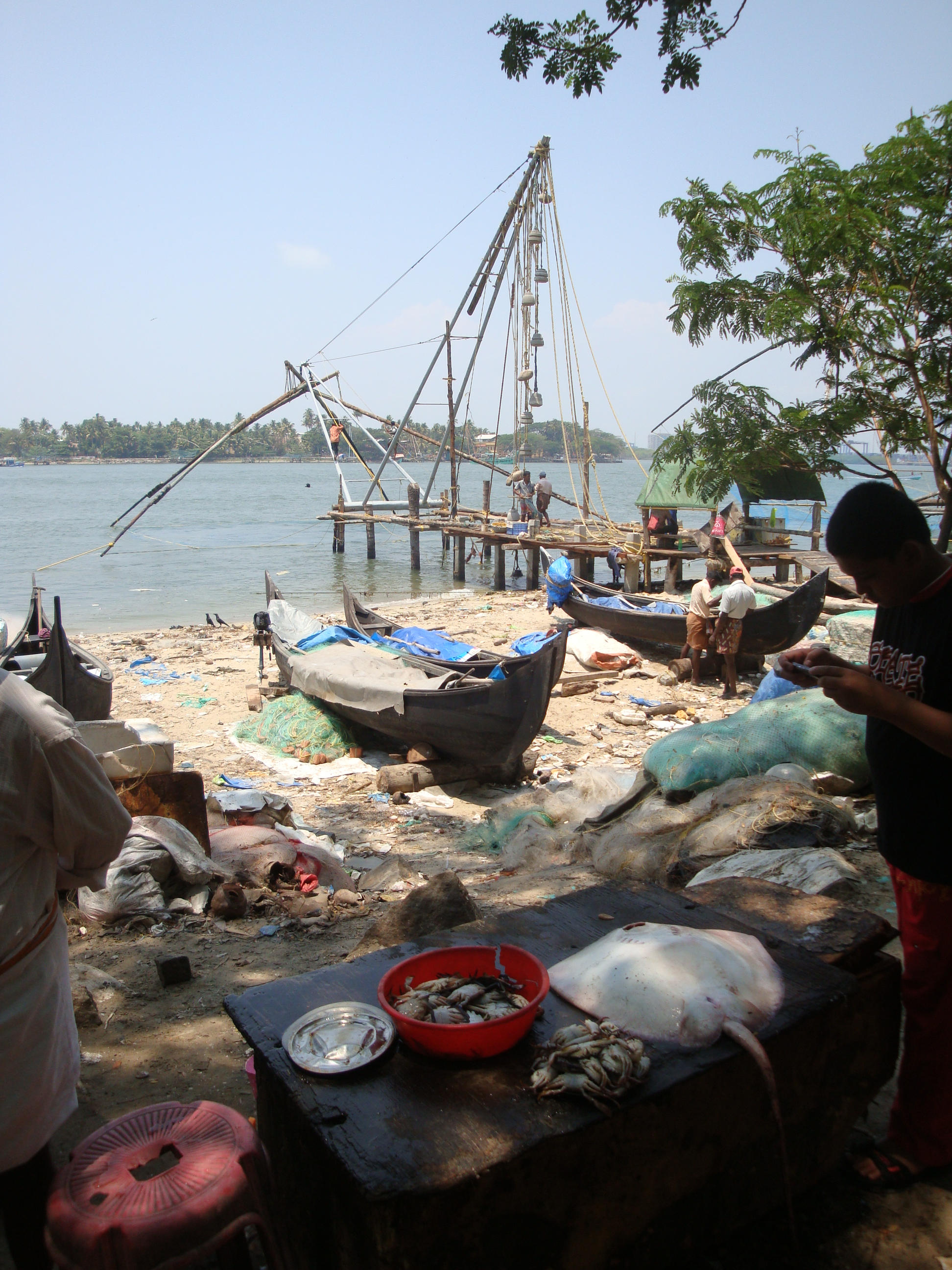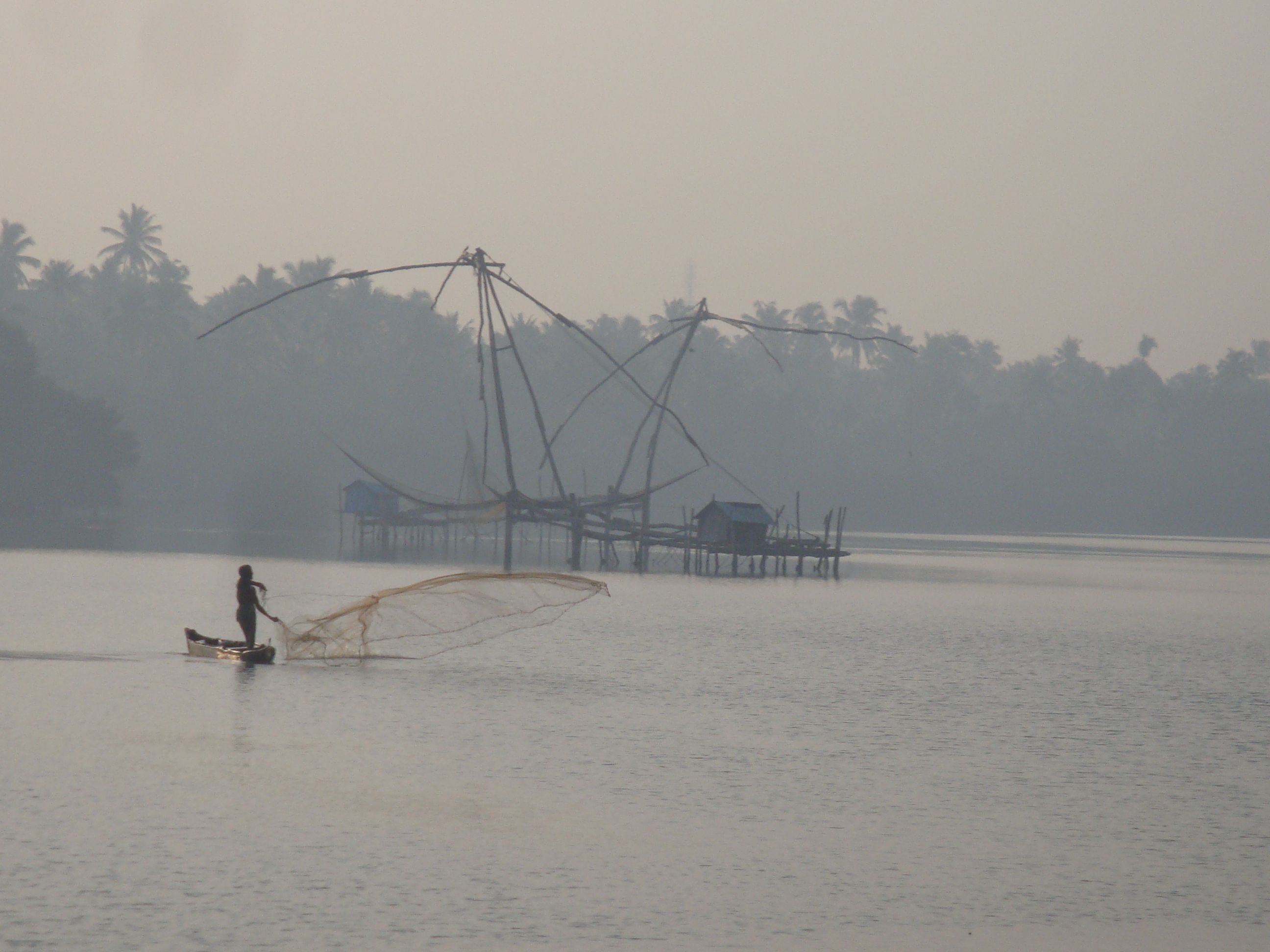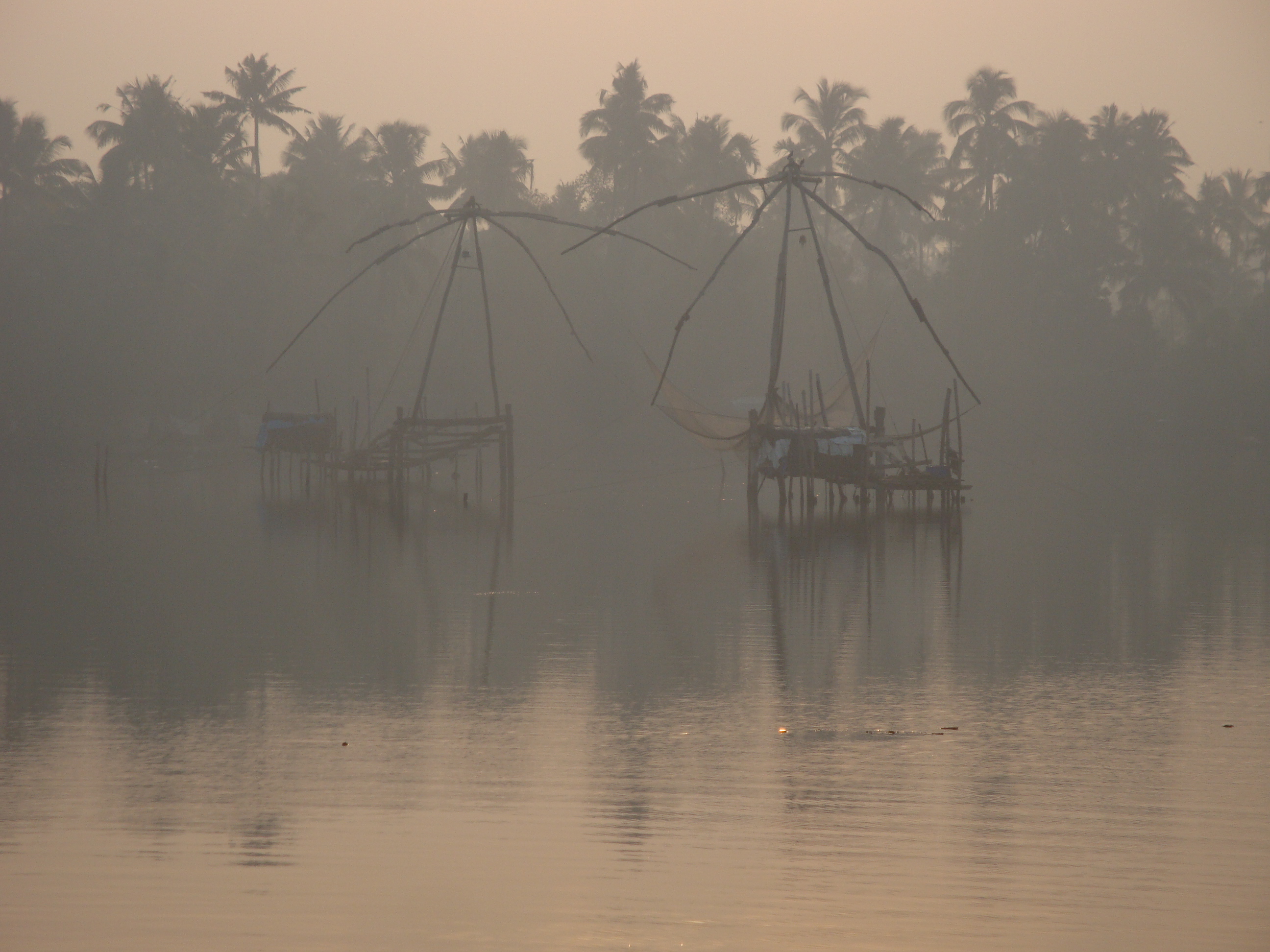 Day 5 and the dawn broke. I got up for the loo and never made it back to bed. Our cottage looked over the backwaters. Channels of brackish tidal waters where the land meets the sea, the sea meets the rivers and it’s all a bit mixed up. Huge great wooden cranes like stranded crabs rear up out of the still waters, mist shrouded, shrimp nets suspended by balance weights of rope and rock. Indian music rolls over from some distant temple. A lone fisherman casts his net from his boat, then slips into the water to gather his catch as the orange globe of the sun burns its way up and over the crown of the coconut trees. Absolutely fabulous. I couldn’t put my camera down.