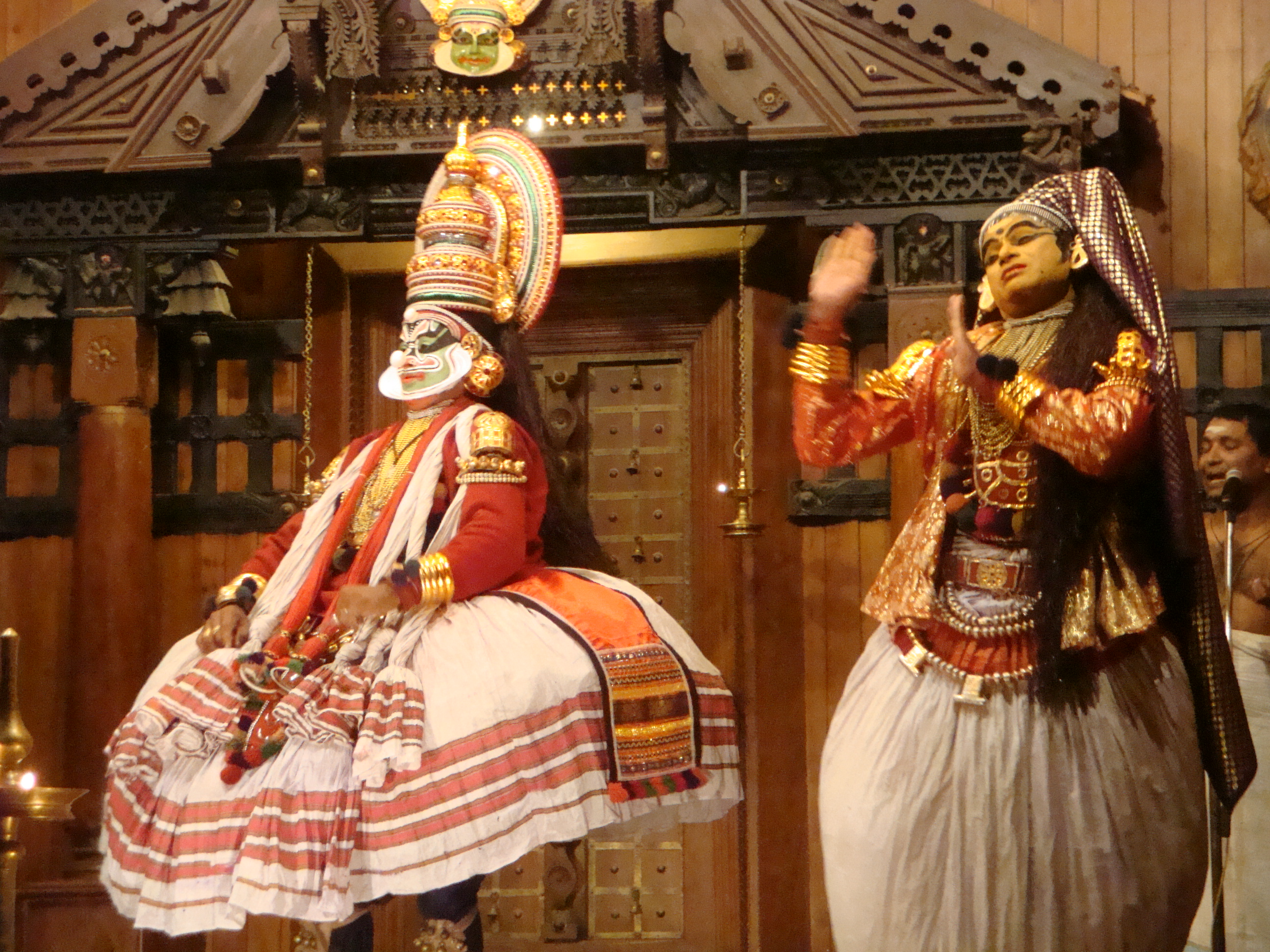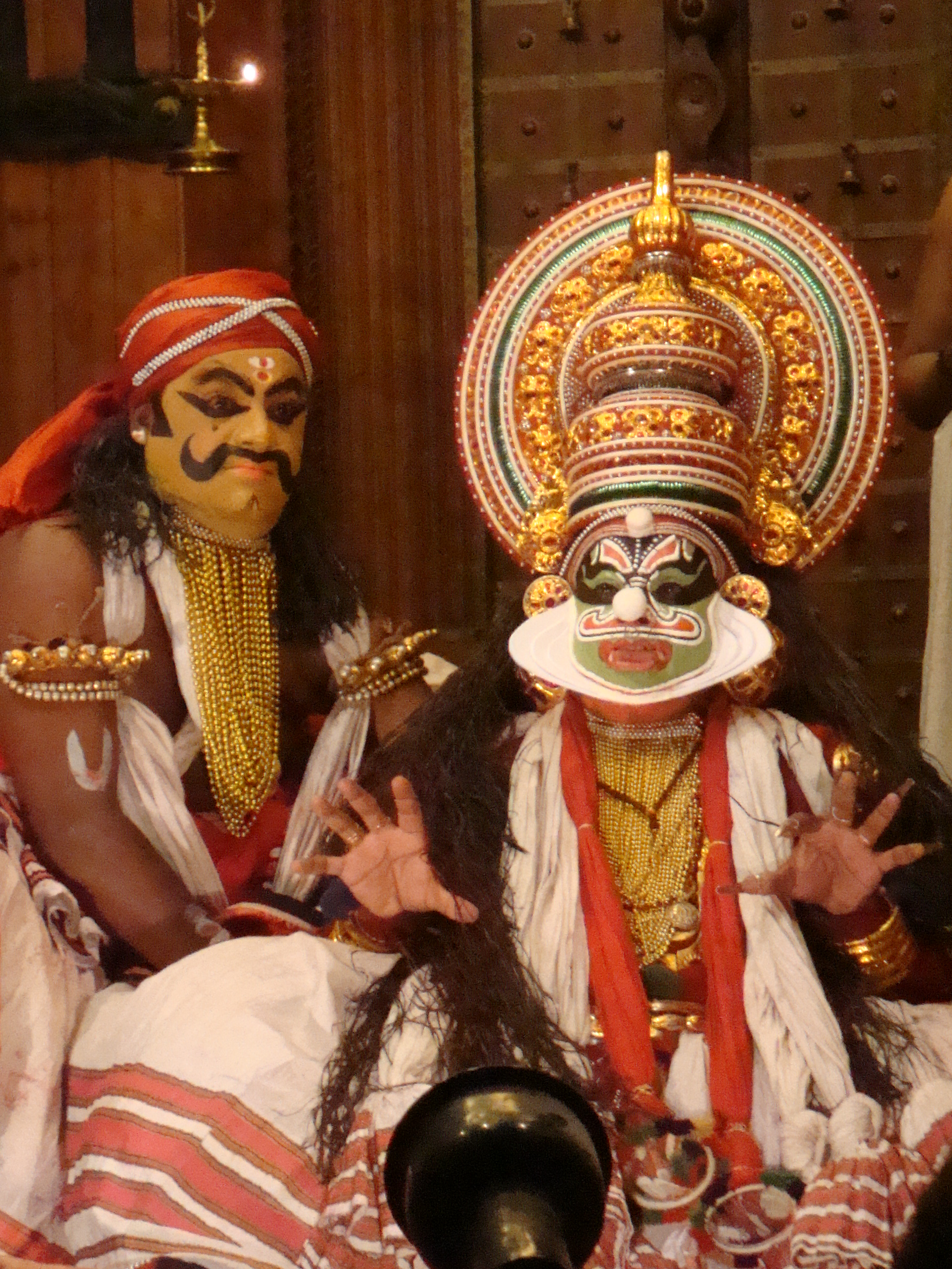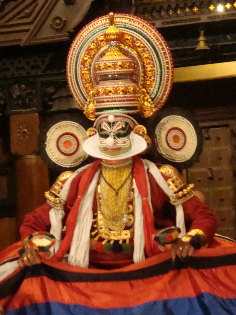 We drove back into town, feeling a bit more up-beat and went to see a Kathakali Dance performance. This is a bit like Punch & Judy meet the Widow Twankey with Godzilla playing the part of the young princess. All male, or at least nominally so. The music was different, the dance was unusual, the costumes were amazing and the make-up was incredible. The lead dude has to look angry so, an hour before each performance, he puts a peppercorn under each eyelid and keeps it there so that his eyes are nice and red. He must be mental.