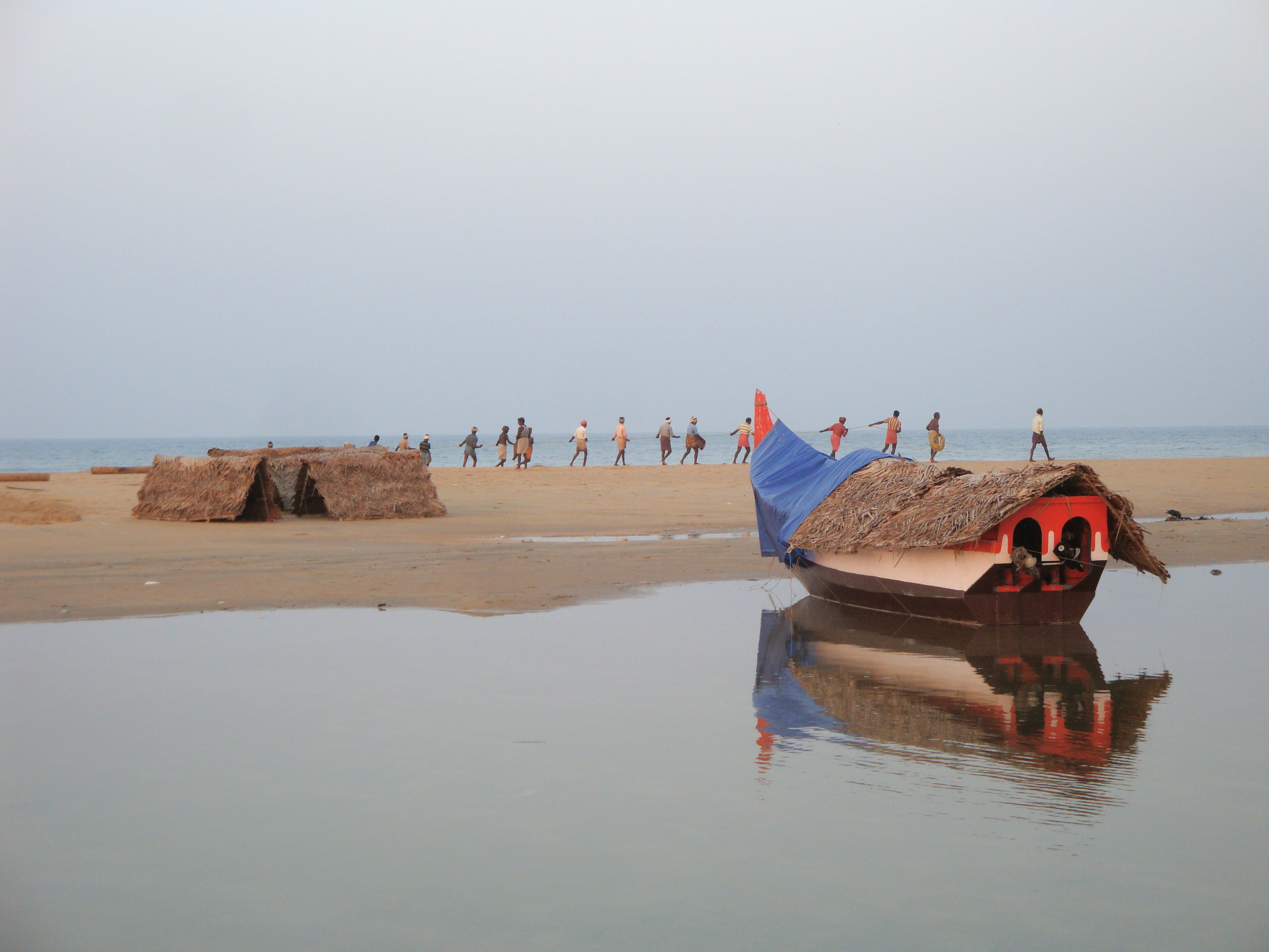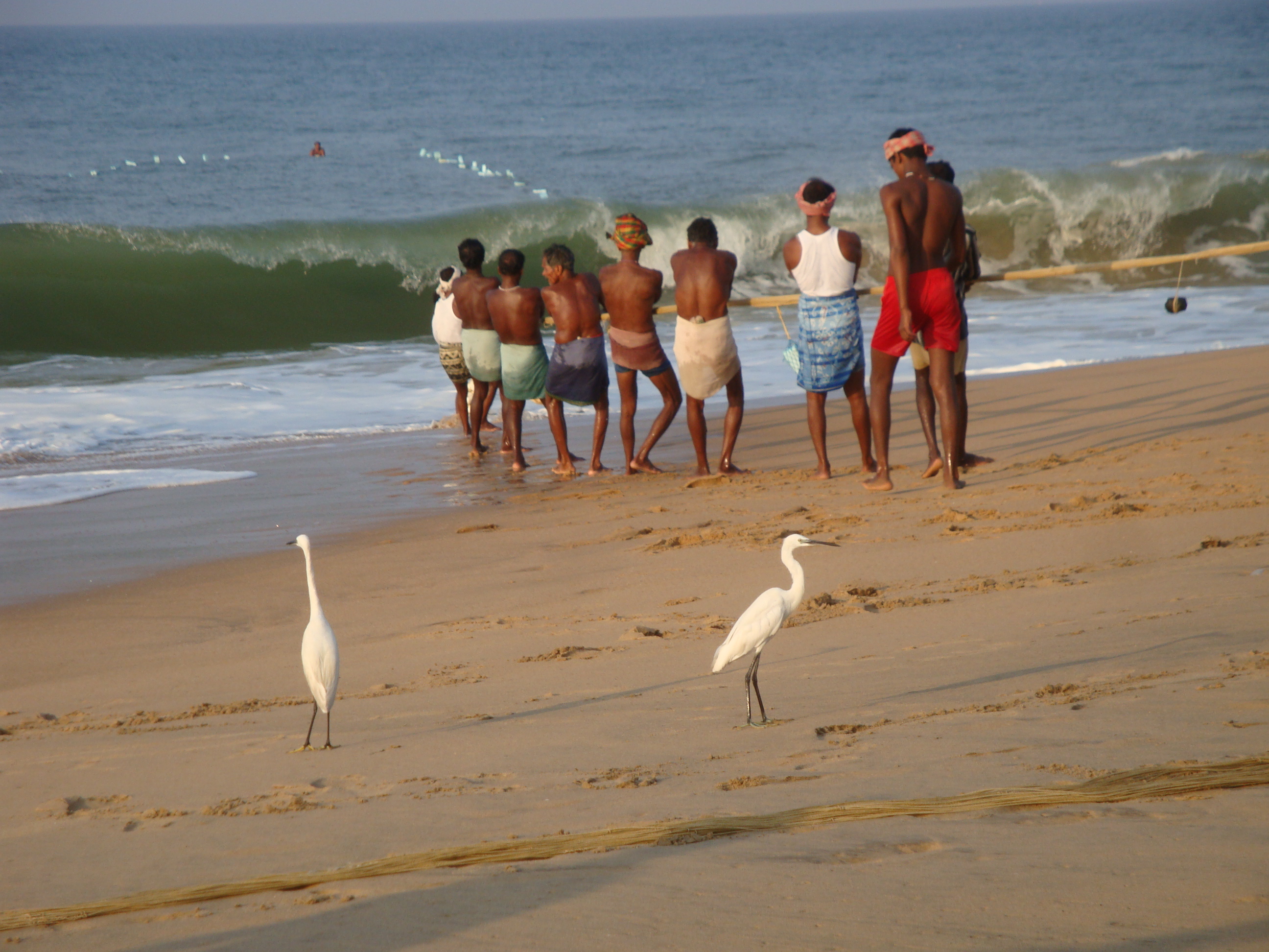 Up with the dawn and the beach already active. Lines of local fisherman working at something. We went down to discover. Boats rowing out with miles of net, dropping an arc over the ocean and returning, riding the crashing surf further down the beach. Teams of old gadgies in sarongs and turbans, pulling on ropes, hauling in the nets. Hand over hand and walking backwards. Circulating from back to front. The never-ending rope and net. Finally, the floats begin to bunch, you can see the arc closing with the shore. Some of the younger fishermen jump in to try and keep the fish within the arc and stop the surf tumbling the whole contraption so that the mornings work does not escape. Egrets and crows descend in the hope of spillage. Finally, with one great roar of crashing foam the sea surrenders its bounty, the catch is in. The purse is hauled ashore.