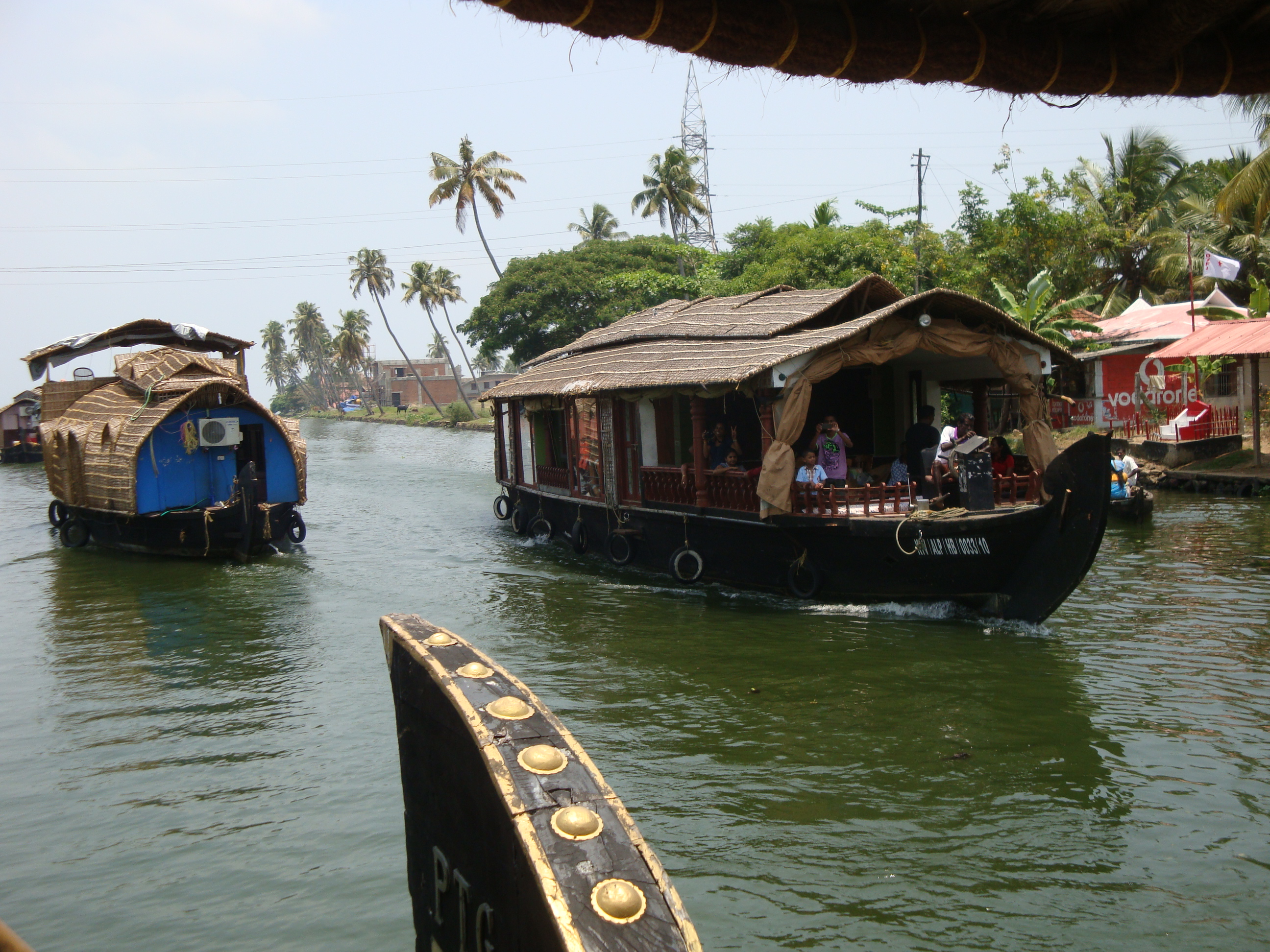 Day 9 and they manage to drag me, kicking and screaming, from my hammock. By now my back and bum look like a string bag full of spuds. We drive to Alleppey to meet our house boat. The whole area between Allepey and Cochin, stretching over a distance of some 50 miles, are canals, lakes, backwaters and seas that are evidently rice paddies. The old rice barges are redundant in this age of trucks and so have been converted into beautiful houseboats. They have thatched roofs and balconies, air-conditioned bedrooms and a crew of happy wayfarers who delight in pampering their guests with cold drinks and tid-bits. Everyone except ours. This was the last opportunity for our travel Agent to f*&^ things up and they did it in style. Our decrepit old tug was barely afloat. No balcony, only a glassed-in front bit, where we could peer out through sticky windows at the glories passing by.