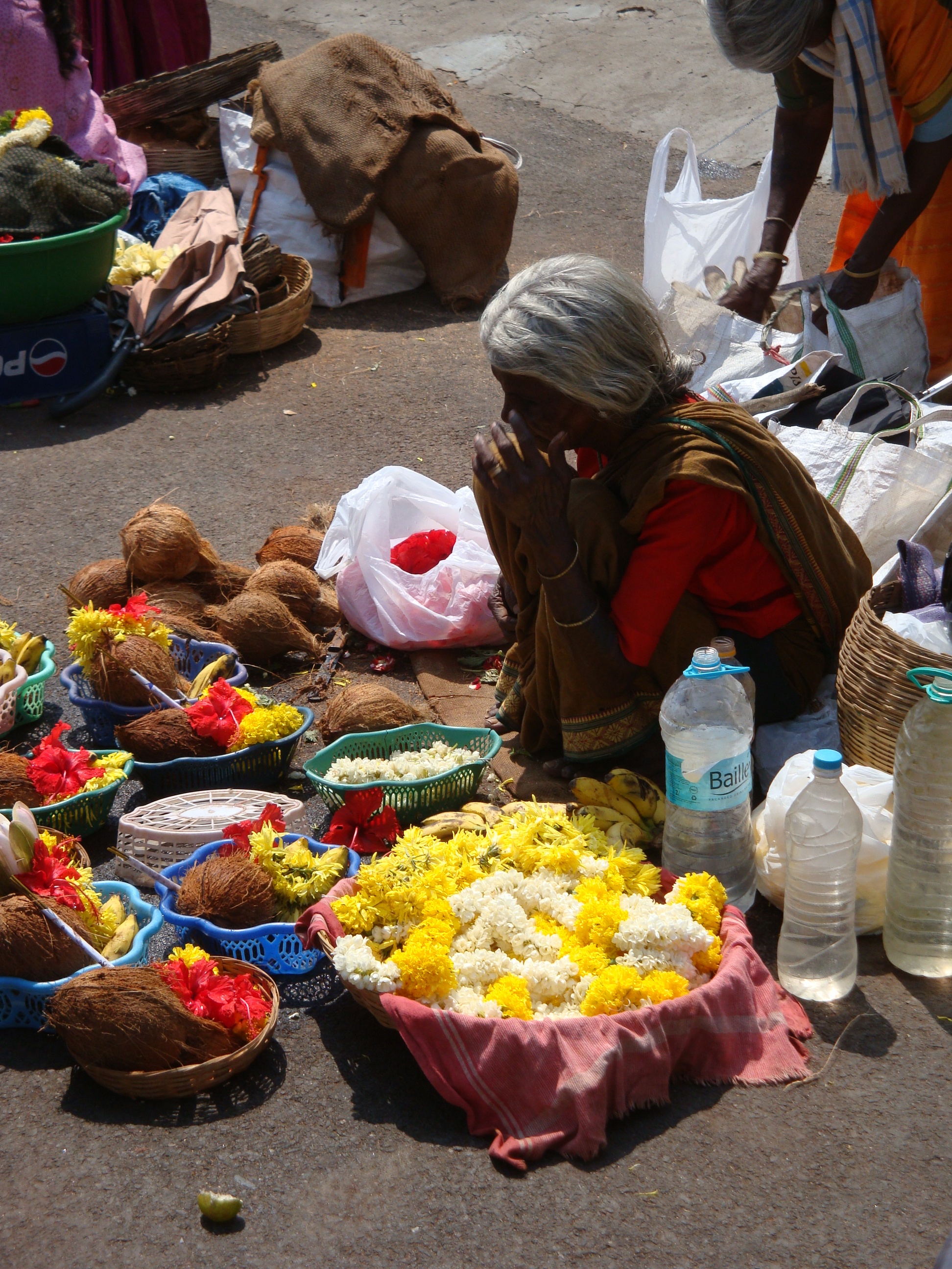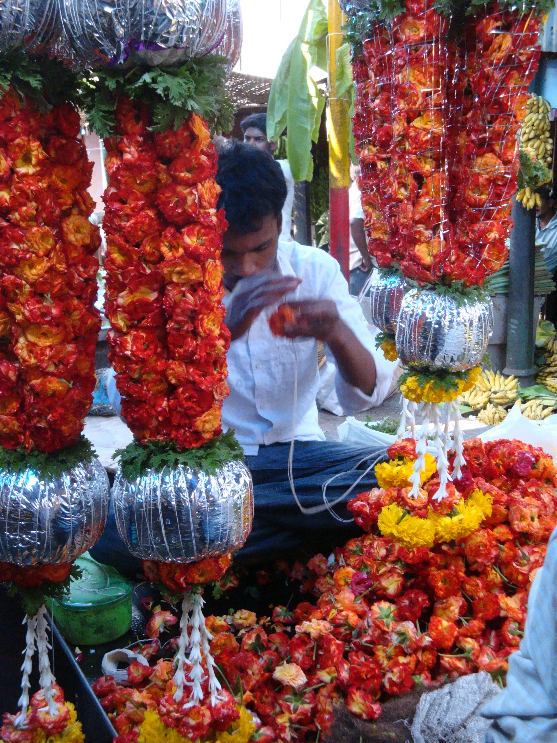 Devaraja Market was a lot livelier. Rows and rows of sacks, overflowing with flowers being made into garlands and screens and necklaces. Mountains of brightly coloured dyes. Enough bananas of every shape and colour. And all sorts of stuff that was unidentifiable, but on sale nonetheless.