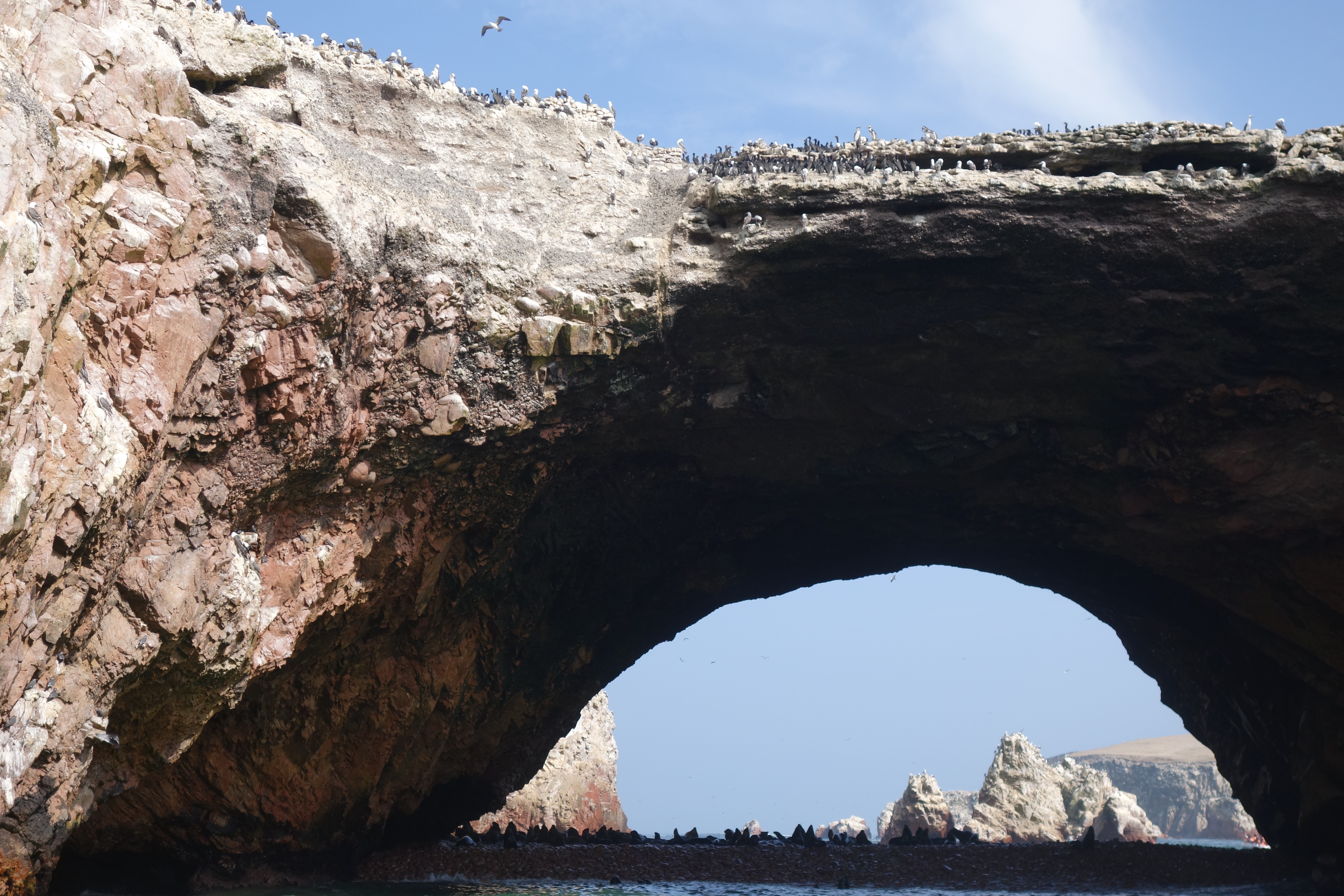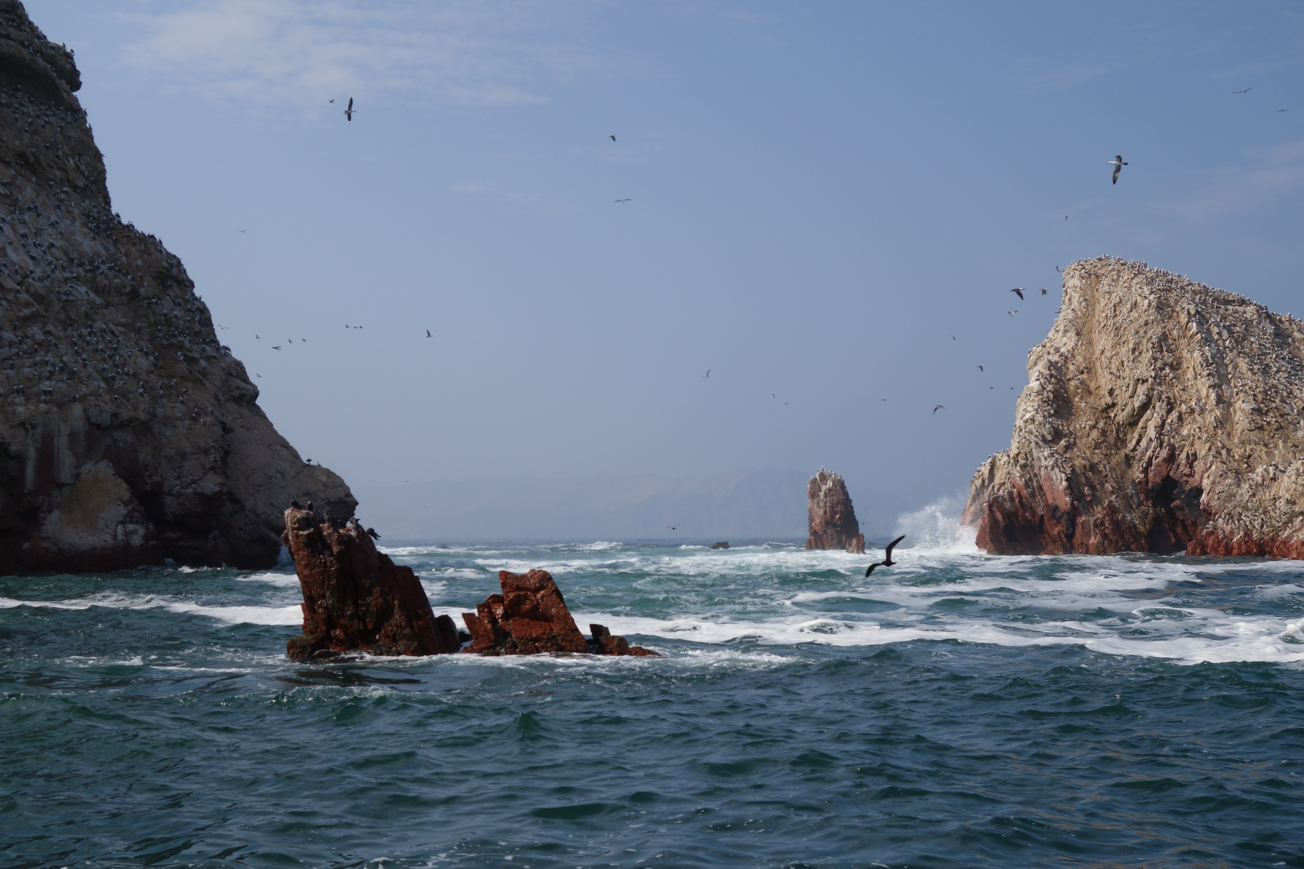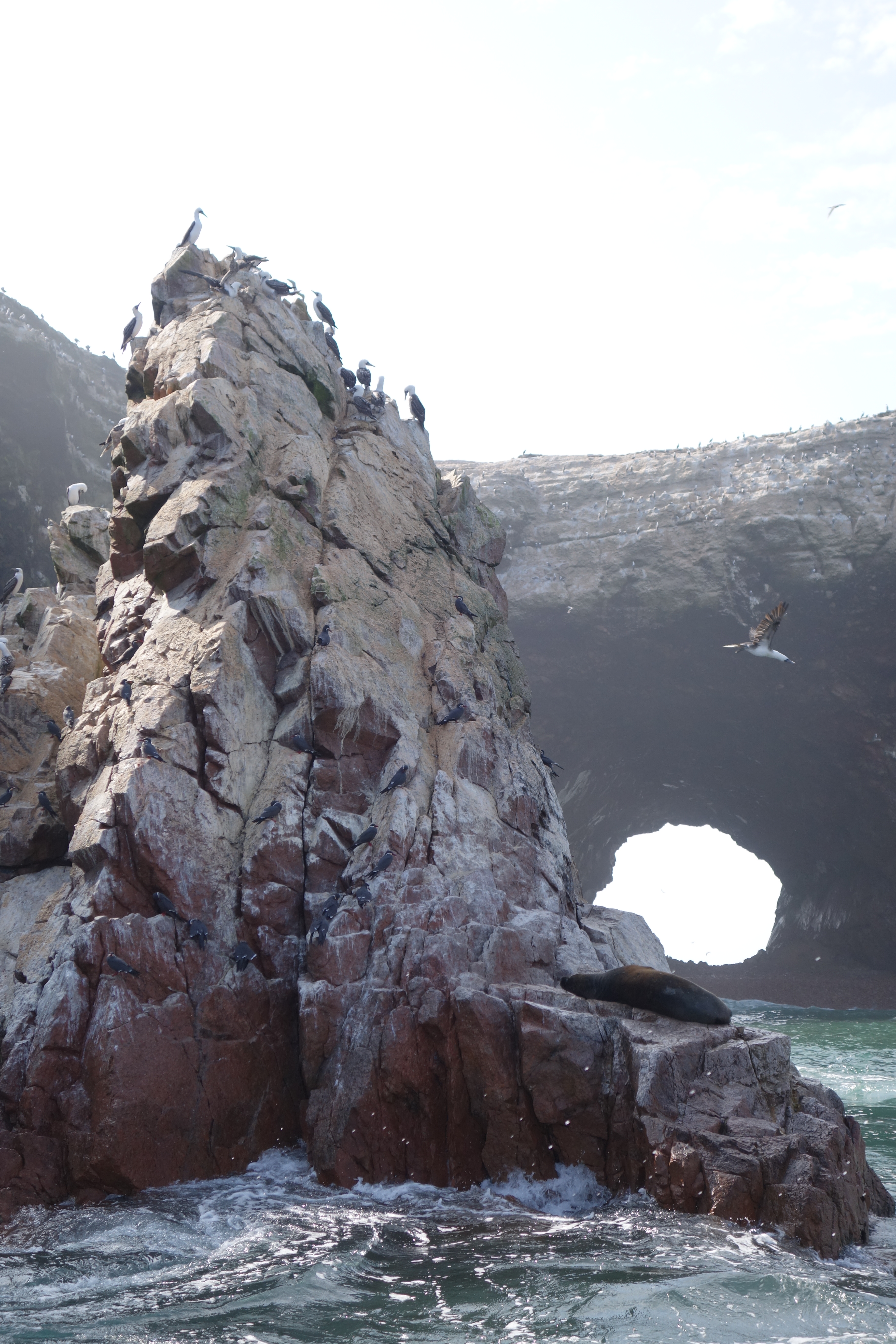 The Islas Ballestas are a bunch of islands several miles off the coast that made Peru the bird poop capital of the World, for a while. Guano. White gold. The Worlds’ first fertiliser boom. Exported to Europe for use in industrialised farming. They are a group of very pretty islands rising up out of the Humboldt Current and surrounded by Anchovies, between which, drops of salt water can be found. Boobies, Pelicans and Penguins swarm over them. Black snowdrifts of Boobies. Thousands and thousands of Boobies. I like saying “Boobies”. Herds of seals cover the shingle beaches, drifts of them roll in and out on the surf, others sun themselves on the rocks. Mothers are in deeper waters teaching pups to swim and hunt. Surf crashes. The noise is incredible. The great mountains of guano have gone, but the birds are doing their best to replace it and the mining stuff is still all there. They now harvest every 3 years.
