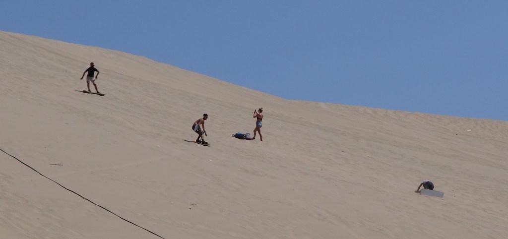 Just outside of Ica, the roads climbs over a ridge and there, sunk down in the middle of enormous dunes, is the oasis of Huacachina. Completely hemmed in by mountains of sand is a small lake fringed with palms. It could be something from Arabian Nights, except there’s no camels. Actually there are not even Lamas which, after all, are Peruvian camels. People are swimming in the lake, but we decide to skip this dubious pleasure. People are attempting to board ride down the dunes, but we skip this too, some sort of rash looks to be the inevitable outcome of either pastime.