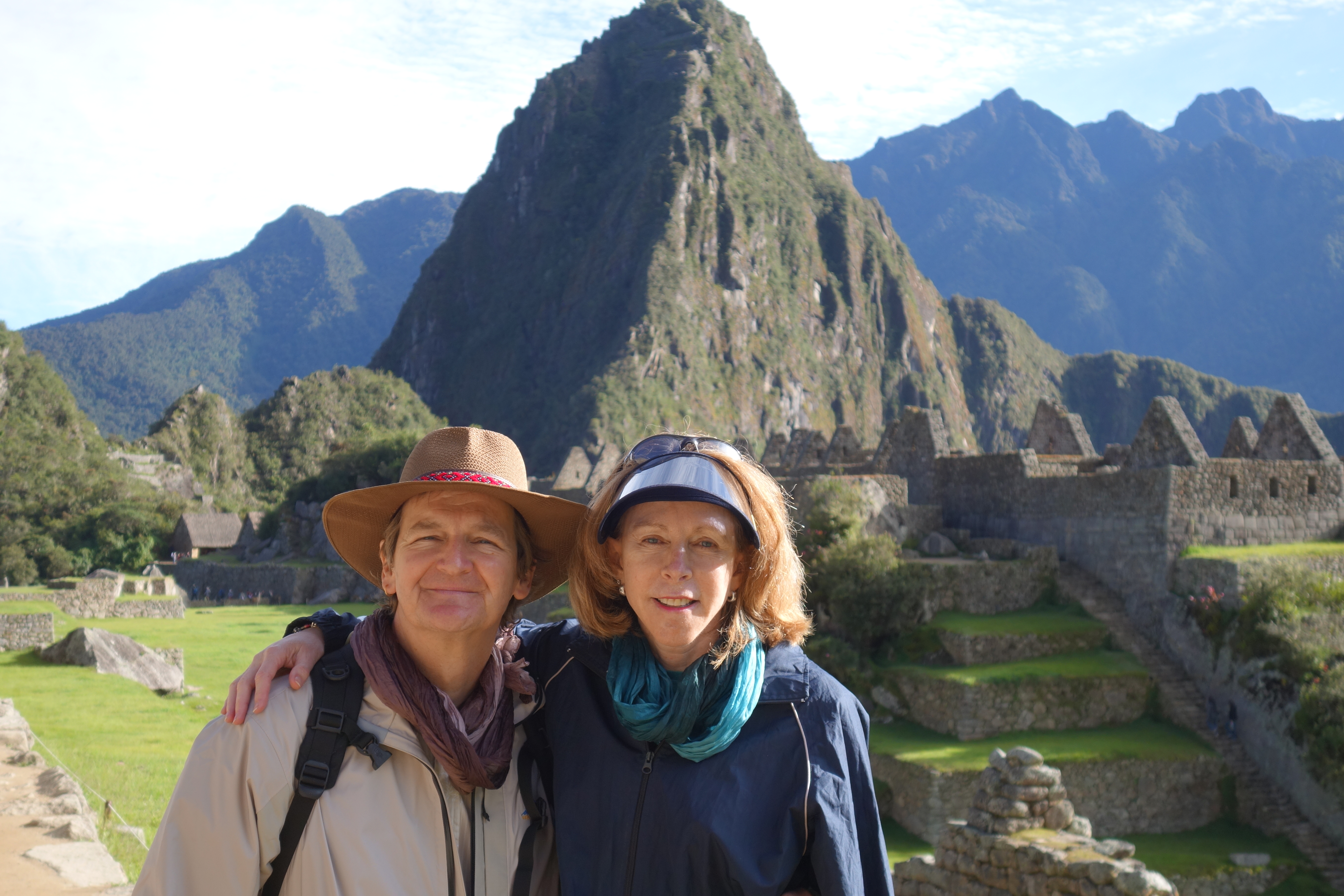 The first platform gives you a fabulous view directly over Machu Pichu, you are almost looking directly down on it, it’s just so vertiginous and difficult to get Liz to pose. Stunning views, including a house perched right on the edge, just beneath our feet. It beggars the question, “Why?” Then the last bit is a real scramble including crawling through a tiny cave, heads, shins and cameras bashing into everything. Up a ladder and voila, or as we say in Peru, “Aqui! Cojones! Estoy hecho polvo!” You balance on a big rock, nervously absorb the 360degree panorama, have your photo taken in Macho Mountaineer pose and then get the f*&#! down as fast as your shaky little legs will let you.