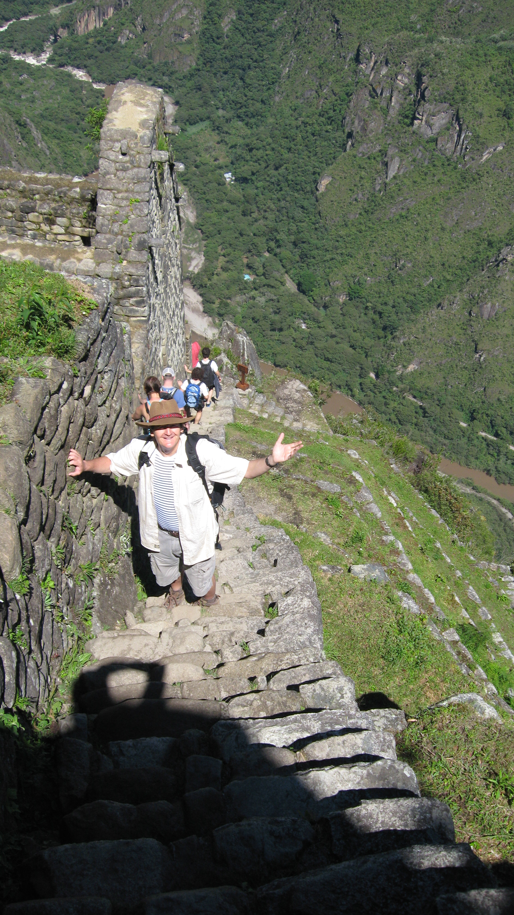 But the views are certainly panoramic, it’s just that I don’t think I saw them until looking at my camera several days later. We rested at another platform, just off the top and then began the descent. The first part of this is a cave bypass that the Incas thoughtfully built on an almost shear face of the mountain, about 30 metres down and a foot wide. That is, assuming you are placing your foot sideways ’cause these babies are only 4 inches deep. At the bottom of this stairway to hell, the mountainside just disappears into oblivion and, for some reason, possibly thinning the herd, this is the point where nobody bothered to put a cable handrail. Still after several minutes, grazed hands and multiple bum stains, we clear this challenge and tumble back down the mountainside. By now, we are Machu Pichooped and grab the first bus down.