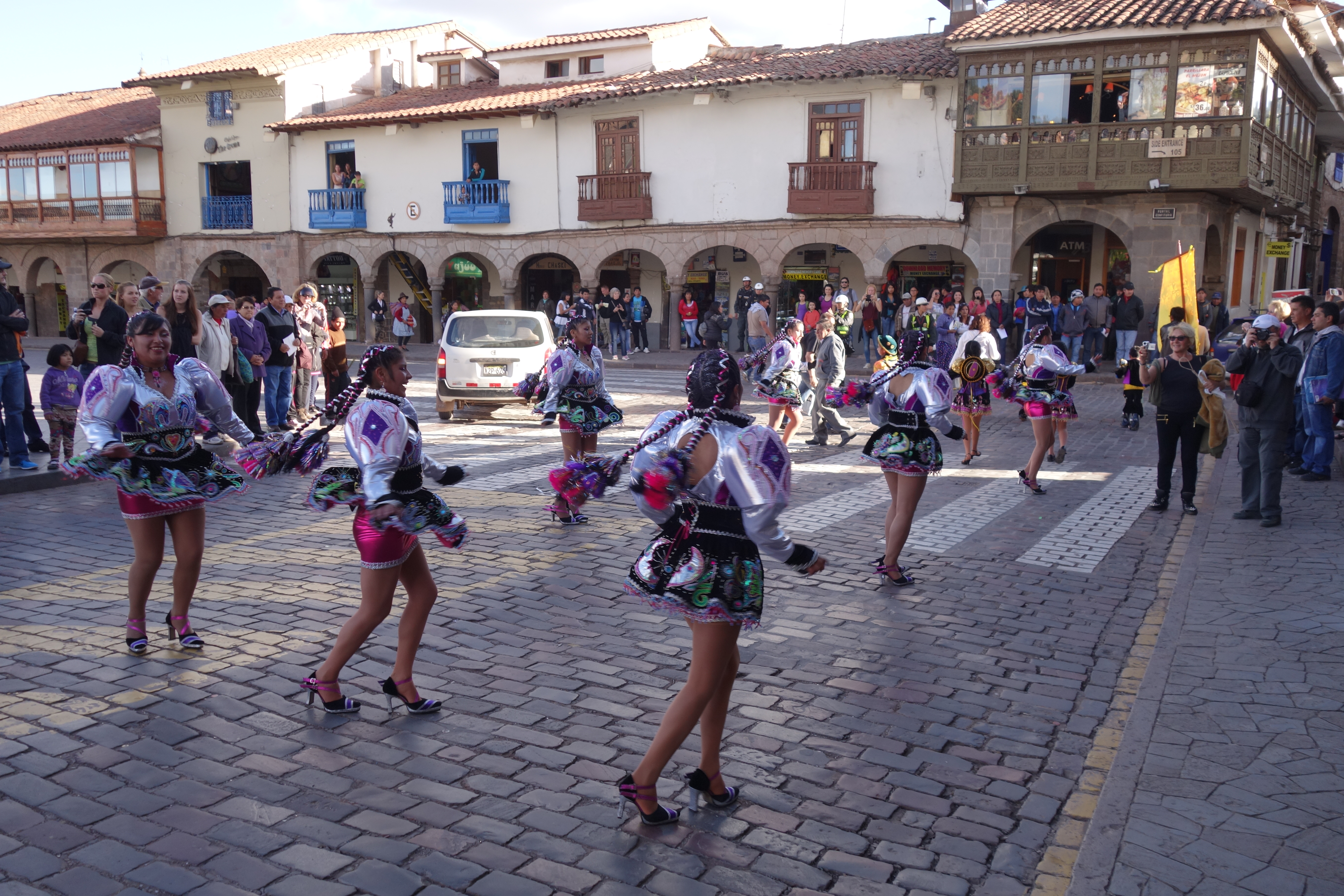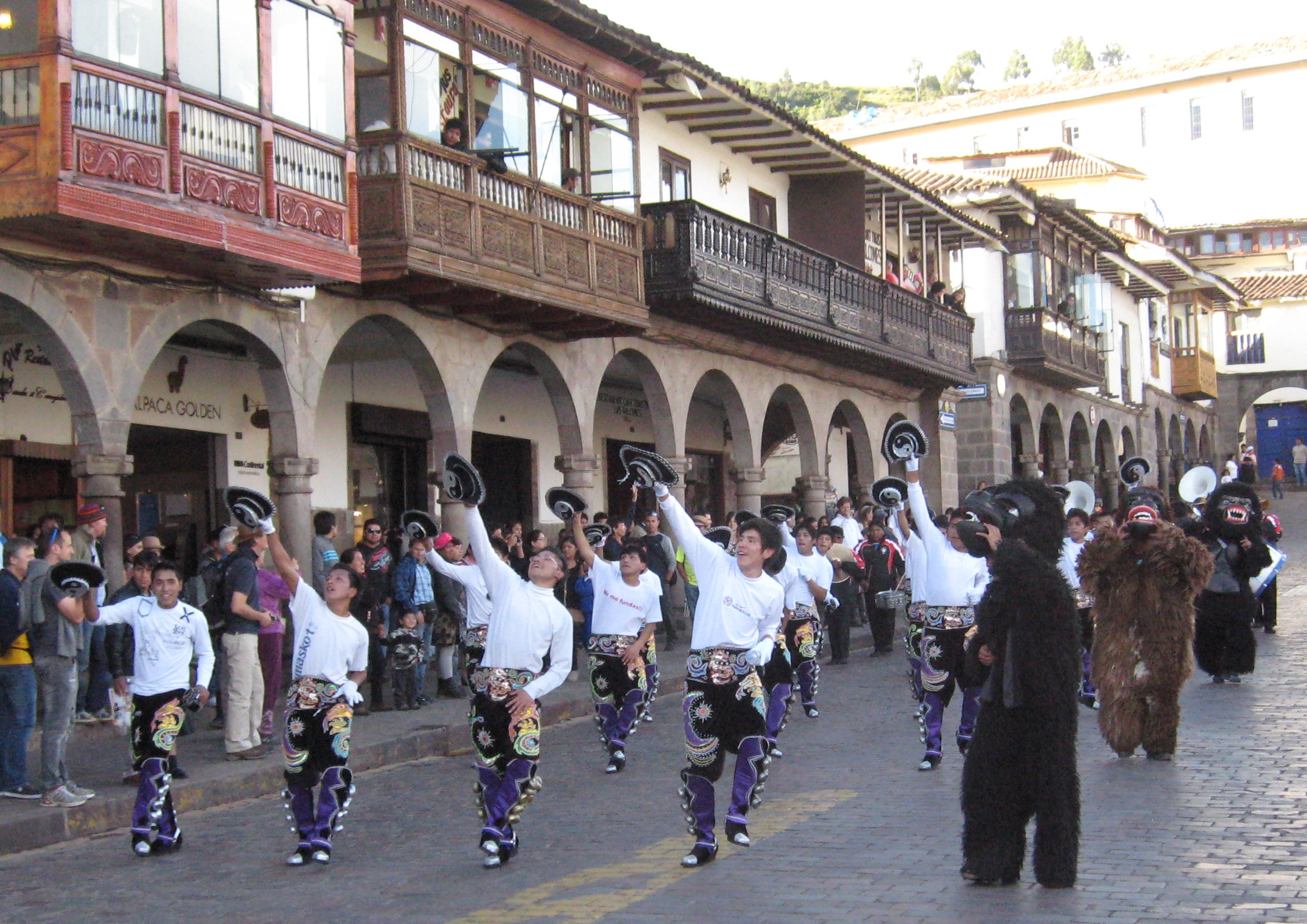 Last full day in Peru and we have no Guide, but Cusco is relatively familiar to us now and anyway, it’s all about shopping. We stroll down to the Artisans’ market. Outside, an old geezer tries to sell me an ammonite, it’s beautiful, jet black, too jet black. With my coca-leaf honed pruning thumbnail, I whittle off the coating to reveal plaster and with an innocent smile he says, “Bueno, voy a ser tío de un mono”, which translates as, “Well, I’ll be a monkeys’ uncle”. But I’m not. So no sale. Inside the market are row after endless row of ear-flappy hats, Lama chompas and stuff. Undaunted, we cruise and still manage to find some unusual and beautiful items. Crossing town again, we find wonderful hand-made and glazed dishes that exhaust our supply of Soles (Peru money), requiring a panicked foray to the nearest cash-point. We find an alley walled with old Inca stones, beautifully placed, including the famous 12 sided stone of Cusco. Lunch, Cusquena, a festival that starts outside the Cathedral with babes in spangly outfits sashaying to an oompah band followed by a troop of guys who are giving it big licks. Imagine Bruce Lee does Hip-hop. Wild. Cusco is great place for ambience and just soaking it all up.