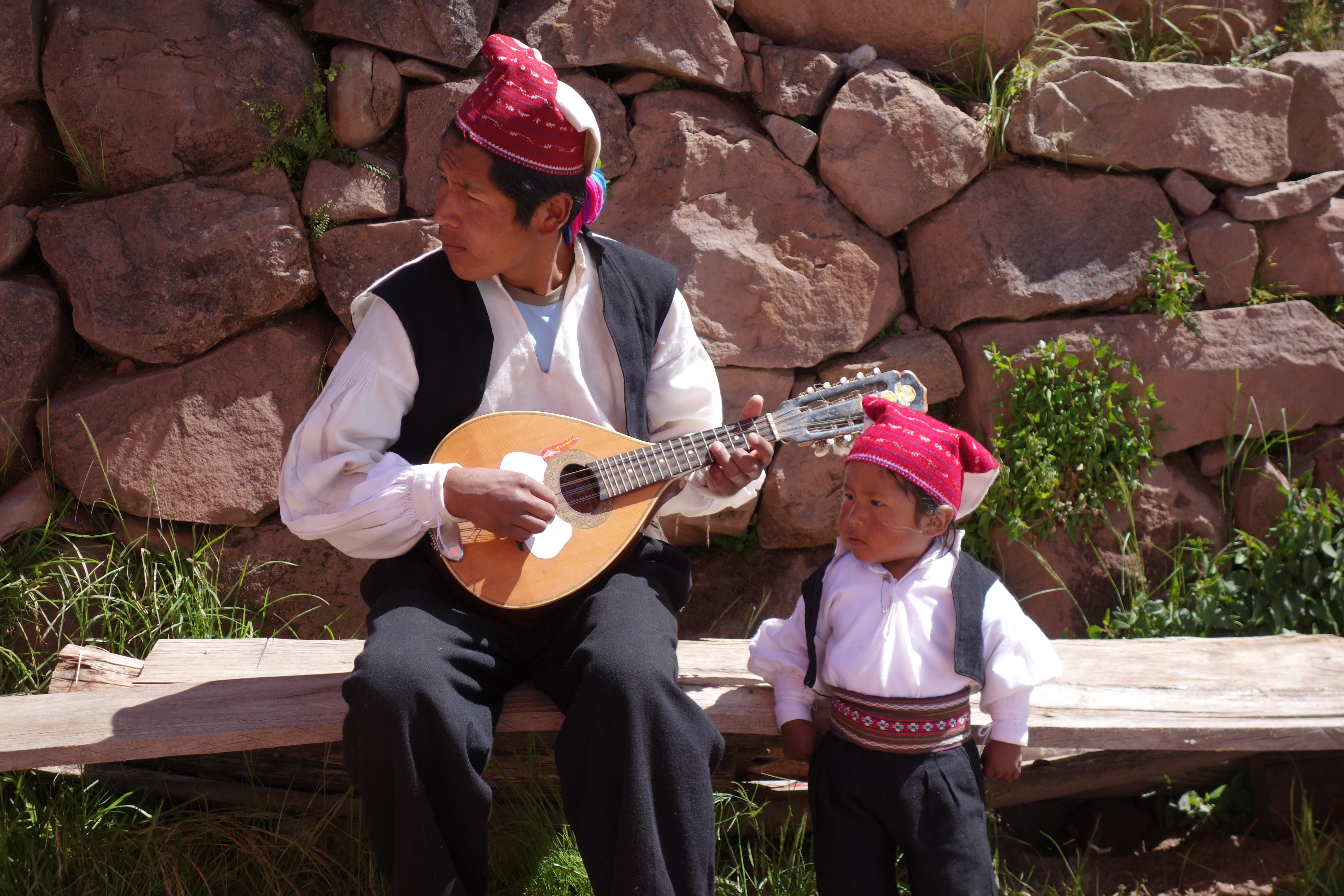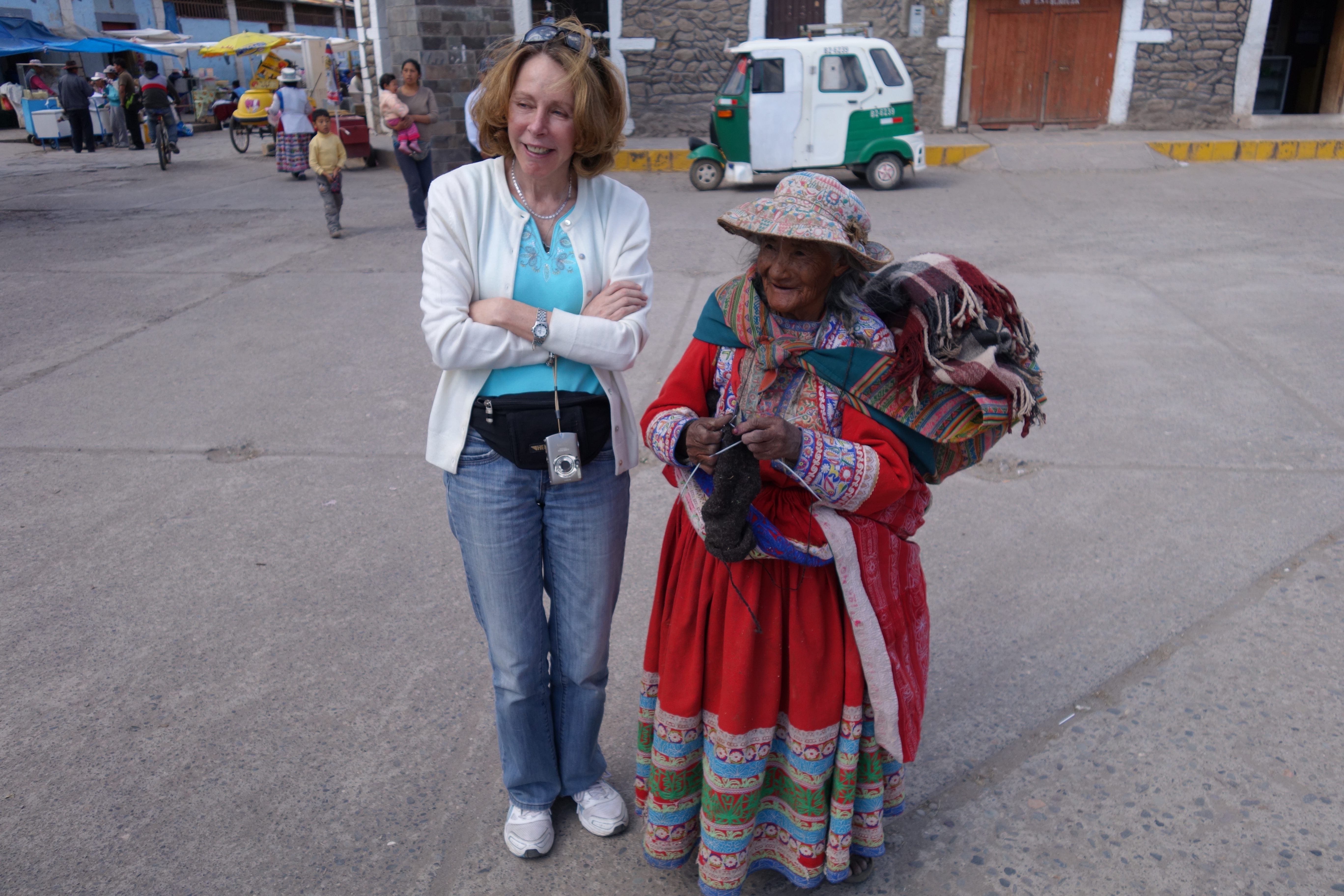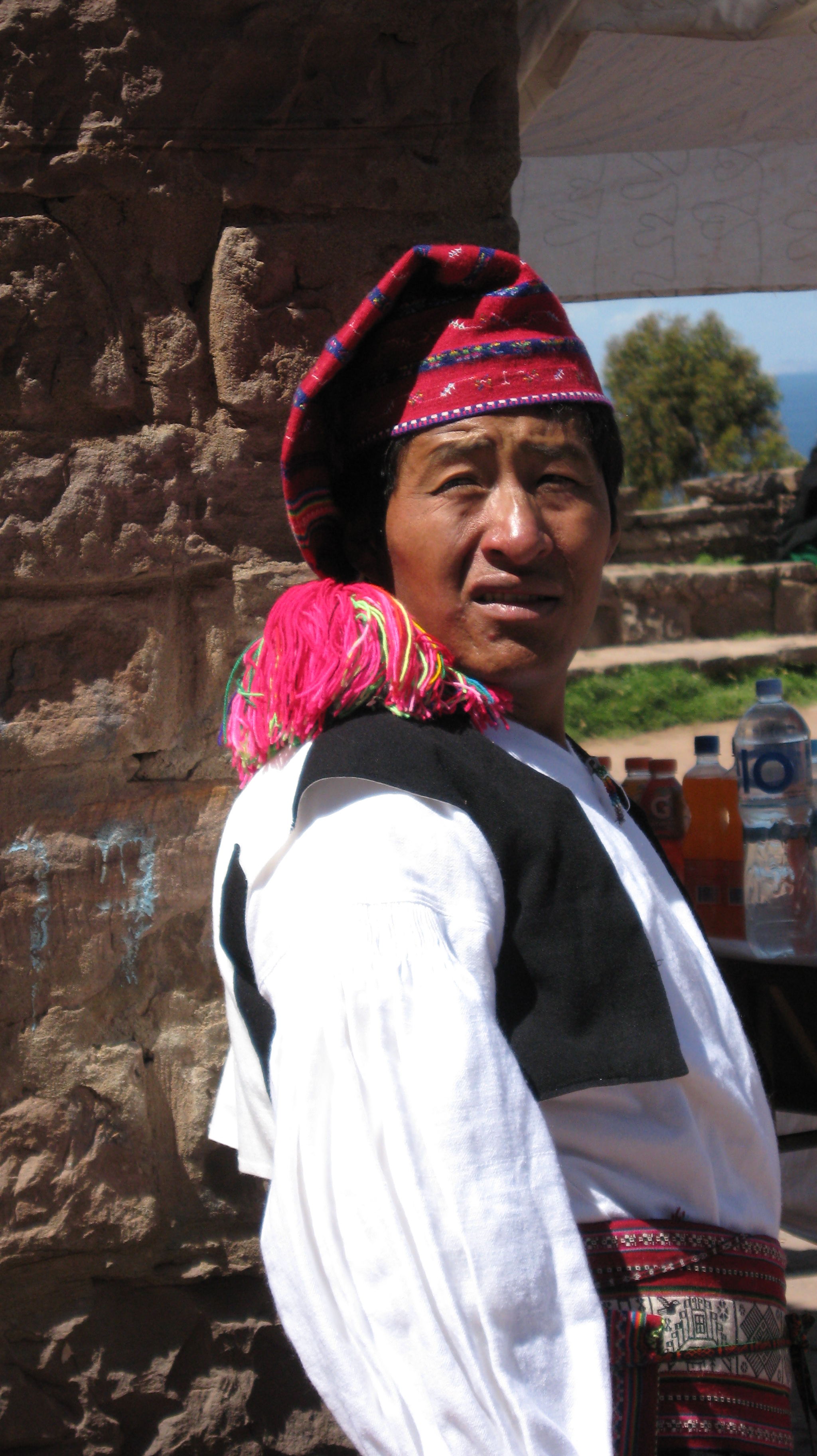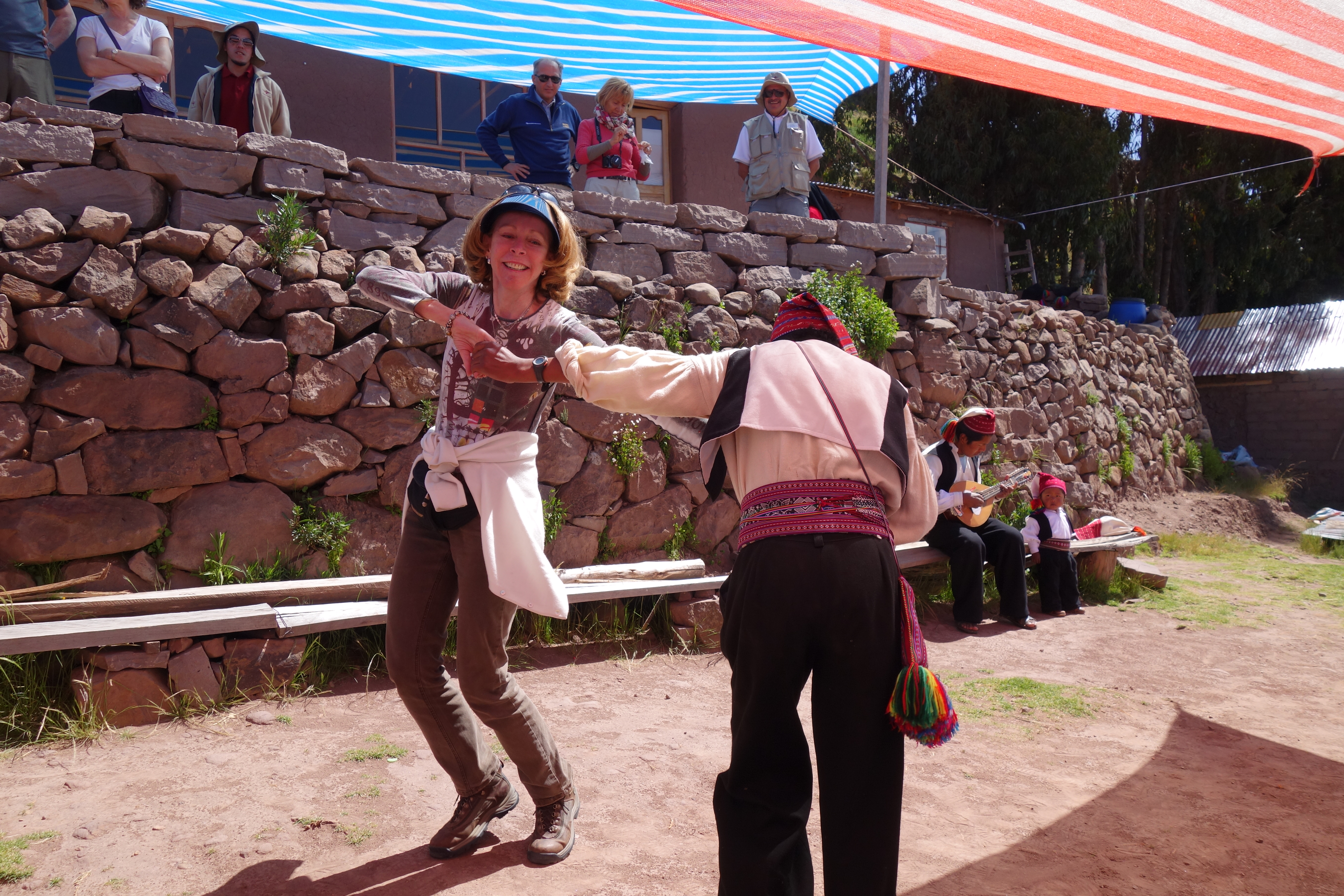 We board our boat again and head off across Titicaca to Isla Taquile where we hike up to the top of the island and into the town square. All the guys here wear black trousers and waistcoats, white shirts and funky knitted caps and belts. They knit their own hats. Evidently top stud on the island is the best knitter. Mmmmm. Kinda backwards to our way of thinking and possibly the cause of a declining population. Lunch is served in some knitters garden, where we sit looking out over the blueness of the lake, cotton wool clouds rolling by, wild flowers everywhere and birds singing in the trees. The family turn out and we have singing and dancing, the music is great. Fortunately, they pick Dori for the dancing, at this altitude she is the only one with enough puff. With the music, costumes and scenery you could easily be in the Mediterranean, except for the fact that the coastline on the horizon is Bolivia. Lunch follows dancing with a wonderful vegetable soup followed by Titicaca trout. One of the best fish I have ever eaten, fabulous. Afterwards we stroll across the island listening to the birds and photographing the flowers, it’s pretty idyllic. Then the boat takes us back to Puno.