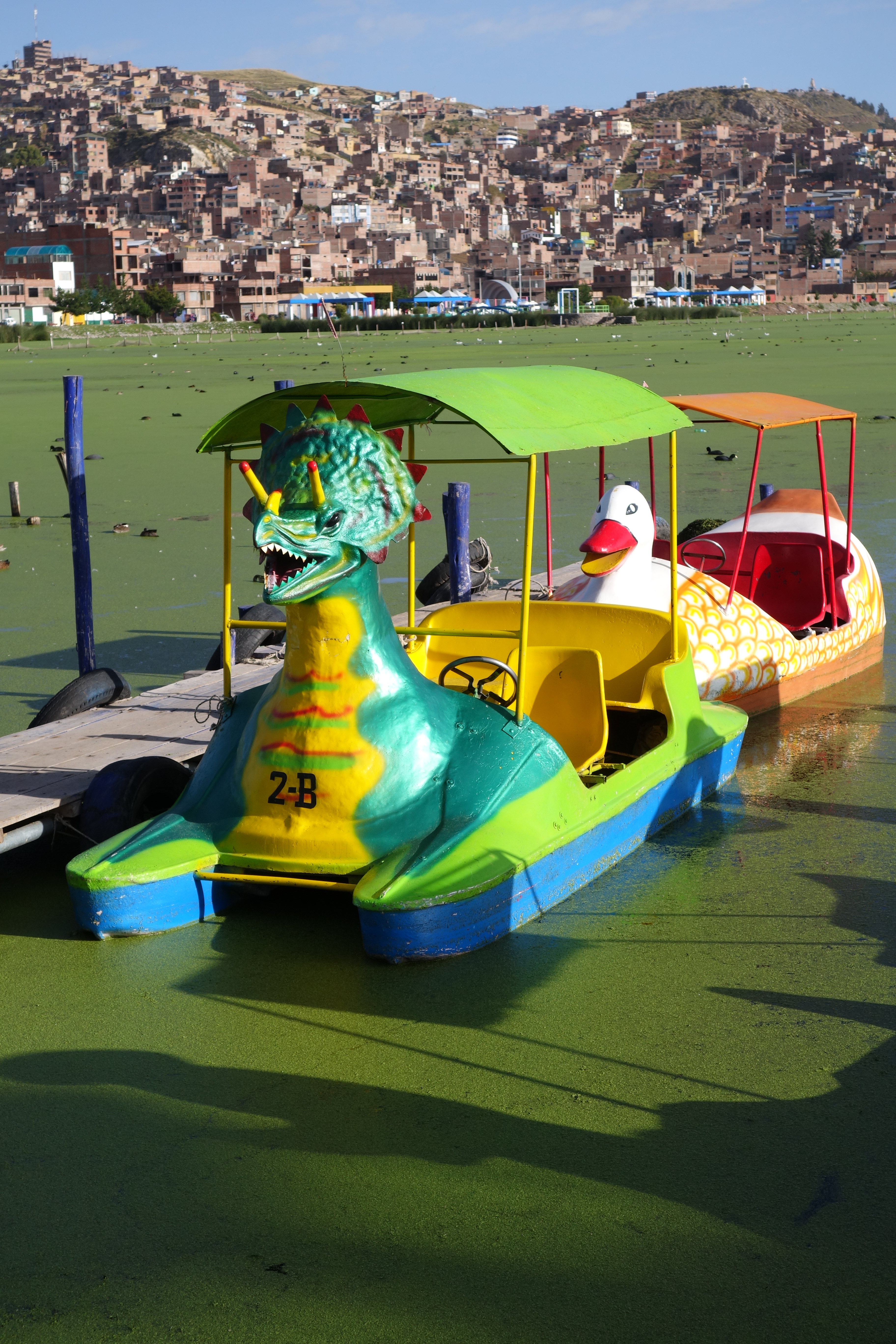 The sun is shining and Titicaca looks a bit more inviting. We head through derelict streets to the port. Abandoned pedalos decorated as Peruvian Mickey and Donald bump into Peruvian Godzilla on a puddle of stagnant milkweed. It’s not glamorous. We find our boat and sail away. Within minutes we have left the cabin and stretched out up on the roof as we sail through a sea of reeds that perform a hula dance in our wake. Soon the water is cleaner, reeds greener, sky bluer, this is more like it.