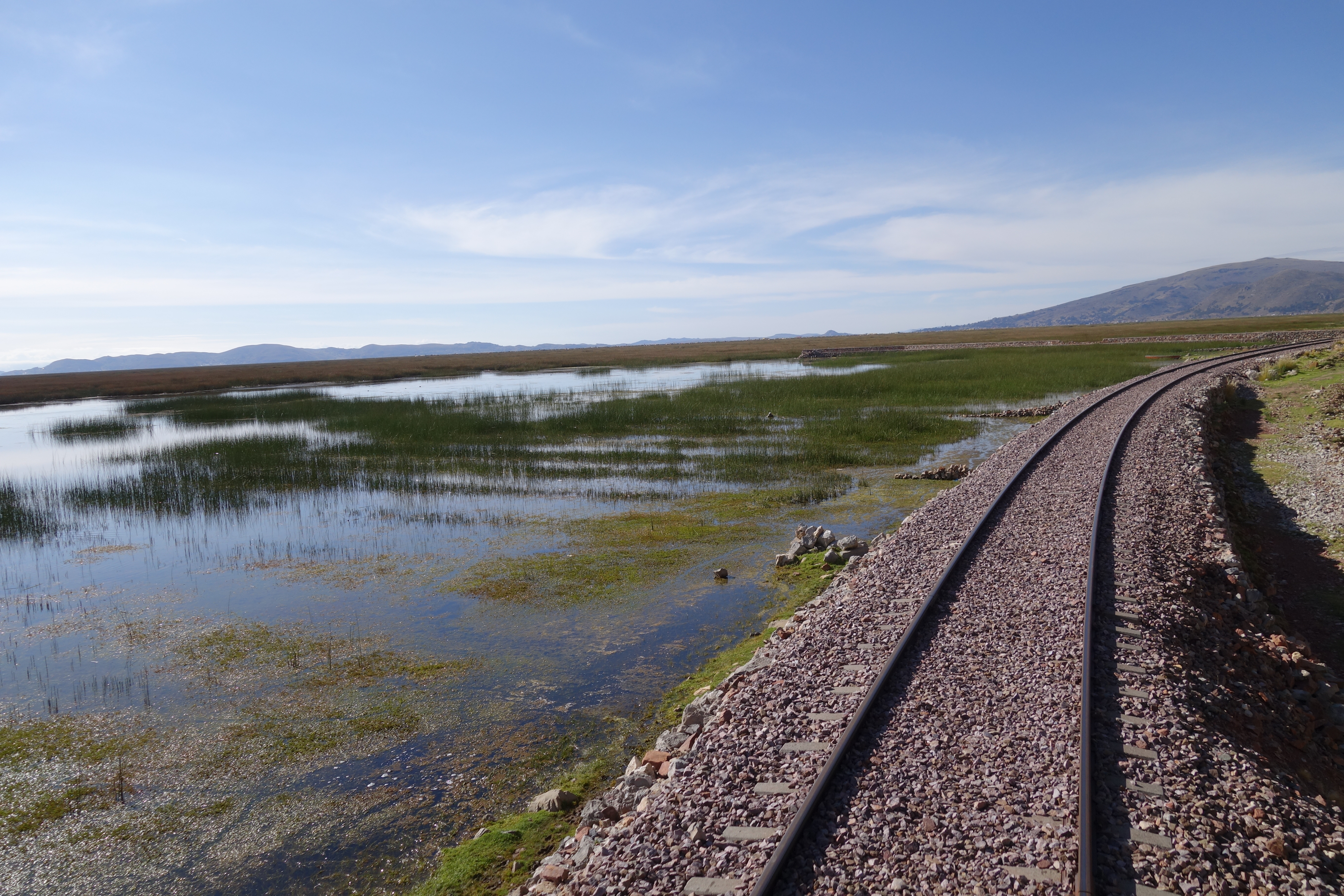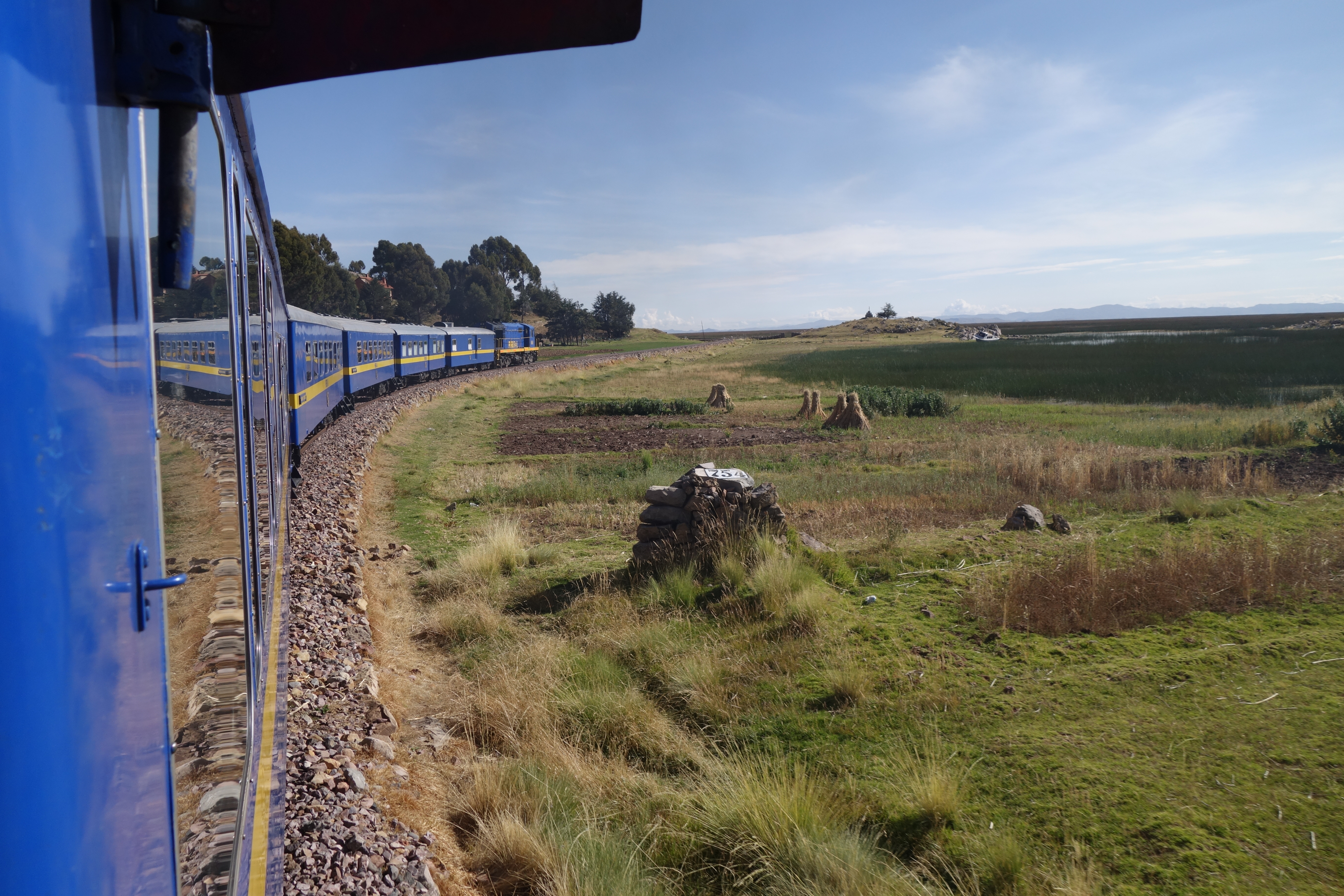 We rise at dawn and head to the train station. PeruRail has had some pretty bad press in the past, but now it seems very efficient. We board the Andean Explorer, which is locally referred to as the Gringo Express. The only thing Express is the nickname. We are welcomed by our waitress, Elisabet, and guided to our big armchairs surrounding the linen covered table and she immediately takes our order for Lunch. At the back of the train is a bar and observation carriage with an open balcony hanging over the rails and as the train pulls out, I head back there. At first it’s just the scummy outskirts of Puno, but then we pull alongside the lake and into green country, it’s fabulous. The early morning sun over the lake and reeds and distant mountains as the track spools out behind us.