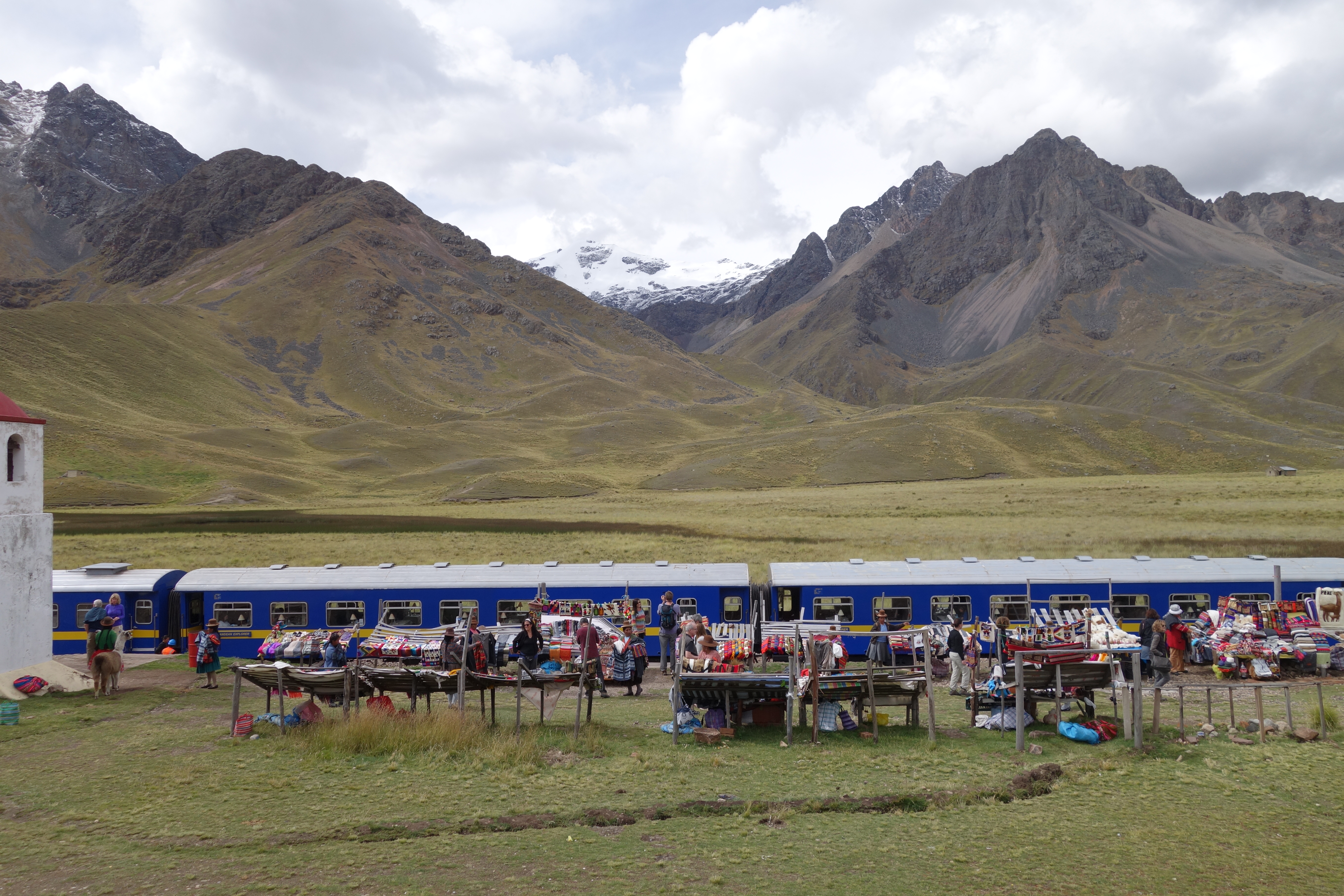 Back to our table for a cold beer, excellent lunch, delightful wine, followed by siesta. We stop to let the uphill train go past and then pull up at the highest point of the trip. There is a small church and a market, naturally. Surrounded only by mountains and sky and the odd lonely lama off in the distance, our little train is hemmed in with chompas, ponchos and ear-flappy hats. Our band has switched places with the guys on the uphill train and so, as we commence our descent to Cusco, we are invited back into the bar for more festivities and a fashion show, but a man can only roll with the ponchos for so long and we skip it. The downhill valley is more crowded and we pass through several small towns where the rail tracks are considered to be the market place. Buildings and lean-to’s brush the carriages, the horn blasts continually as stallholders clear their stuff out of our way and then immediately flow back in behind us. After 20 metres you can’t see the tracks and wouldn’t know a train had just passed through. Some resent the Gringo Express, it doesn’t stop, so they can’t sell us anything. We are just a camera clicking annoyance. Most people smile tolerantly but one sweet little old lady makes an obscene, throat slitting gesture at the gawking tourists drinking their wine.