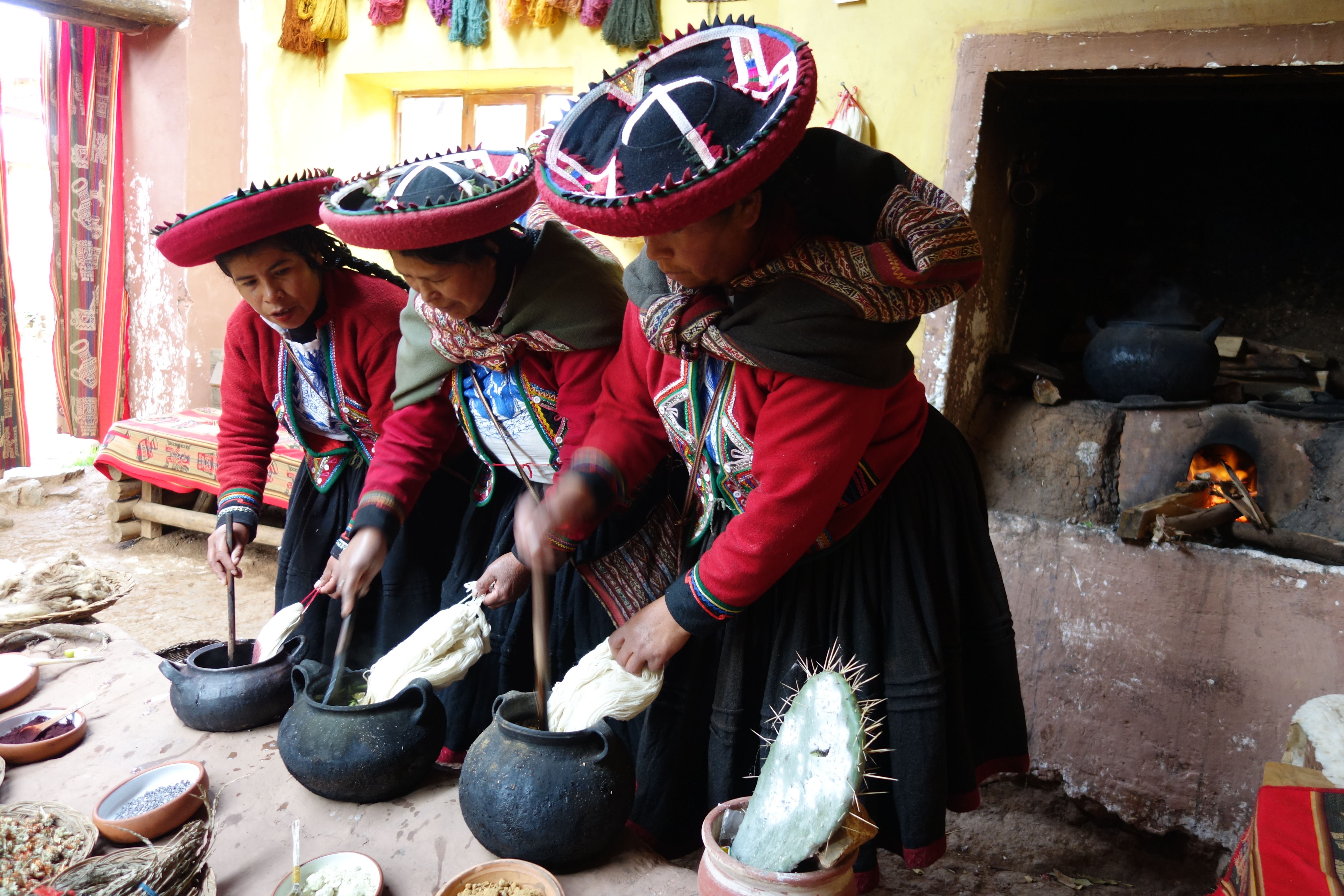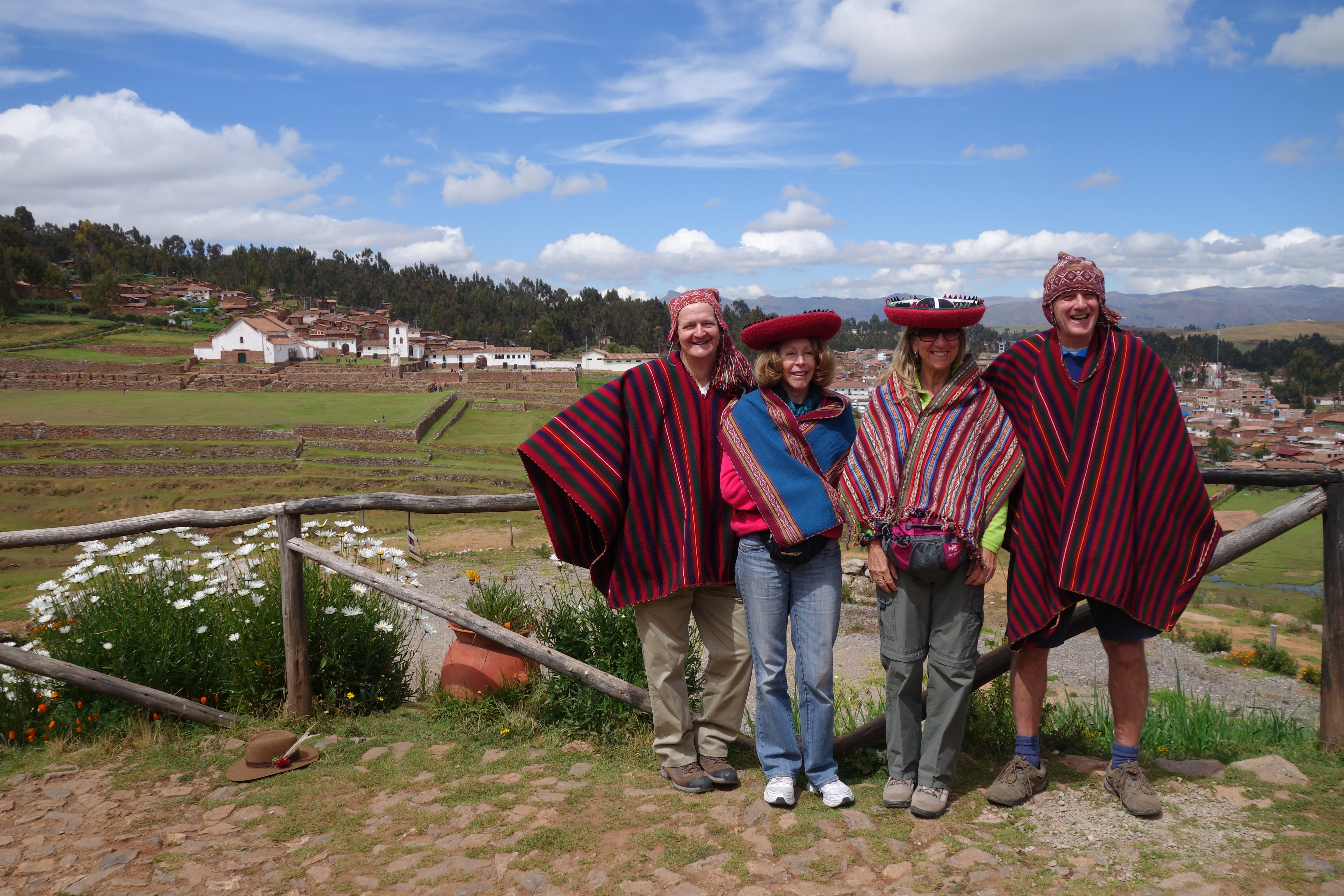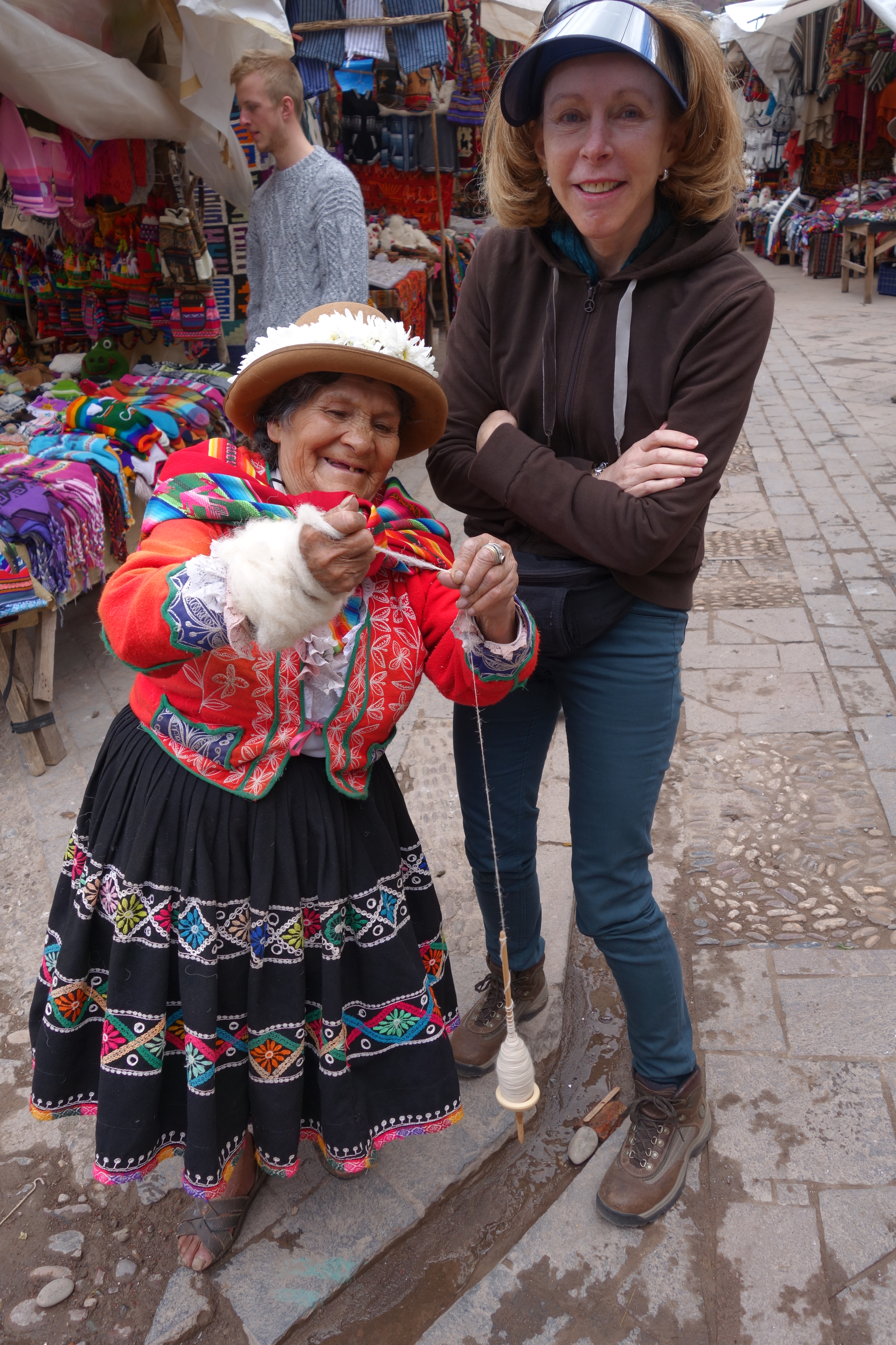 We move on, to the outside of the village where there are huge Inca terraces and a Spanish church built over them. Chinchero is famous for weaving, so we stop at a small hacienda surrounded by flowers, where local ladies give a fascinating lecture on the washing, dying, spinning and weaving using all natural ingredients, including a mountain root that is grated to provide soap. Sort of a ‘Soap-on-a-Root’. No bull though, it really was fascinating and when our Instructress pulled 2 Cochineal parasite mites out of an infected cactus and smeared the red over her lips, you had to be impressed. Revlon Red No. Bug. She also had a pretty good line of banter. “What’s this?” She asked, holding up a bone they use for a shuttle. “Human thigh bone!” Says I. “Yes! She replies “And if you don’t buy anything after this, then it will be Tourist sacrifice day!” Ha.ha. But she said it with a glint in her eye, so we bought and then posed for stupid gringo photos in ponchos and ear-flappy hats.