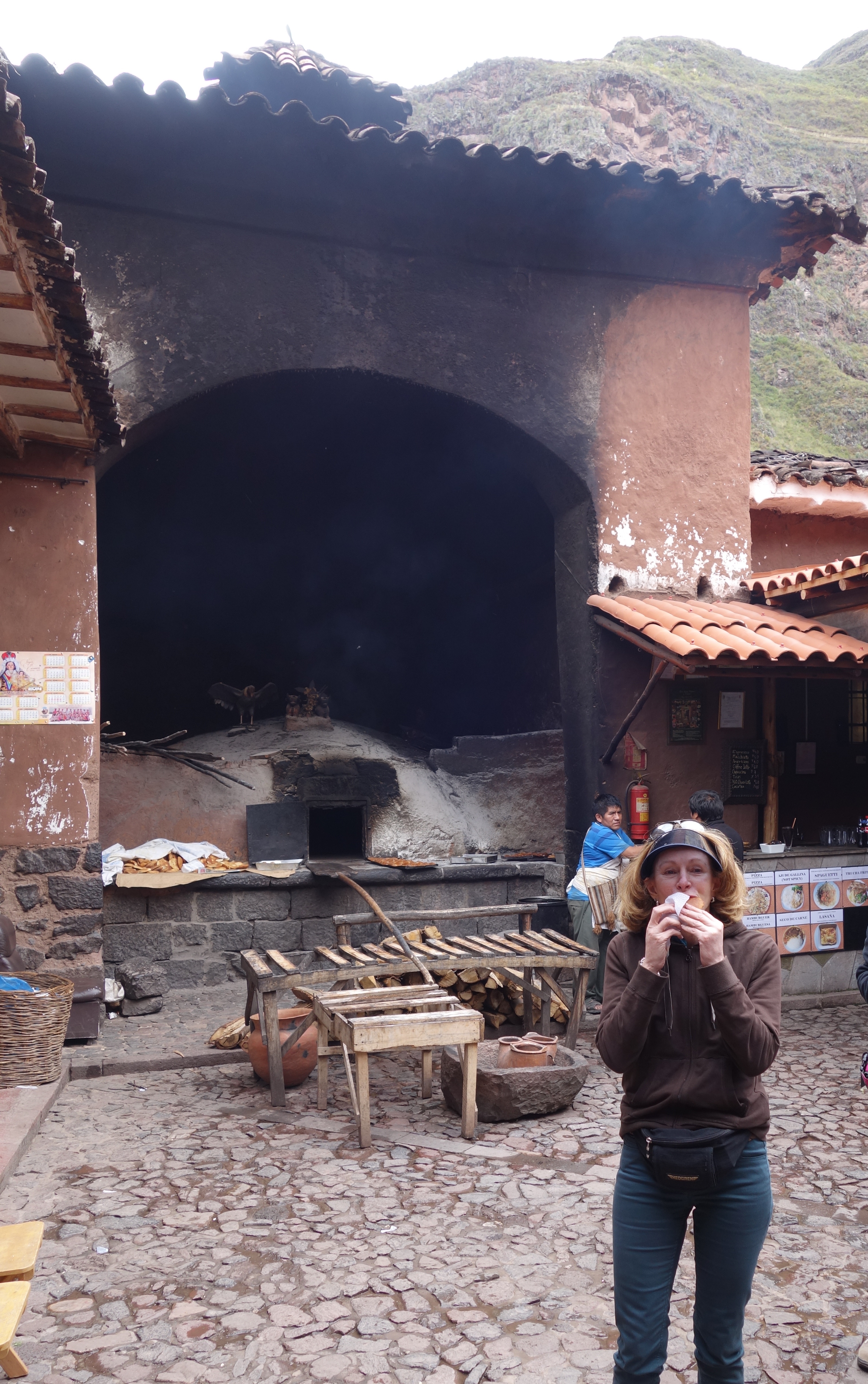 We drive over to the Sacred Valley of the Urubamba river, heartland of the Inca. It is much warmer than in Cusco. Visit the Inti Watana ruins above Pisac, a huge fortress, temple complex guarding the entrance to the valley and the route from the highlands to the jungle. It rains as Viracocha, the Father God of the Inca, is crying. The girls scurry for cover but Jon and I are clambering about like schoolboys. Down into Pisac town to visit the market. This is strictly for tourists, but definitely has the best stuff we have seen. There is a huge and I mean huge, brick bakers oven making delicious empanadas. We scurry round the market as the girls scream, not enough time, not enough time!
