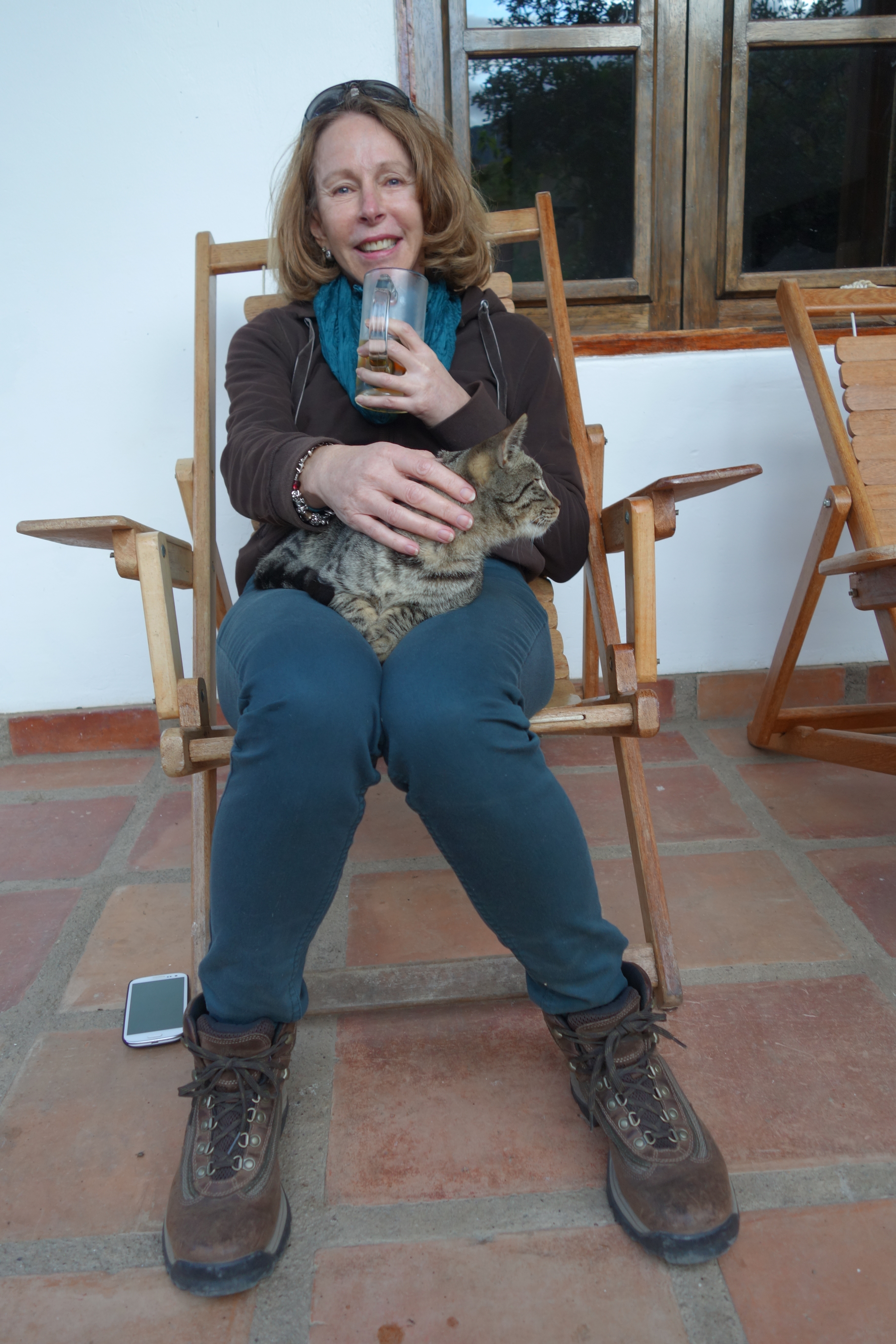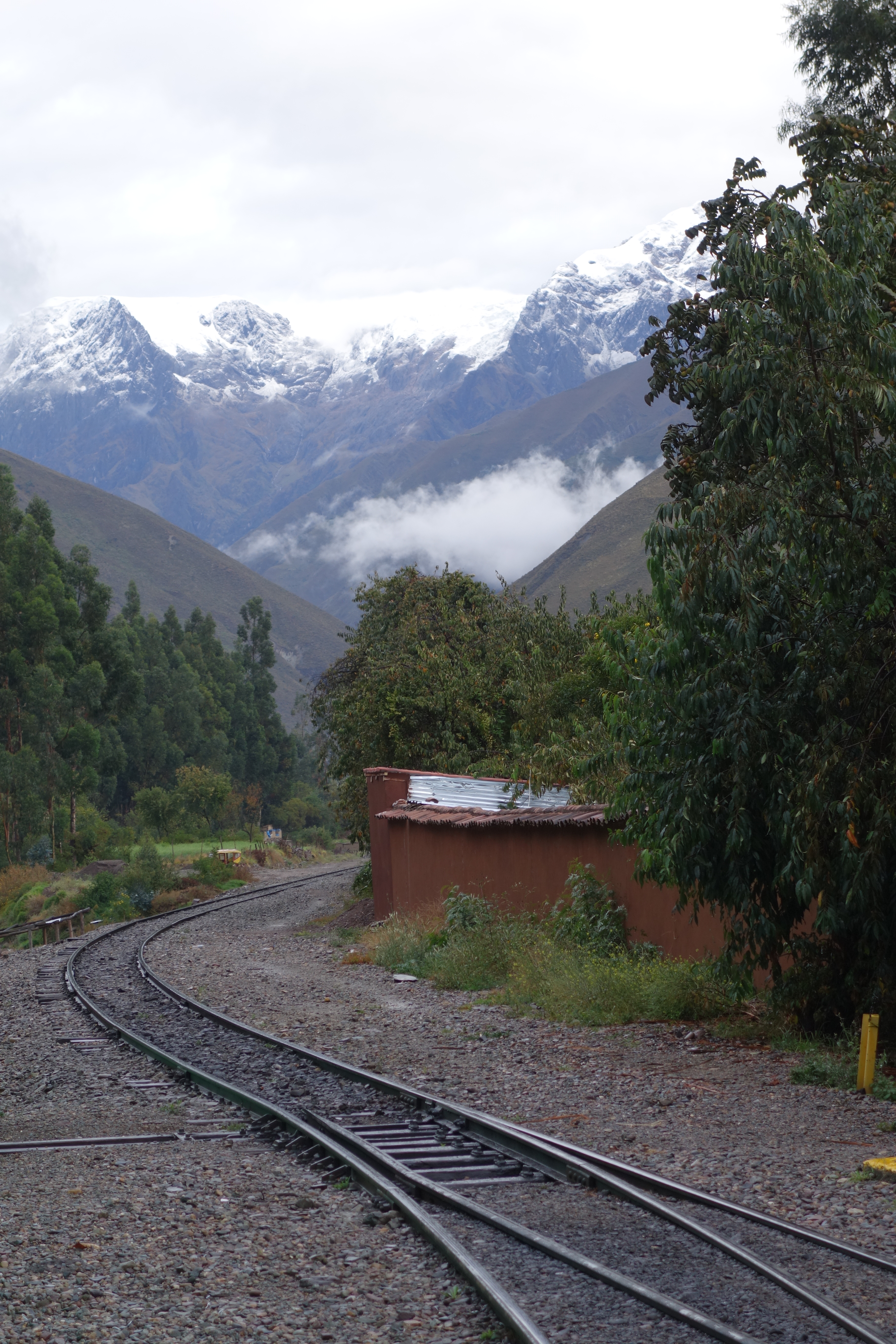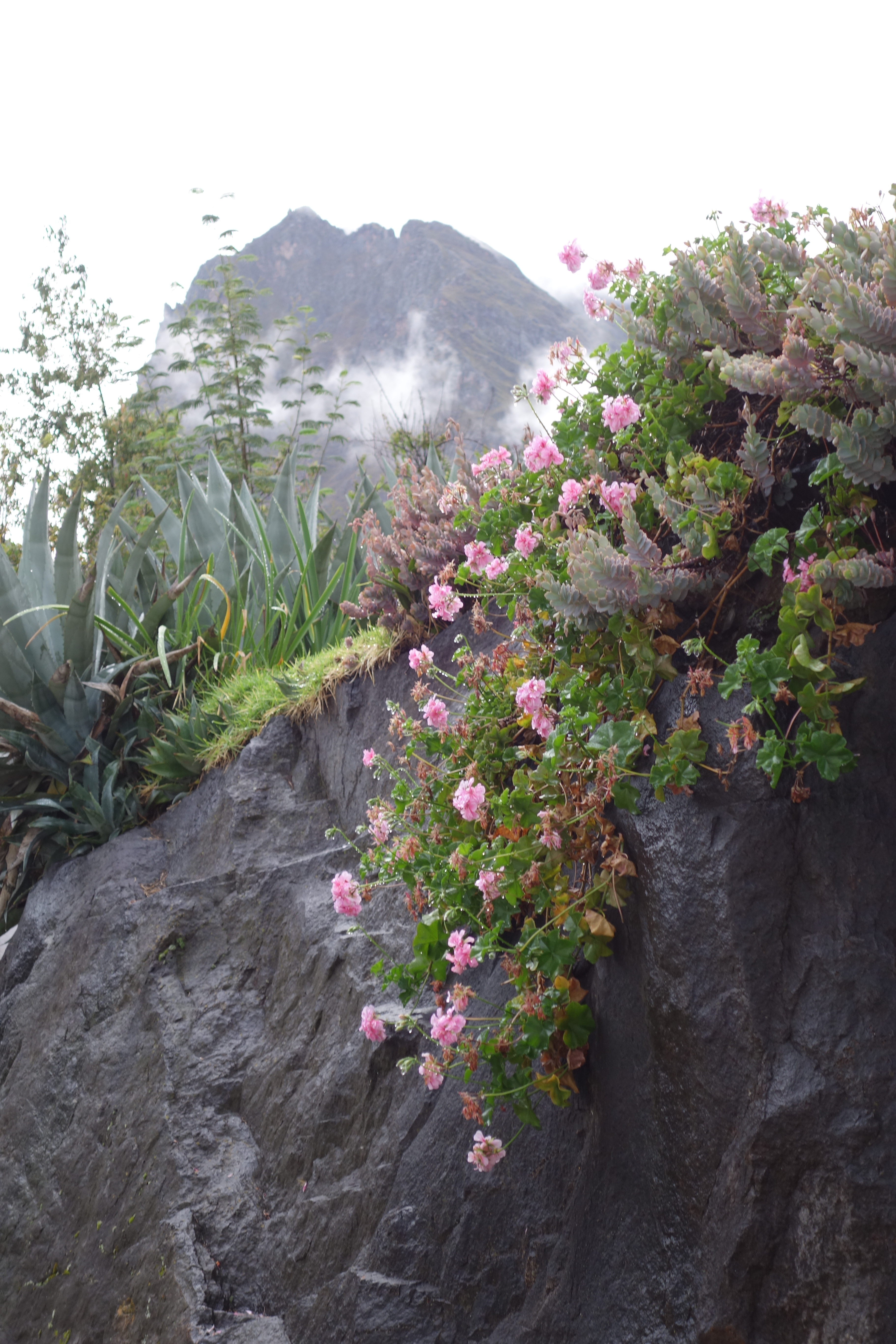 We arrive in Ollantaytambo town and wonder where all the crowds went. Actually, they were the only crowds we encountered on the whole trip, apart from Good Friday in Lima. Our Hotel is right by the Train Station to Aguas Calientes. Actually our hotel is the Train Station, it’s called the El Albergue and the front door is directly off the platform. Our rooms are set back from the tracks in a walled garden full of tropical flowers and scents, snow capped peaks peek through the clouds. A cold Cusquena is called for and quaffed on our verandah while the station pussy cat adopts Dori.