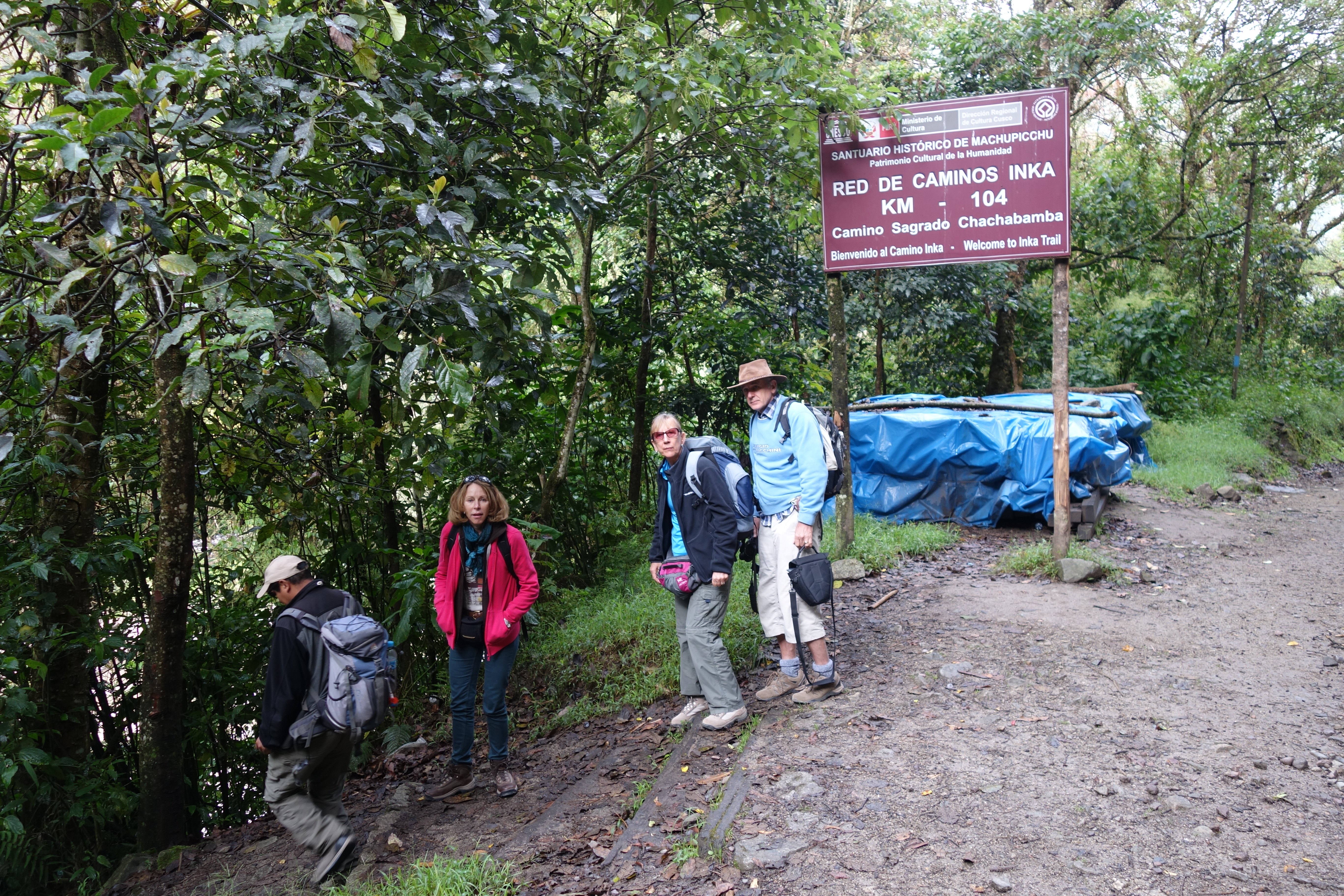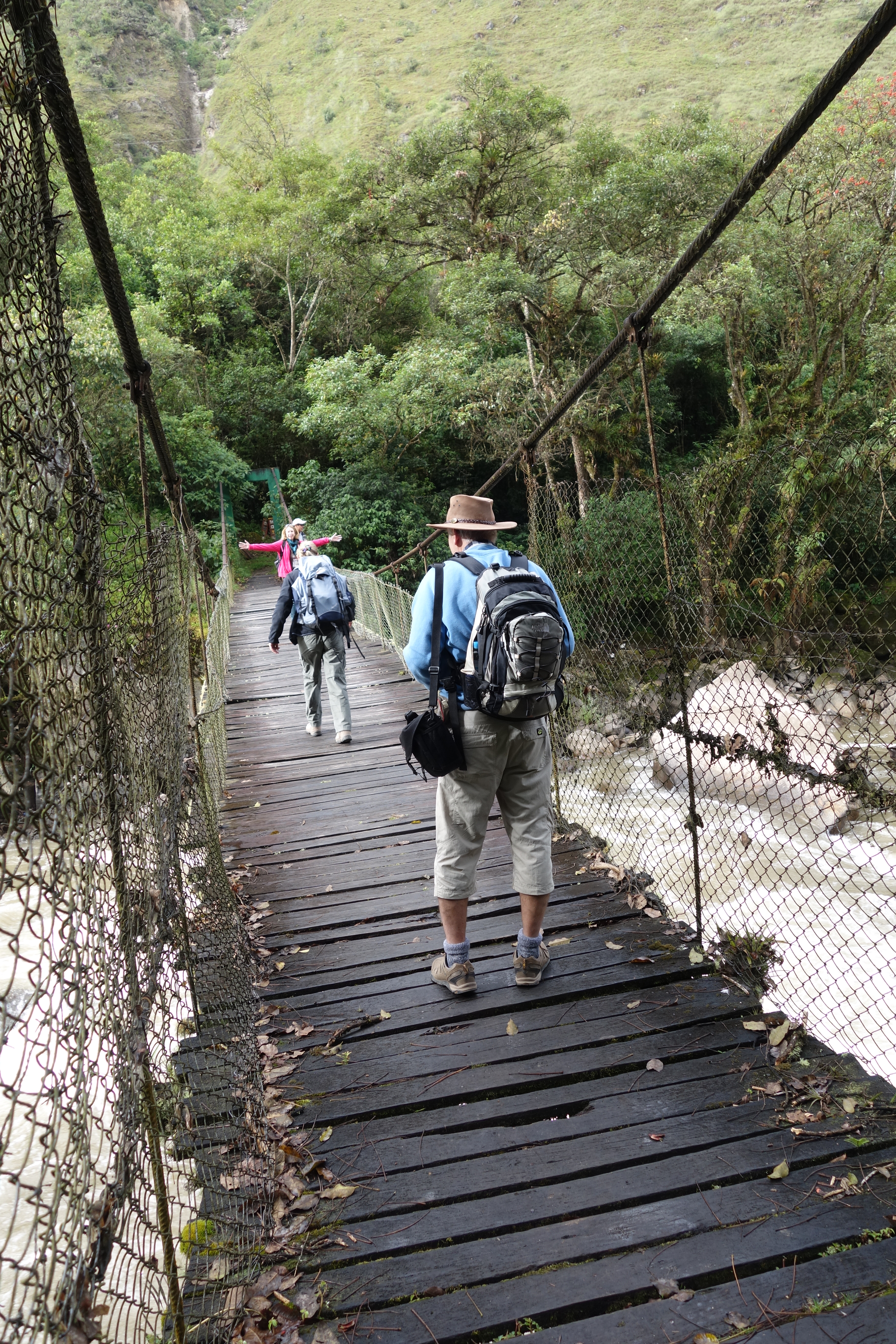 Another day, another dawn, but at least we don’t have far to stumble onto the train. Machu Pichu! The excitement is palpable. The train pulls down the valley that soon becomes a gorge and then the train stops, in the middle of nowhere. Kilometre 104 is all it says. There is no station, just a patch of dirt and a rope bridge over a raging river. “Okay”, says Daniel. “This is us” and we climb down onto the patch of dirt and watch as our train rounds a bend and disappears. Passengers waving from air-conditioned comfort. “Byeee! Good luck!” Gone….