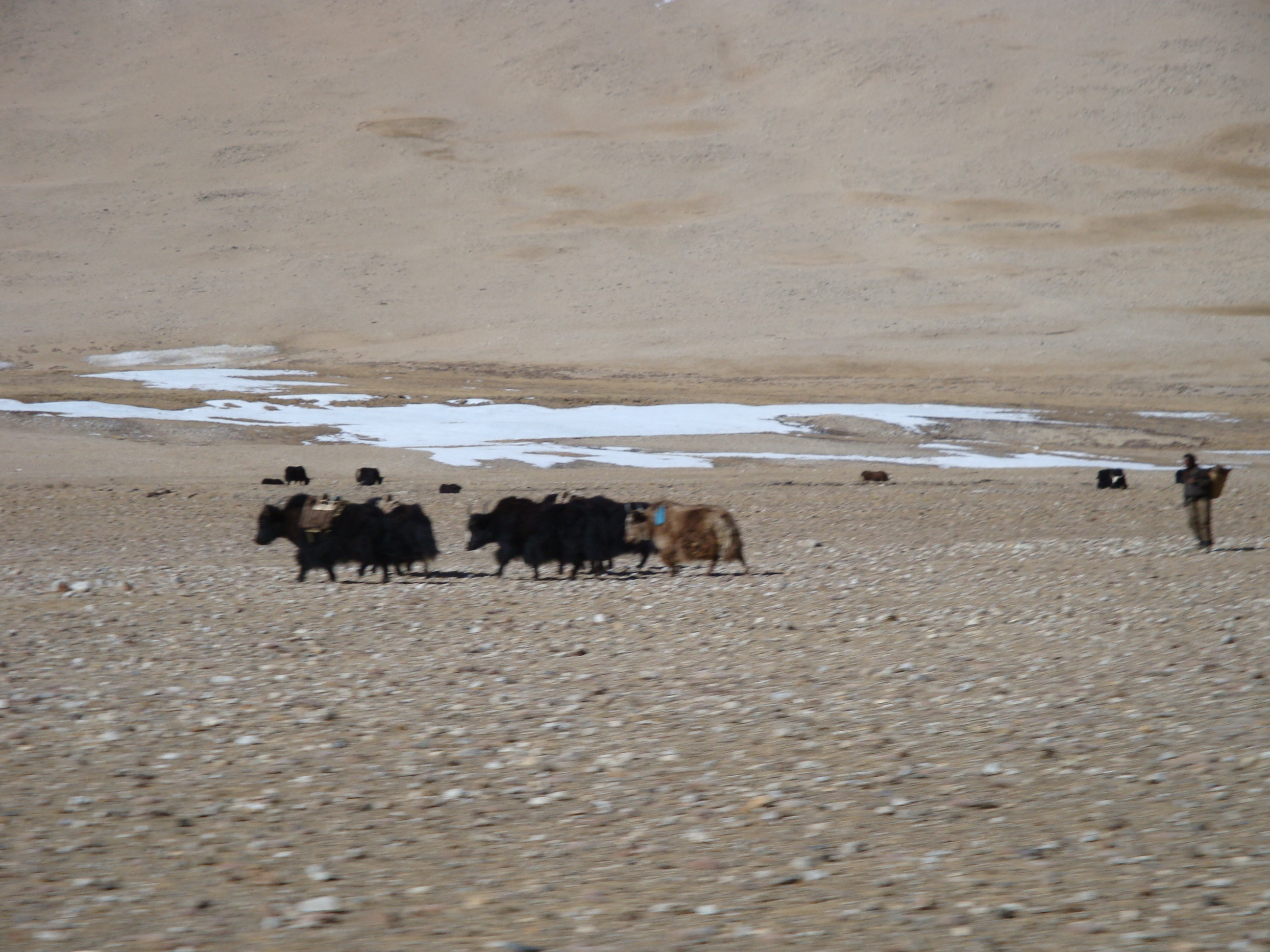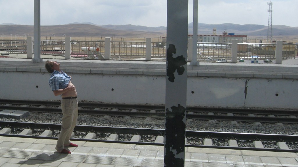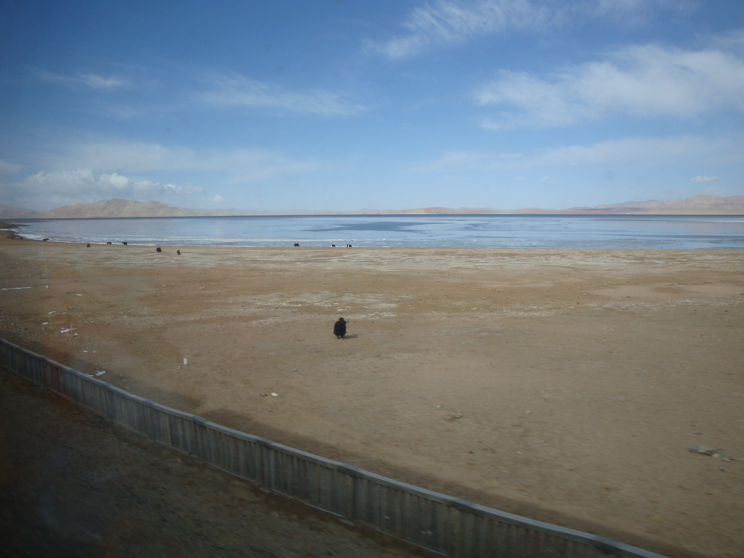 During the night we had joined up with the Beijing line and now we were heading West. The elevation was creeping up and before bed time we passed the Qinghai lake, almost a sea. Another night passed travelling across high mountain desert and by morning we were up on the Tibetan Plateau, heading South West, having crossed the first pass through the Kunlun Mountains at 4,700metres. The Sun came up on frozen wastes, dun landscapes and Yaks.