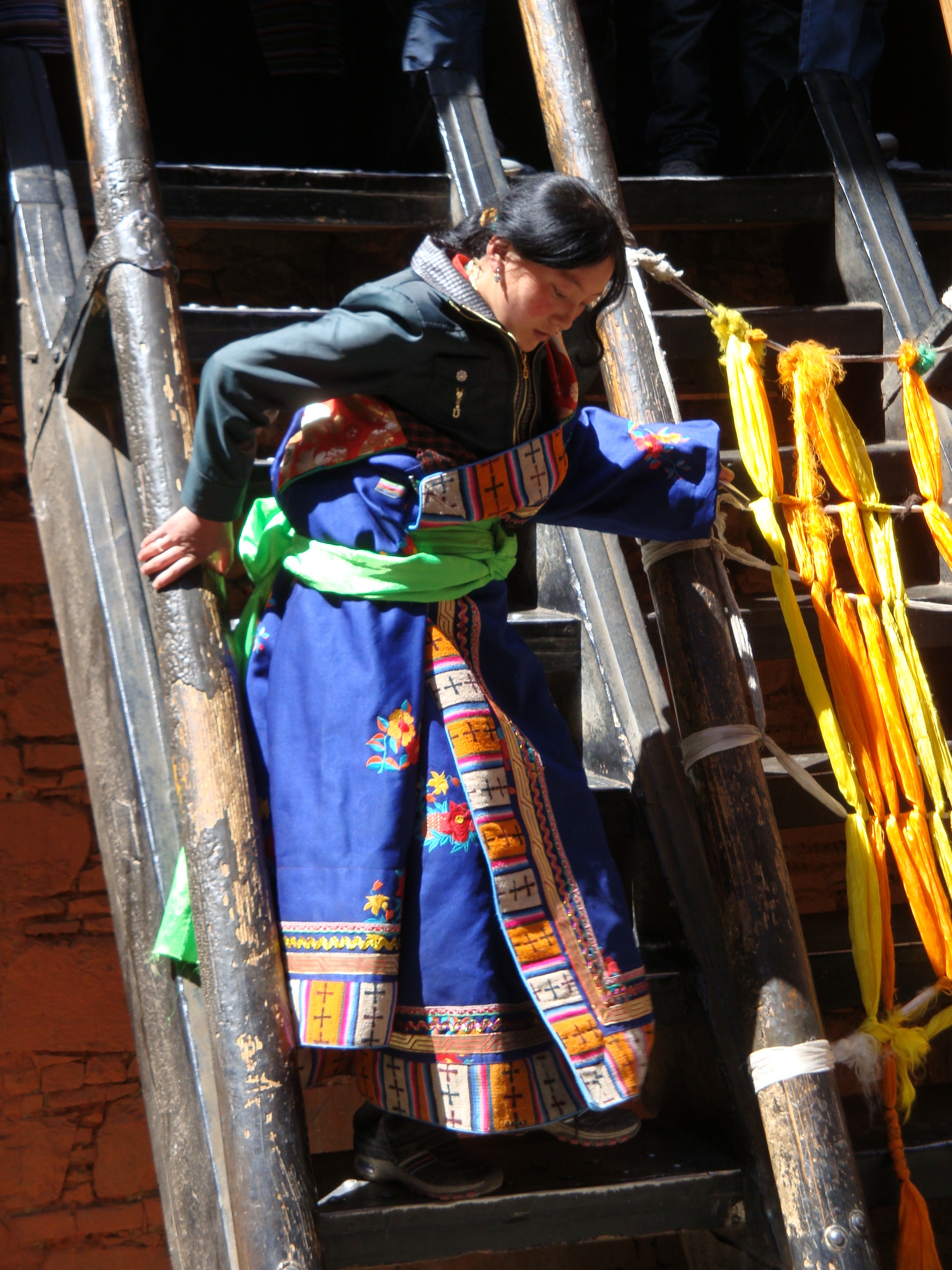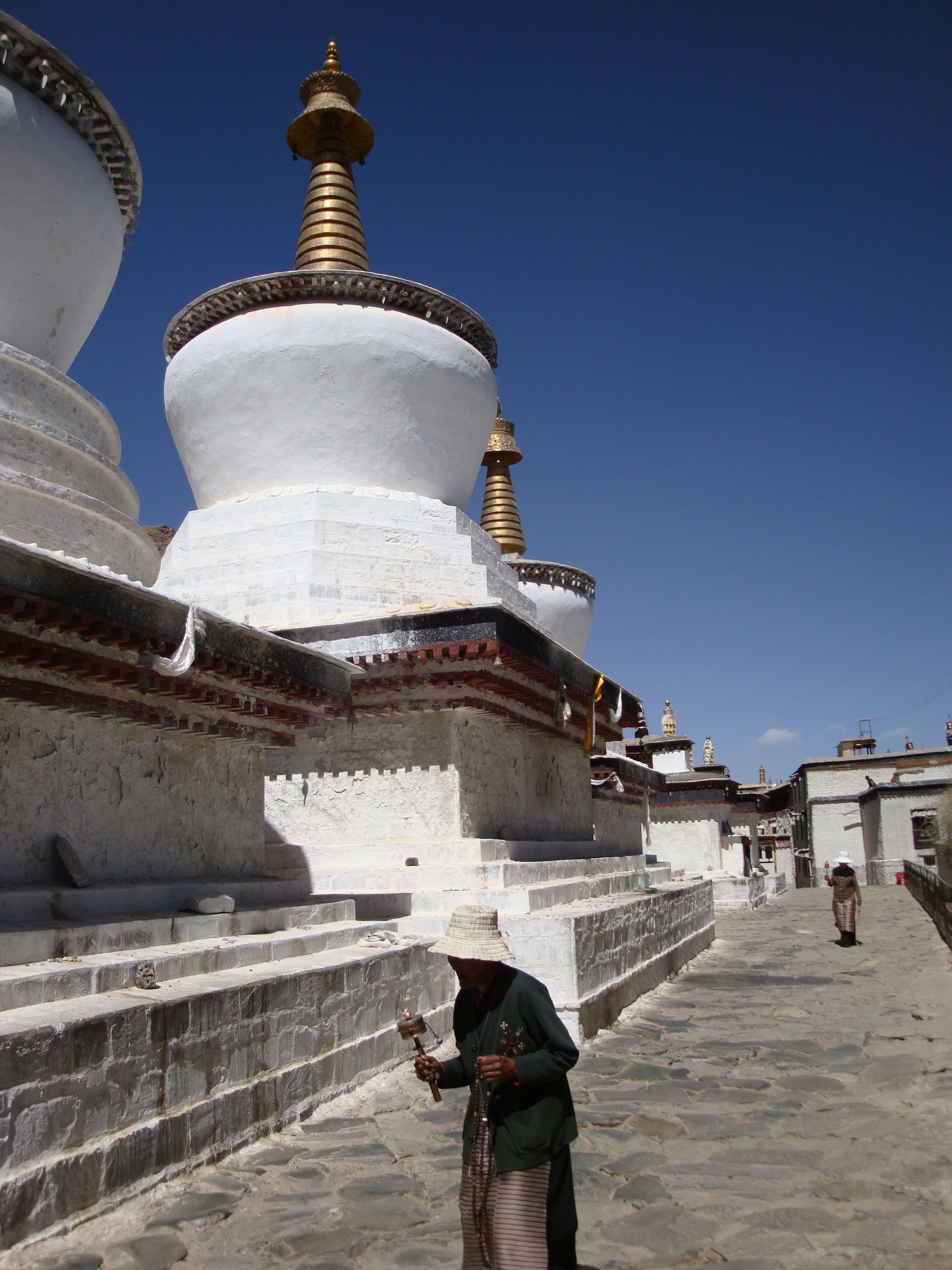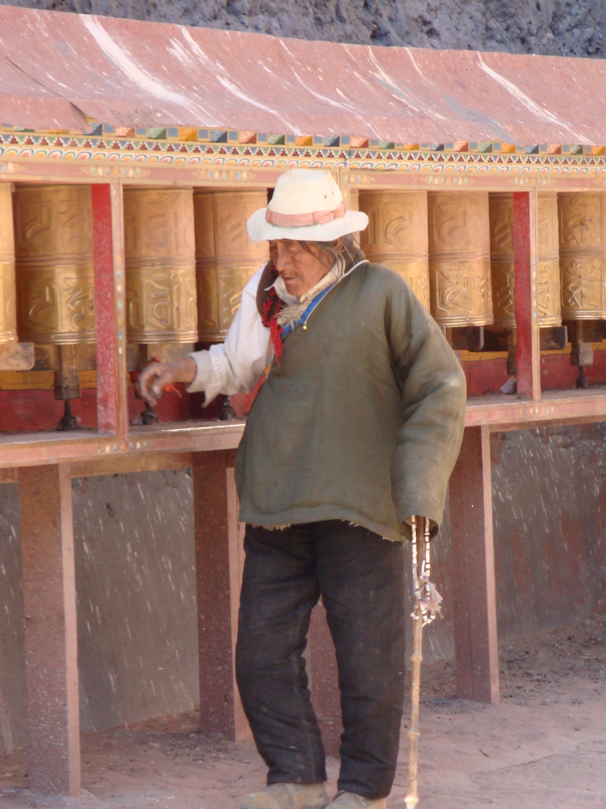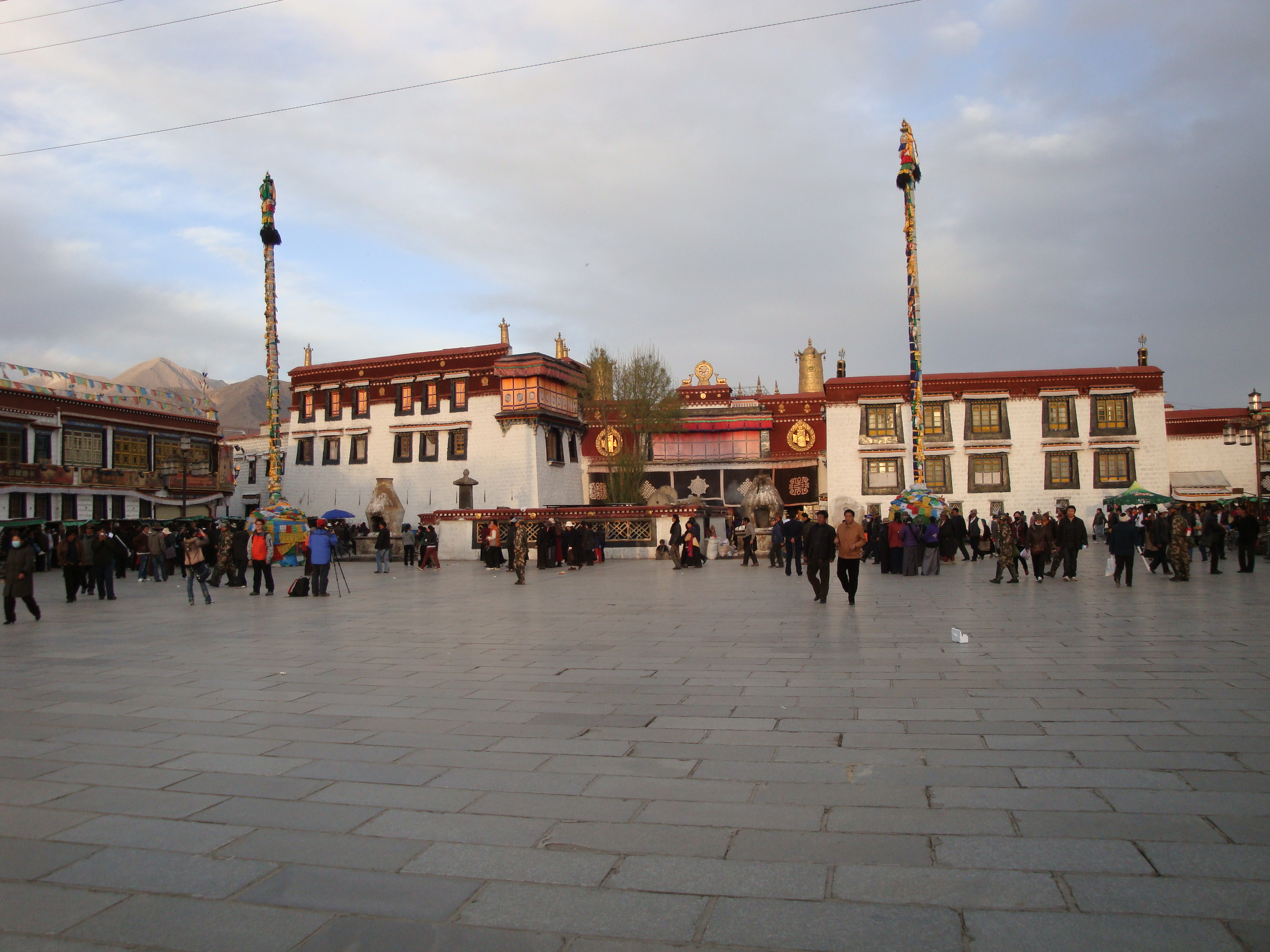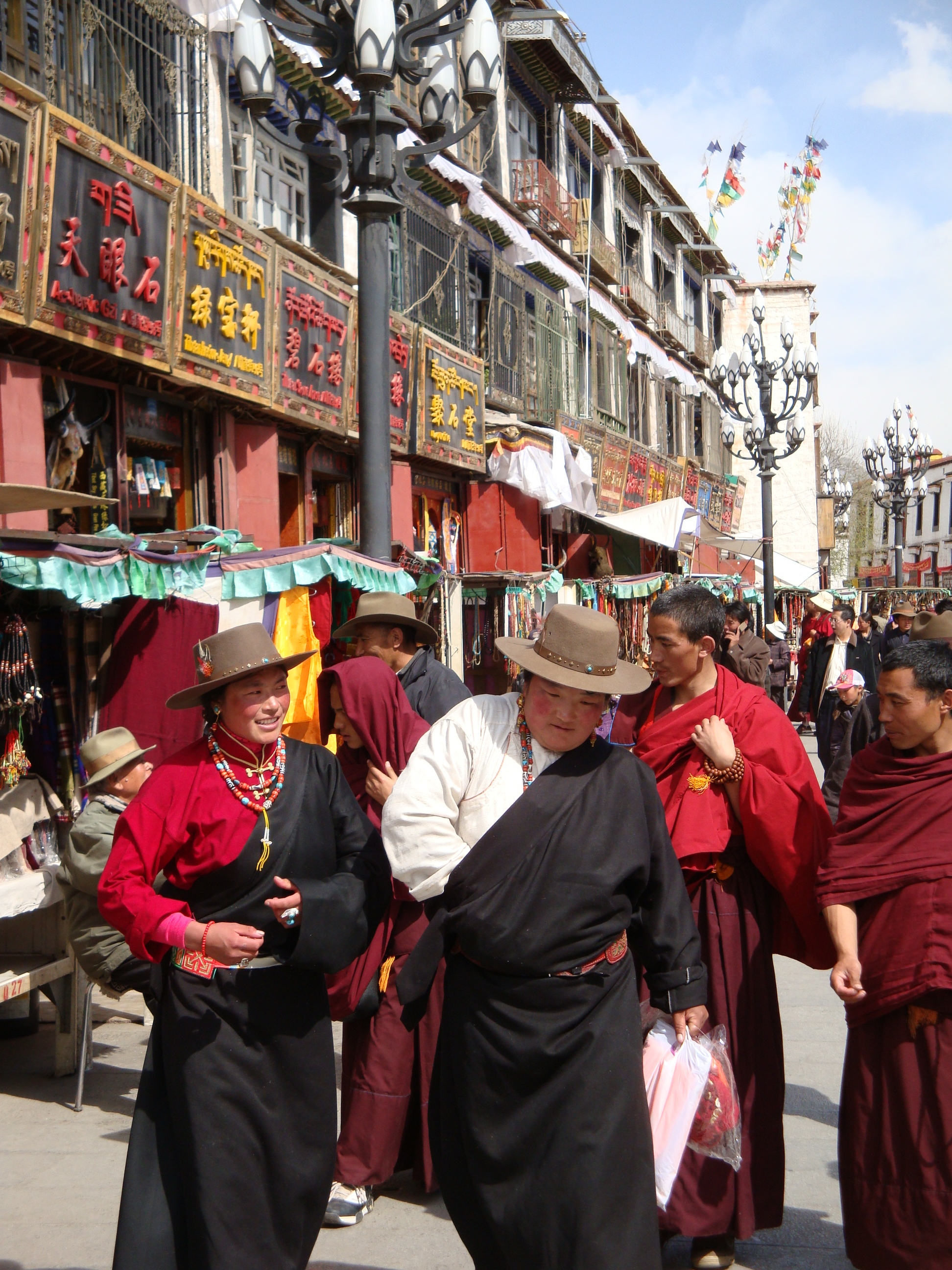 Anyway the Jokhang is surrounded by a street called the Par Kor. At the four corners there are huge poles covered in prayer flags and the devout gather every morning and evening to walk around this circuit, rolling their prayer wheels and having a good chant. I guess it’s about a kilometer in circumference and the street is lined with shops and market stalls. Everybody and his brother is out for a walk and it’s brilliant. A riot of colours and smiley faces from all walks of life. Lots of traditional costumes, but also plenty of nylon baseball hats and sneakers, a real mix of ages. You have to do this circuit at least 3 times, although lots of people seem to go on for hours, but you don’t bump into anybody because they all walk clockwise. How did they know to do that? In a country where they had no clocks? Spooky.