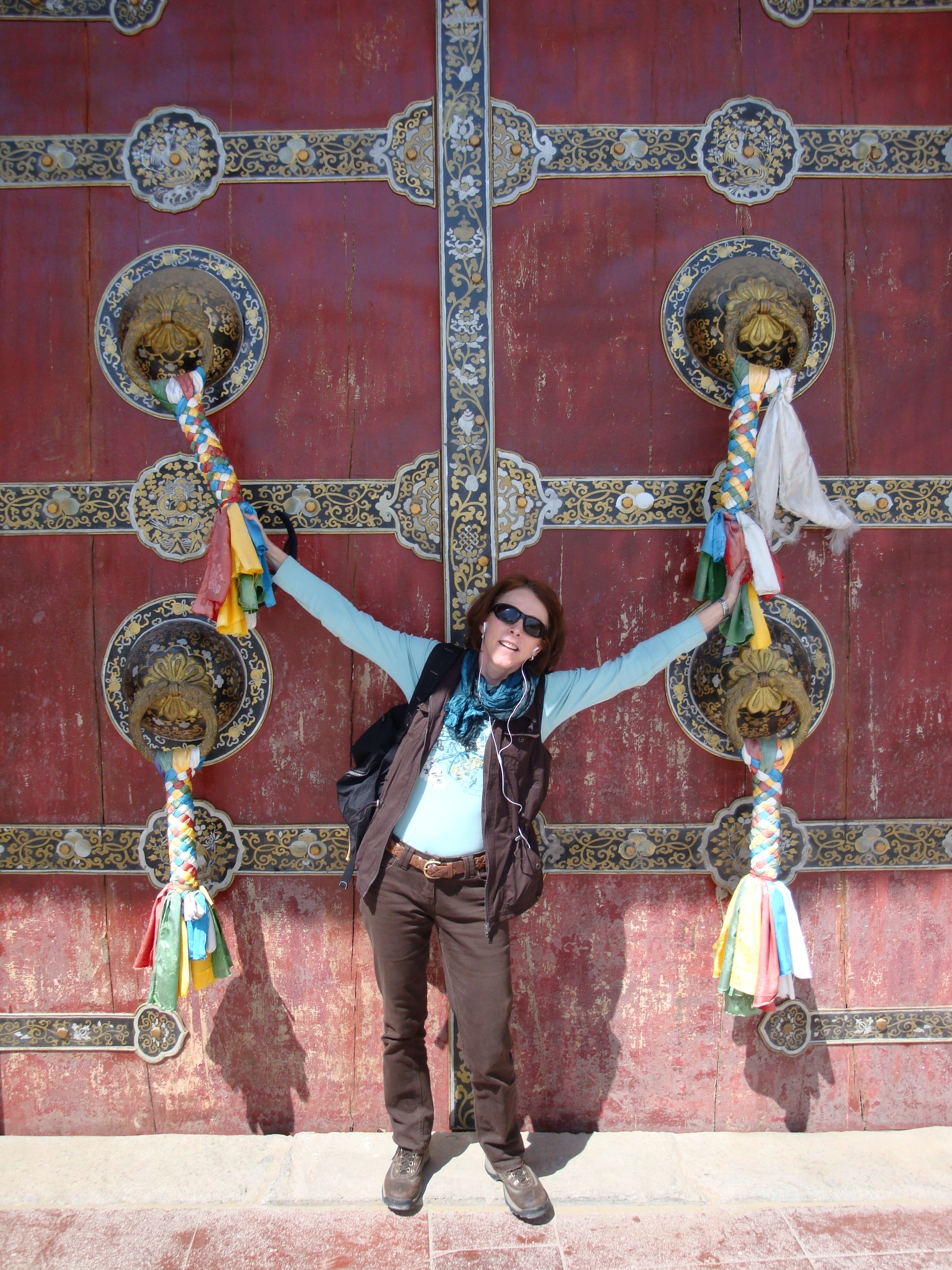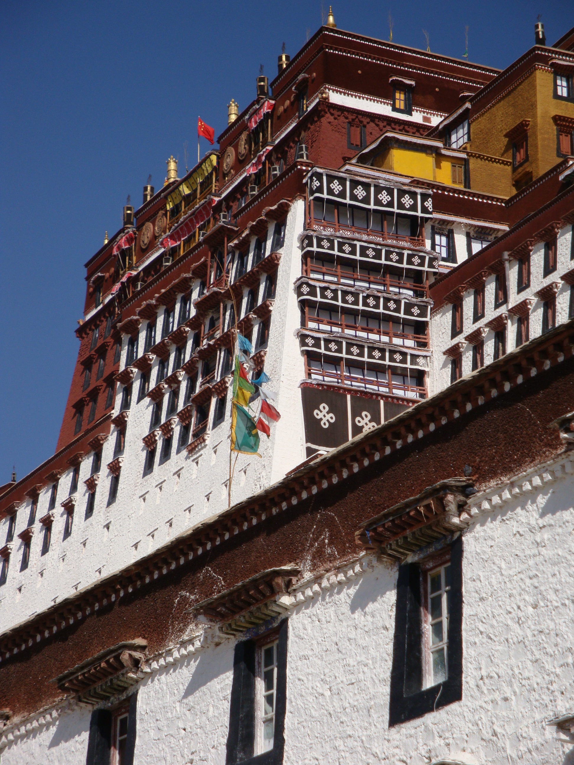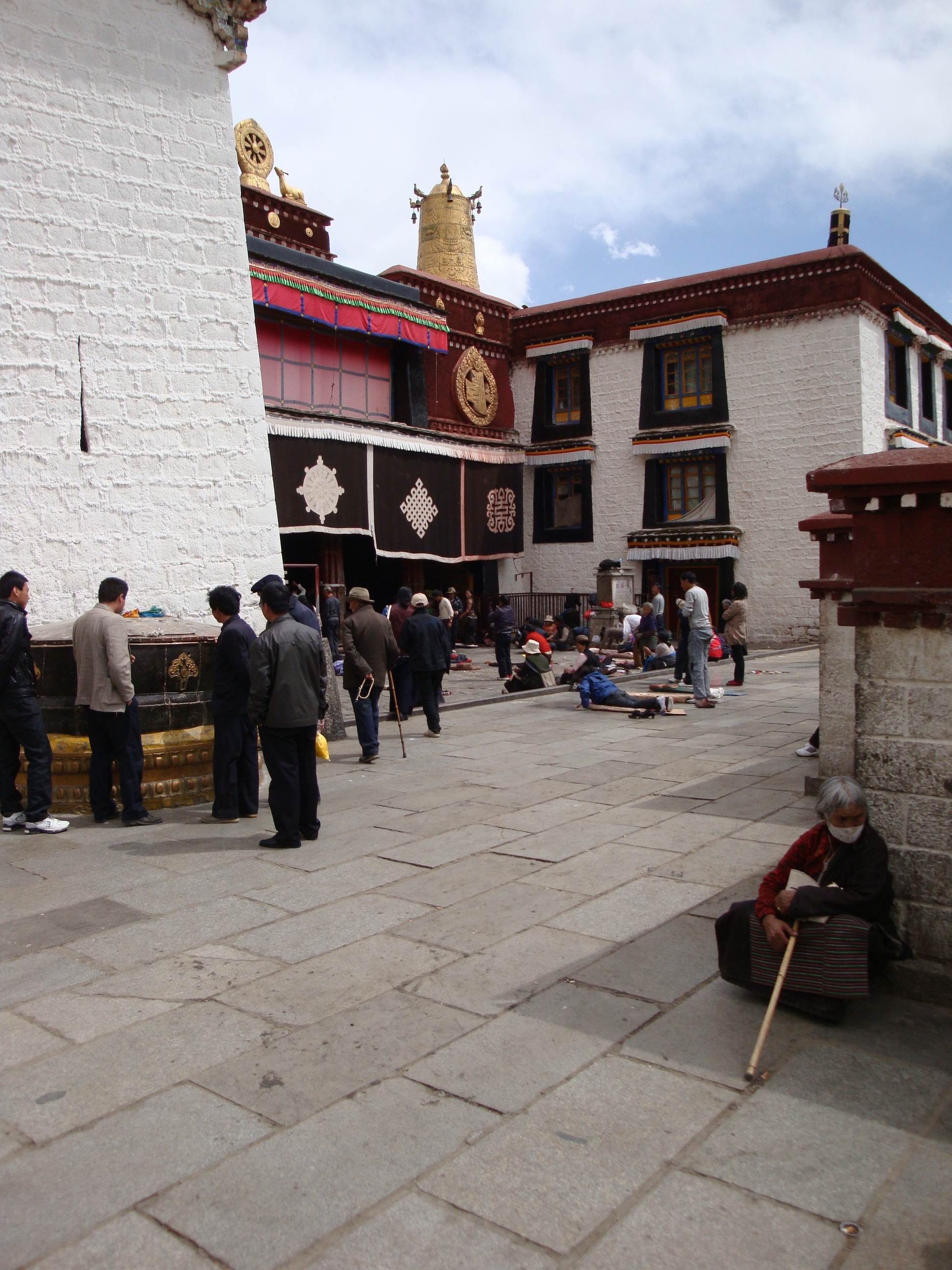 The Potala takes no notice. It sits serenely on its hill giving off a gentle “Ohhhhmmmmmm”. The white, ochre and maroon walls. The gold ornamentation. The flags. The huge blue sky. The air so thin and clear and the colours so vibrant. Thousands of people walking around the outside, clockwise, prayer wheels spinning, prayer beads rattling, several pilgrims doing the prostration shuffle.