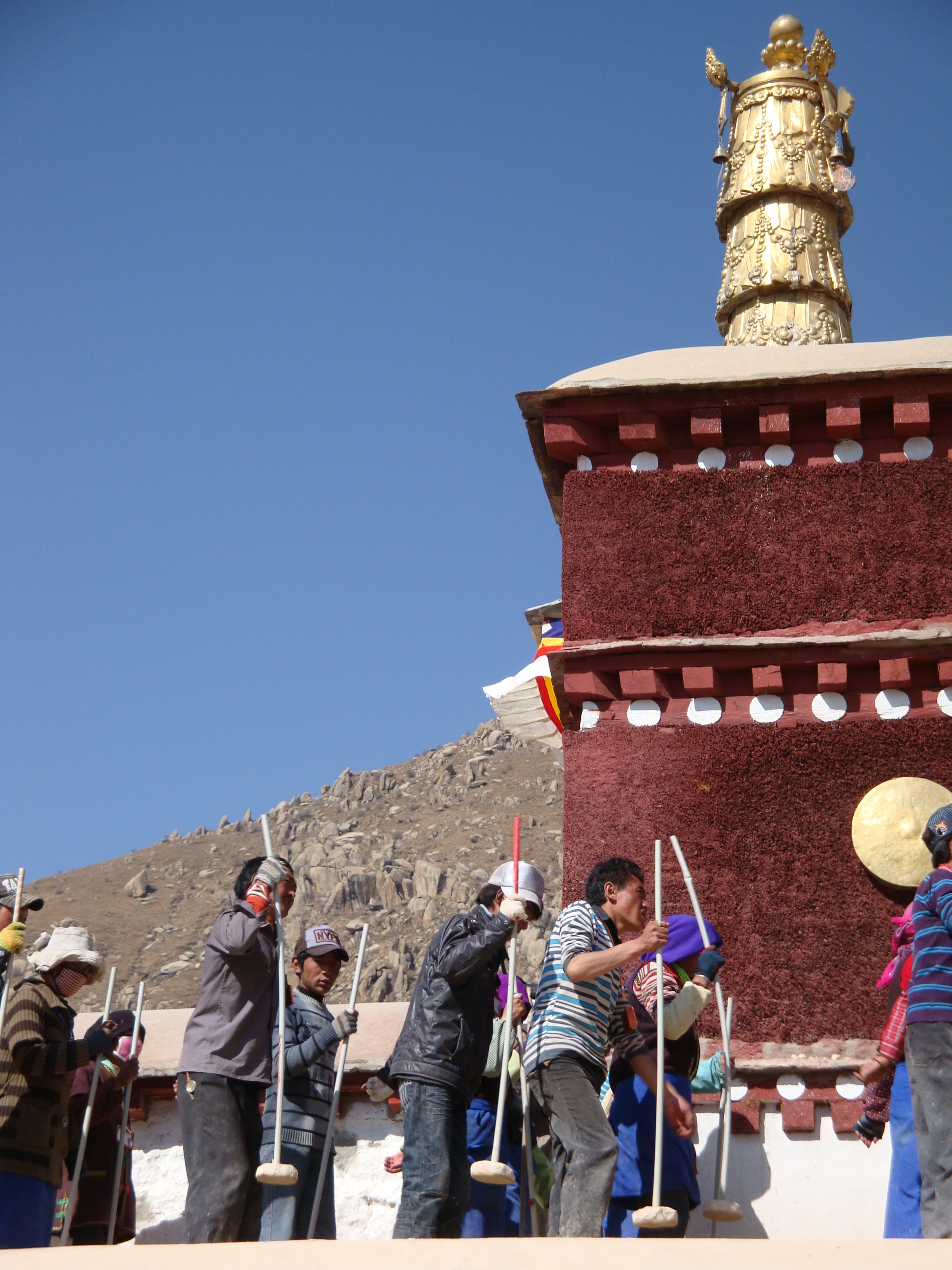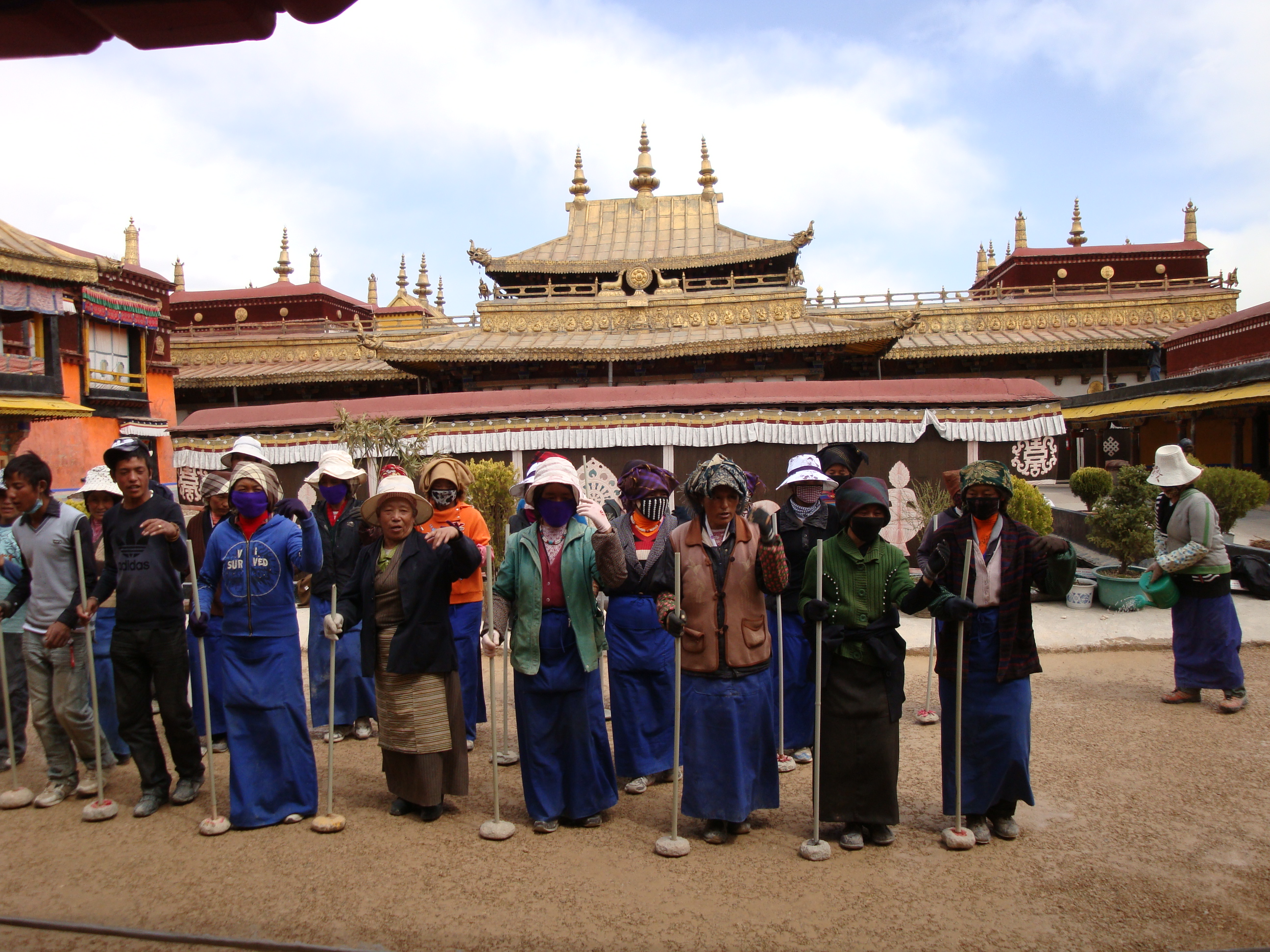 In the afternoon, we went inside the Jokhang. Even this early into the trip, we could see that we were going to get Buddha’d out. But each place had something unique and this one was under repair. The workers were compacting a new terrace floor. About 50 of them, men and women stood on the crushed stones, a long pole held in one hand with a stone weight on the end. Half the group started up a song, rhythmic wailing like a Red Indian wardance, feet stamping and the pole weight cracking down. As their line finished, the other group picked it up, back and forth, back and forth. It was brilliant.