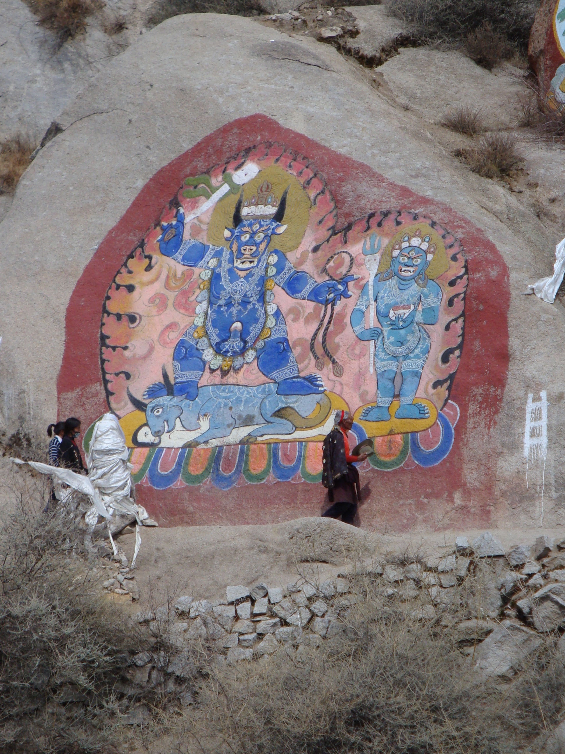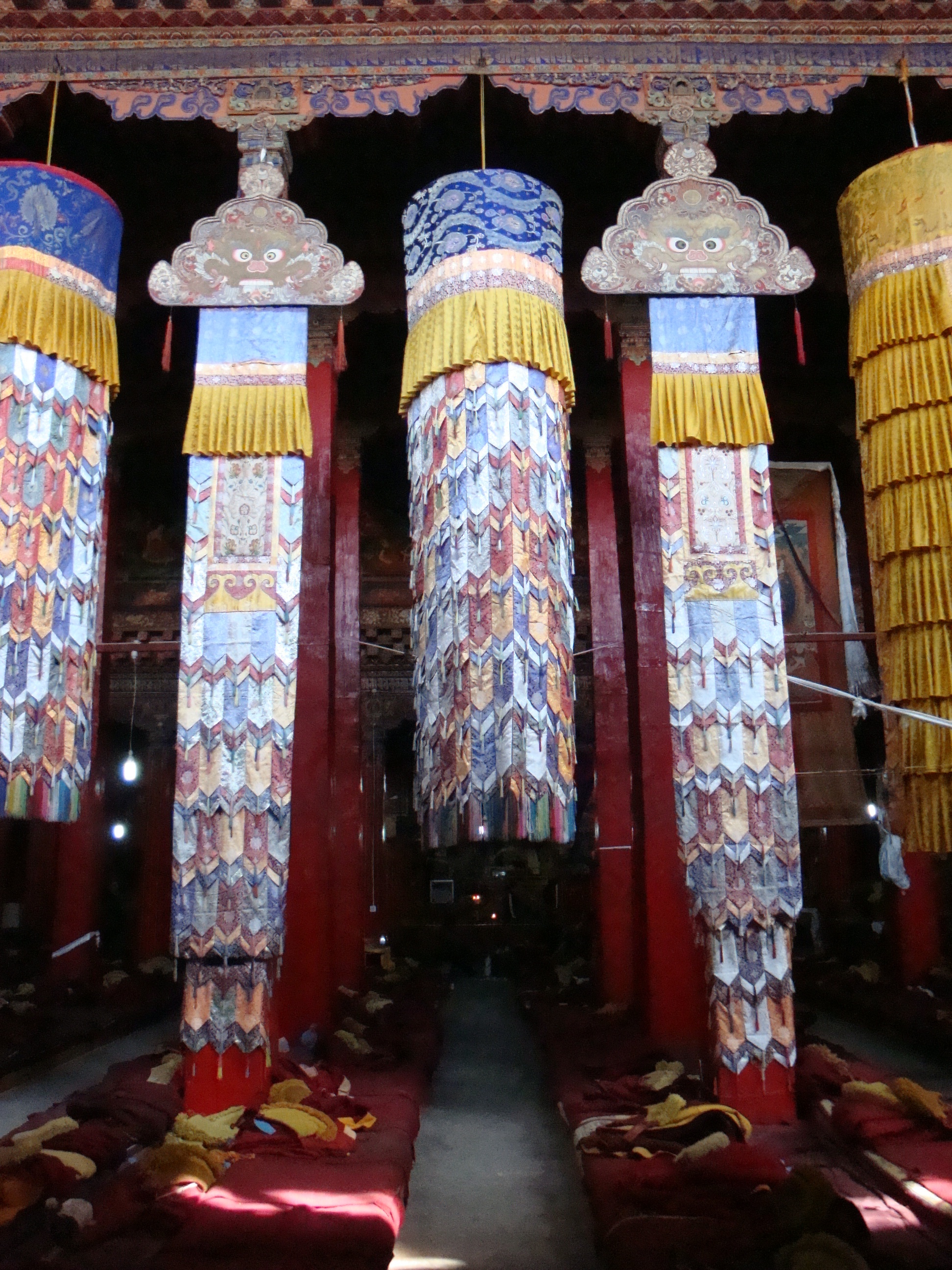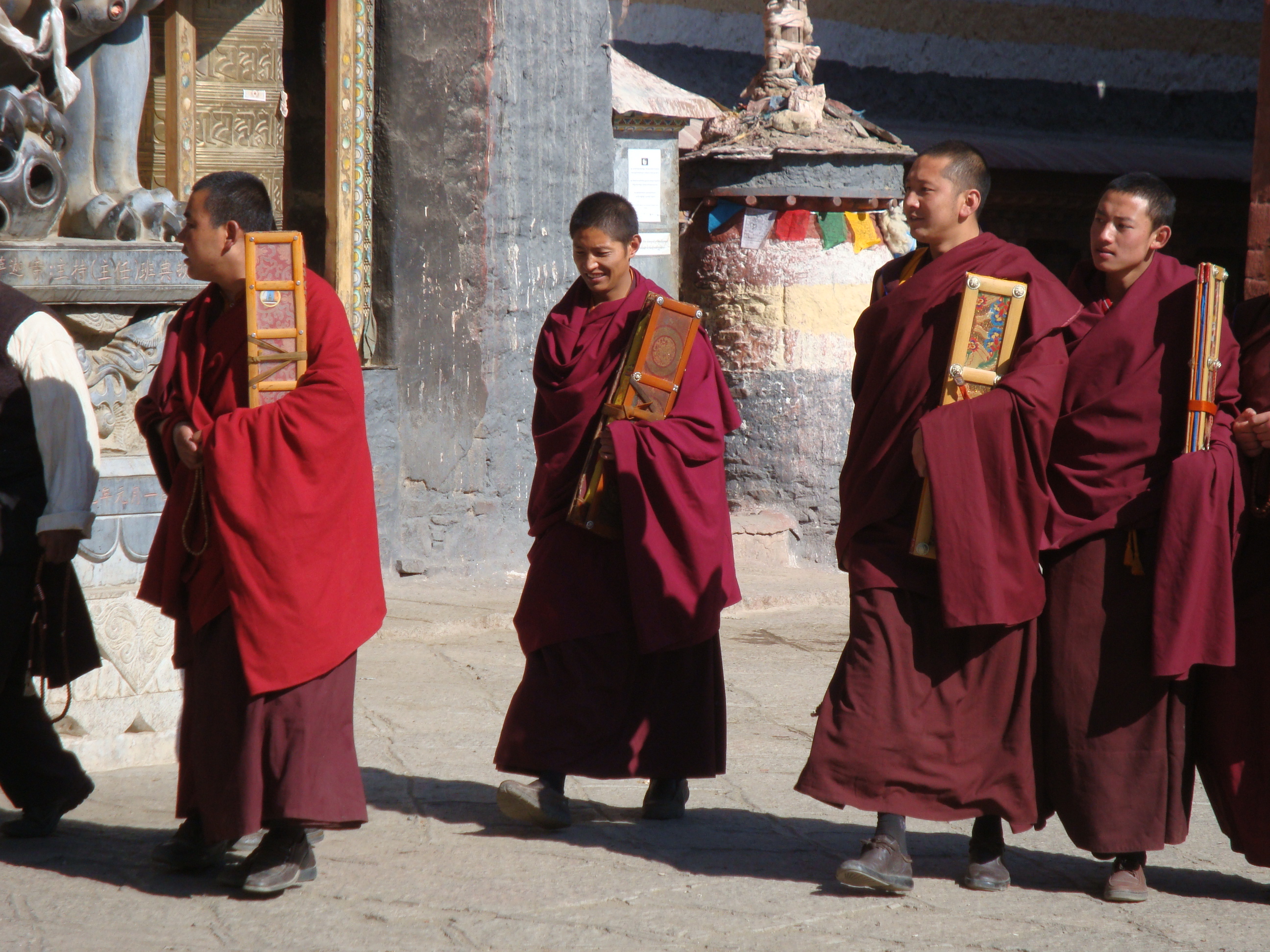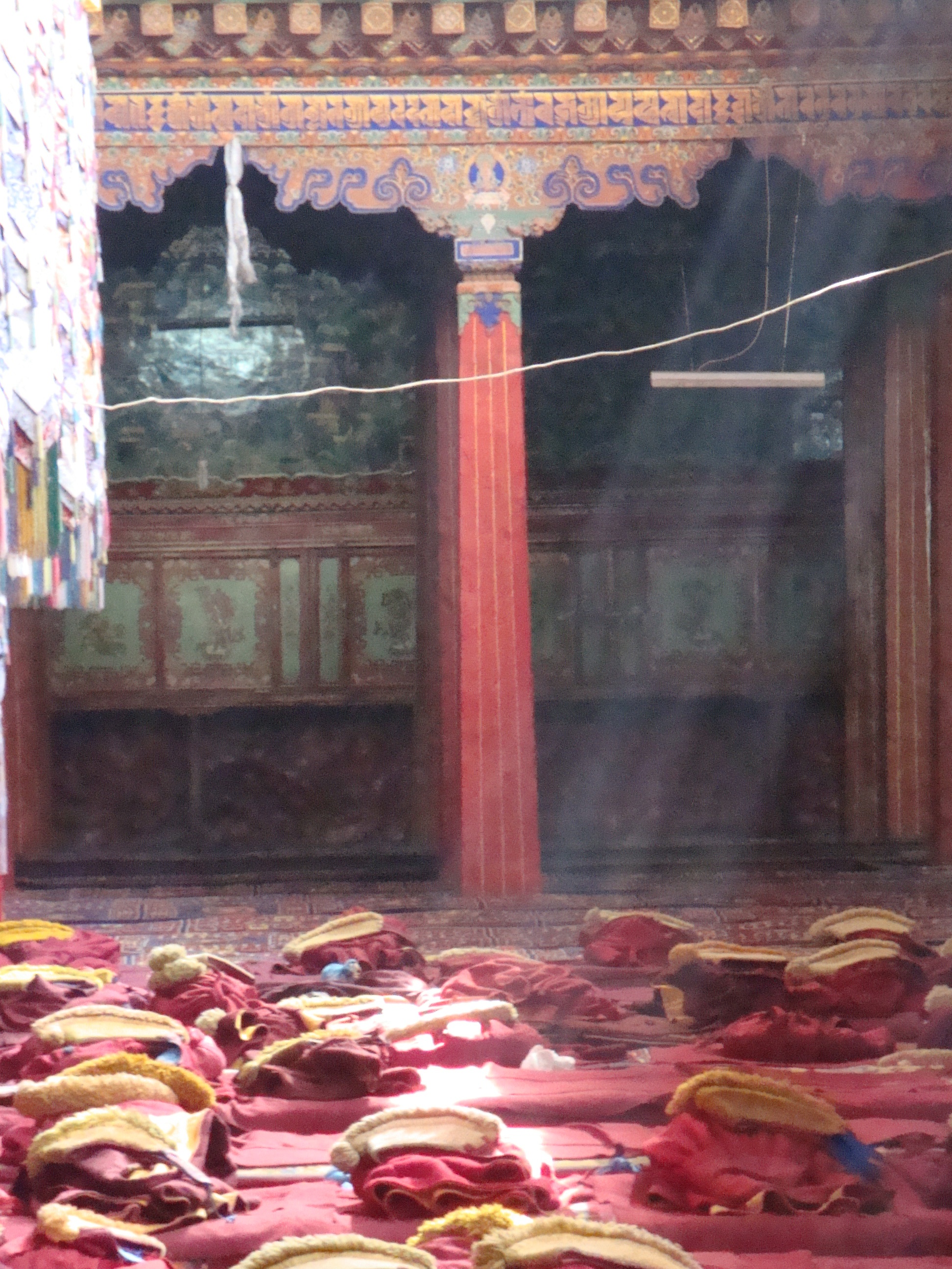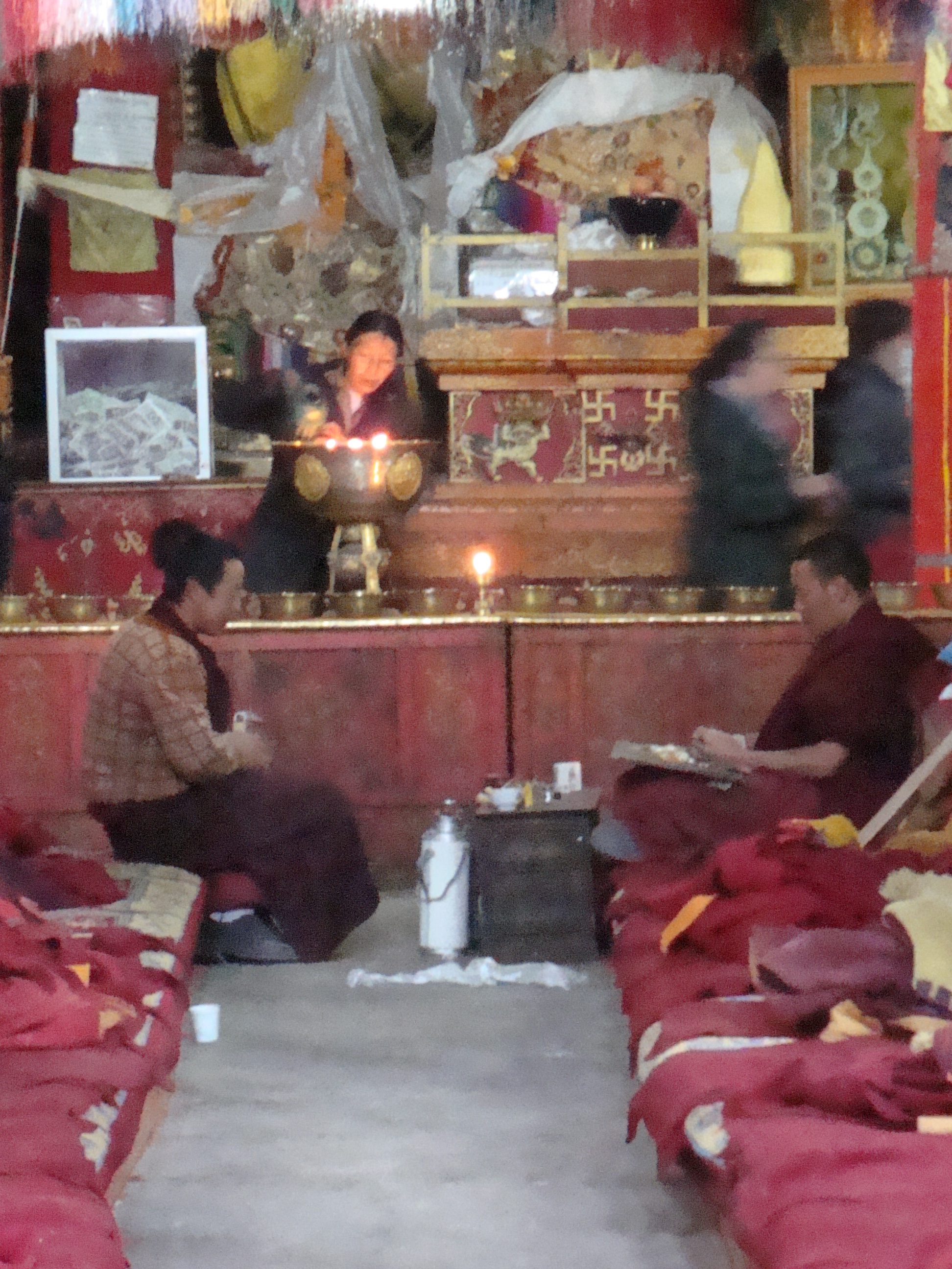 Multiply this by about 50 and you have the average Tibetan Temple or Monastery. Each Chapel has urns full of yak butter with several wicks on the go. Pilgrims race around with thermos flasks of liquid butter to top them up and stuff money into every available nook and cranny. Monks sit in the corner straightening out and stacking the loot. Your eyes are strained from the bright light outdoors and the smoky light inside. Your clothes and hair begin to smell of burnt yak butter. You begin to understand why all the monks have such dark skins. It’s not sunlight, it’s Yak smoke. It’s a never ending procession of people. Touch all the bases, load each one with a little butter and cash, move on to the next, hurry, hurry, you might die soon and you don’t want to come back as a Chinese.