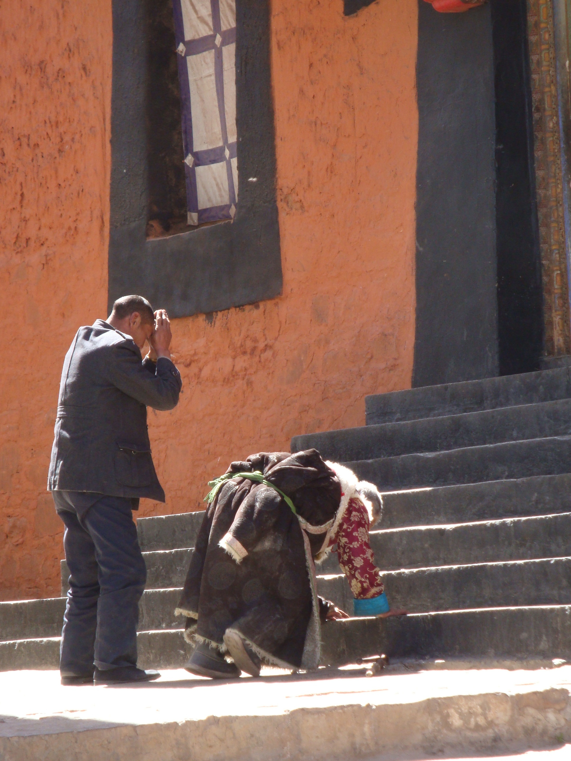 For variation, you can start at your front door and repeat daily inserting 3 actual steps between Steps 1 & 2, until you get to Lhasa. We saw one guy who had done this from his home 450 miles in the West, other Pilgrims gave him money, probably enough to get his hips replaced, although I doubt they can do that sort of thing in Tibet.