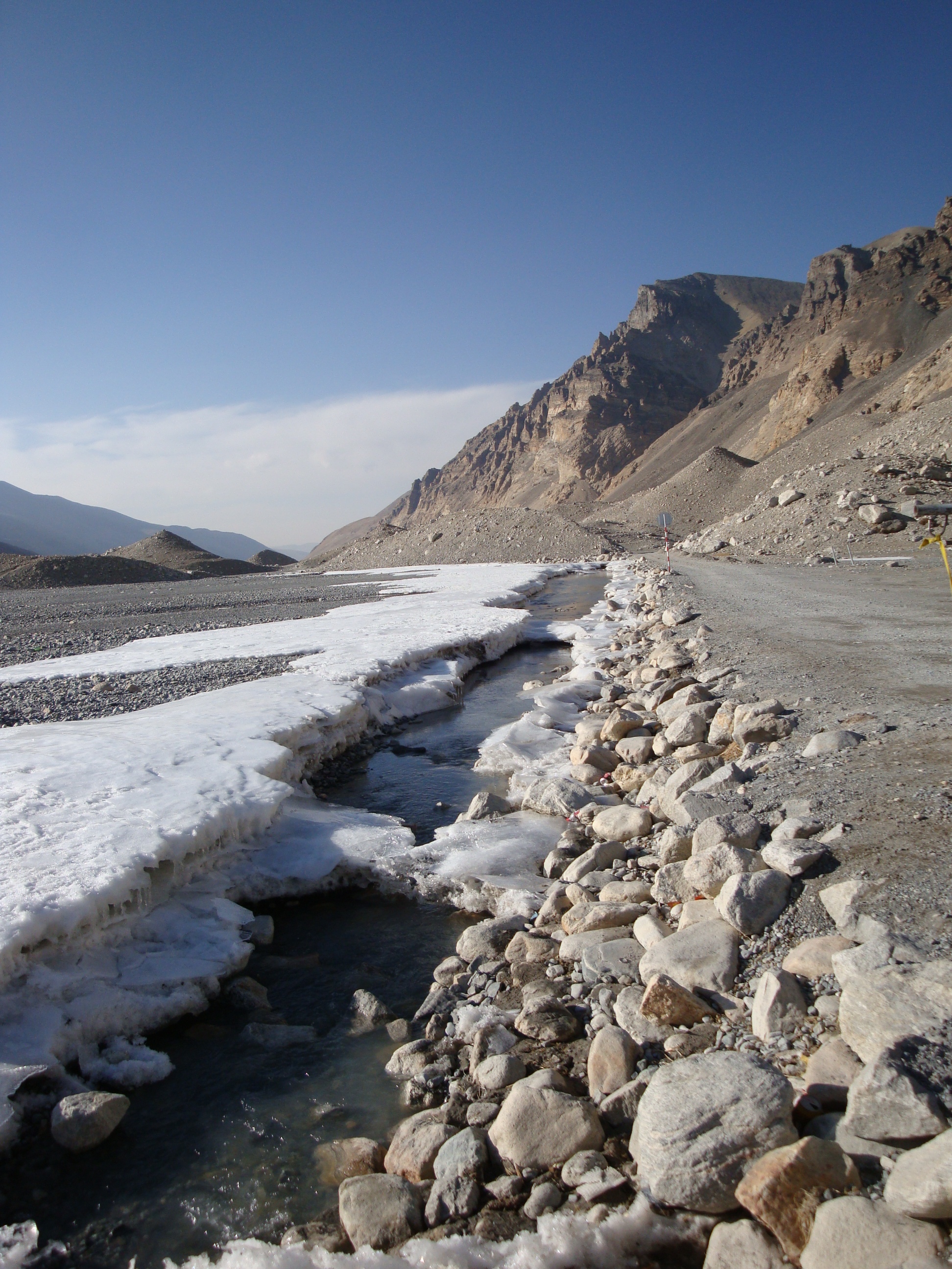 Then, having had our permits checked on the outside of town, we went off-road. At first this was quite exciting and the use of a Land cruiser finally seemed appropriate. After 5K it seemed essential. Thereafter, a moon buggy would have been a blessing. I guess it keeps the riff-raff out, but this is 108 kilometers of extreme driving and it took 6 hours. It was brutal. Where there was a road, of sorts, it was ribbed like a washboard and it vibrated the fillings out of your teeth. Elsewhere it was just rocks. Boulder strewn glacial moraine. All my geology started coming back to me, by way of my spinal column. Community singing was suspended. It was just 6 hours of “OOfs!! & Grunts!!”, which sounds like our community singing anyway, with occasional stops to look at Everest getting closer.