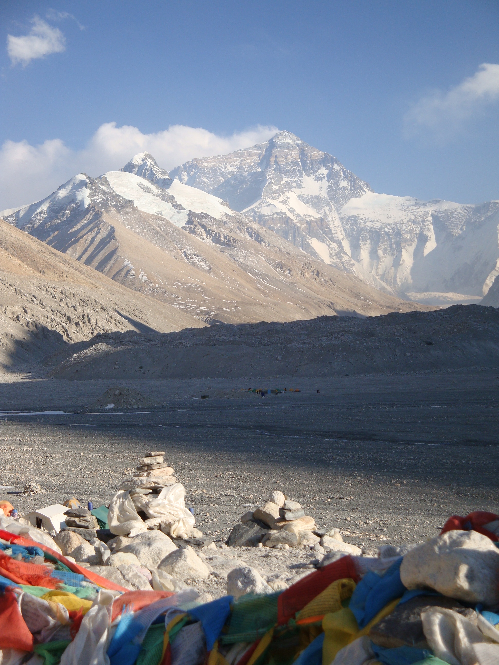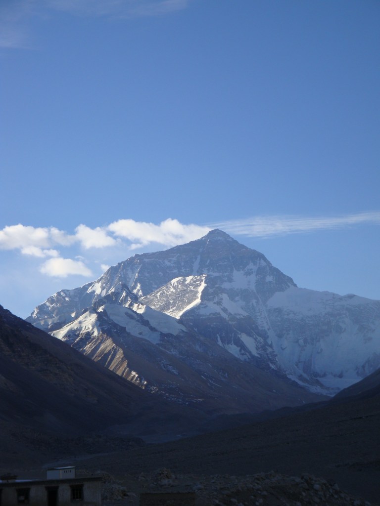 We walked past the barrier a couple of hundred metres and then climbed a small hill about 30 metres high. Every step is an effort at 5040 metres, but when you get to the top, there she is. A steep shadowed valley lies in front, various expedition camps set up along the valley bottom and Qomolangma framed at the end. The sun shining on black granite, white snow and the flag of cloud fluttering from the summit. It is really quite beautiful. It doesn’t look that difficult, especially on a sunny evening. I might be tempted to give it a shot one day. I just hung about and gawped and took a gazillion photographs, but eventually they dragged me away. It was only at the foot of the hill that I realized we hadn’t taken a team photo, but at that point I couldn’t convince anybody to go back up.