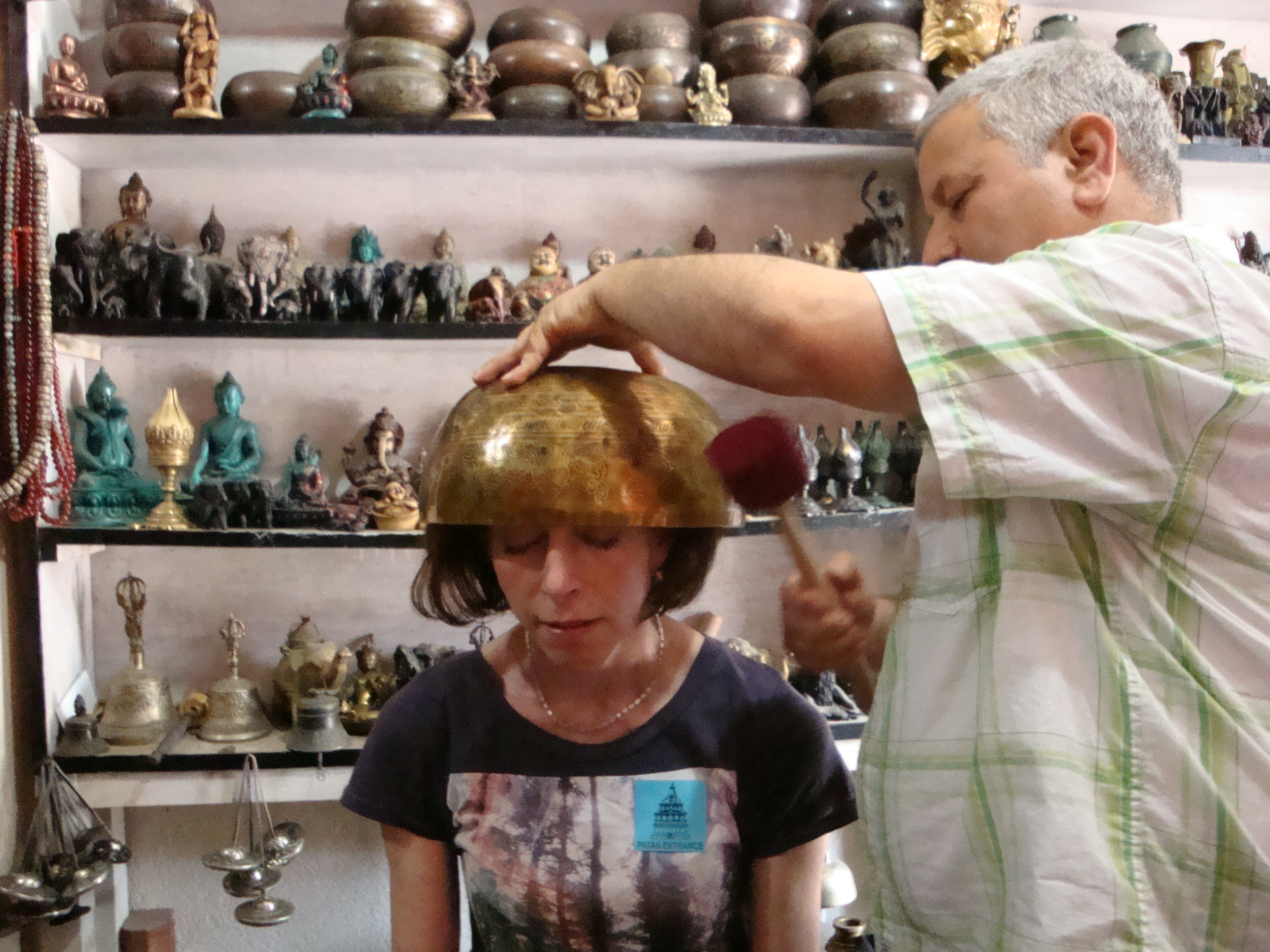 The last was a cute little guy who handmade bowls from a composite of 7 different metals which vibrate when struck or rubbed and give off the sweetest sound. He put them over our heads and gonged them so that you felt the vibrations run up and down your Kundalini, getting your Chakras in order. He also took Visa. I had to have one and now I give Dori a good gonging whenever she will let me.