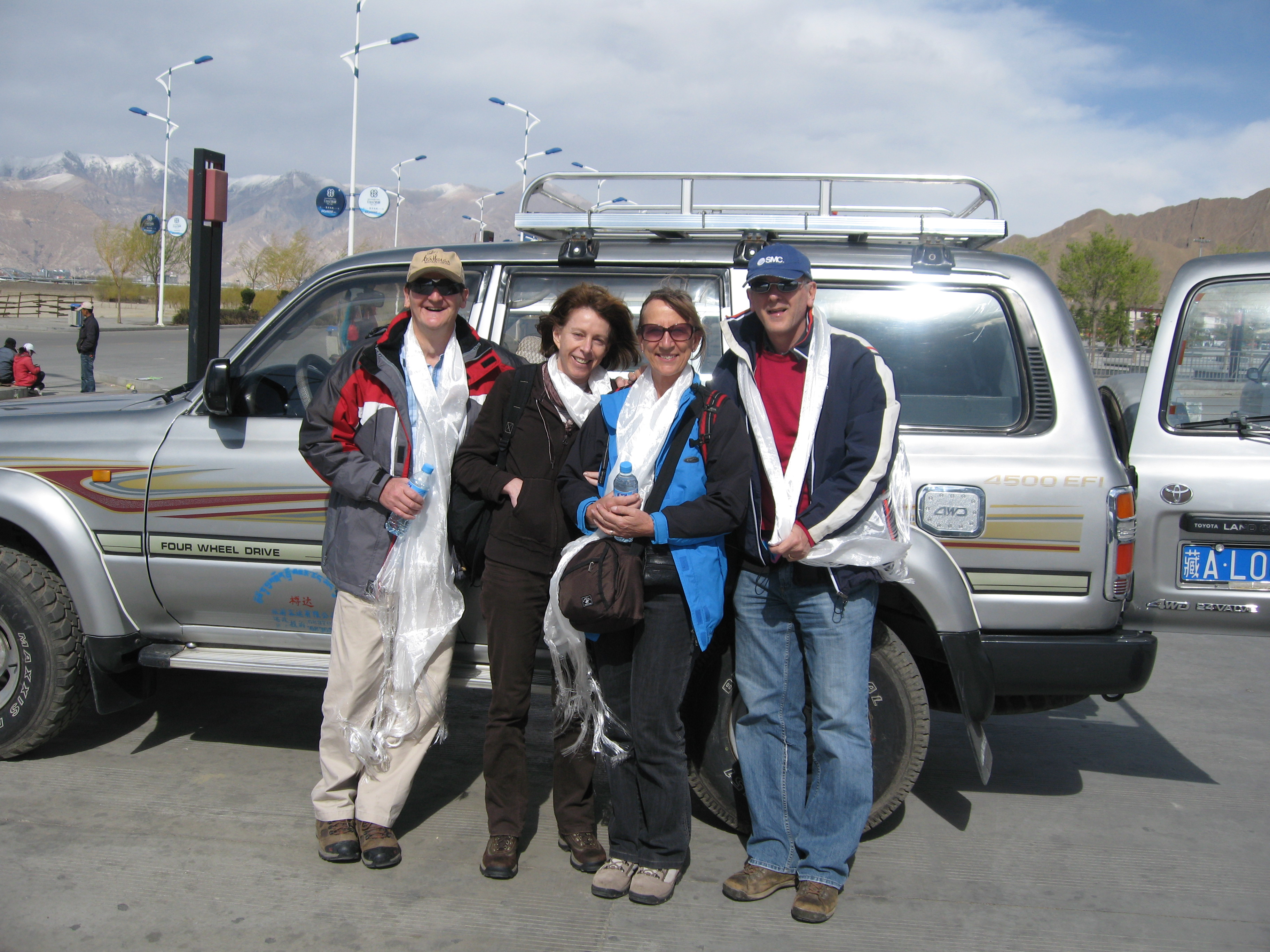 In the morning, Padro loaded the bags up onto the roofrack and covered them with a tarp that was made of biodegradable plastic. A noble and eco-friendly act that, given the UV levels in Tibet, meant that within 15K our cases were ruined. Jon in the wing mans’ seat. Me, Dori and Liz in the back and Kel Sang hunched over in the boot with jackets and hand baggage. Cosy.
