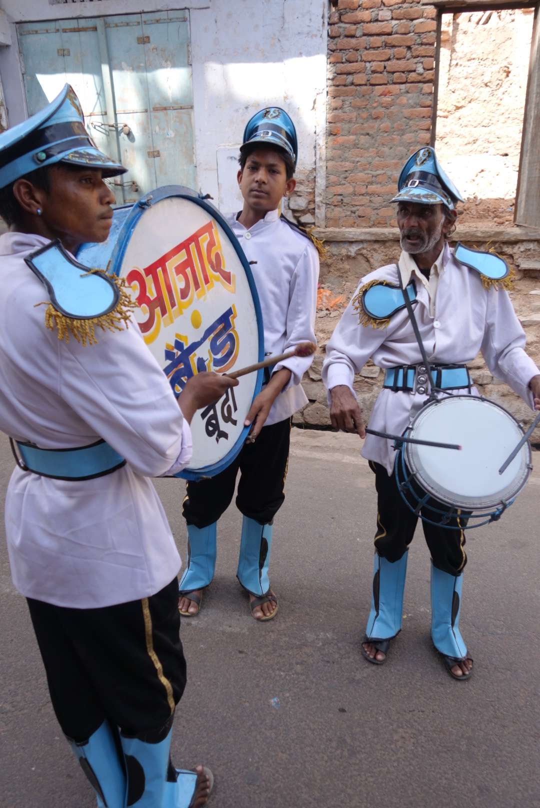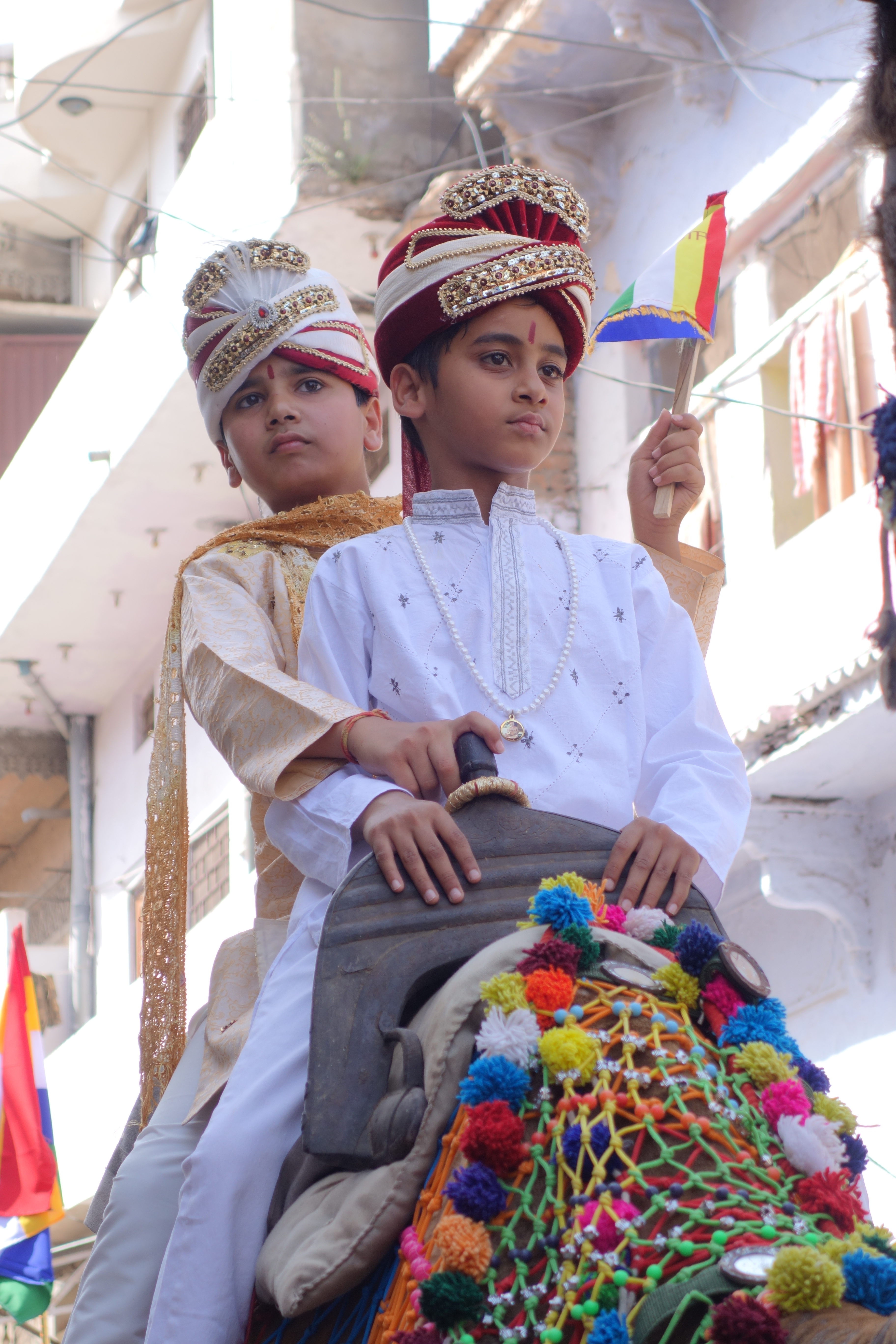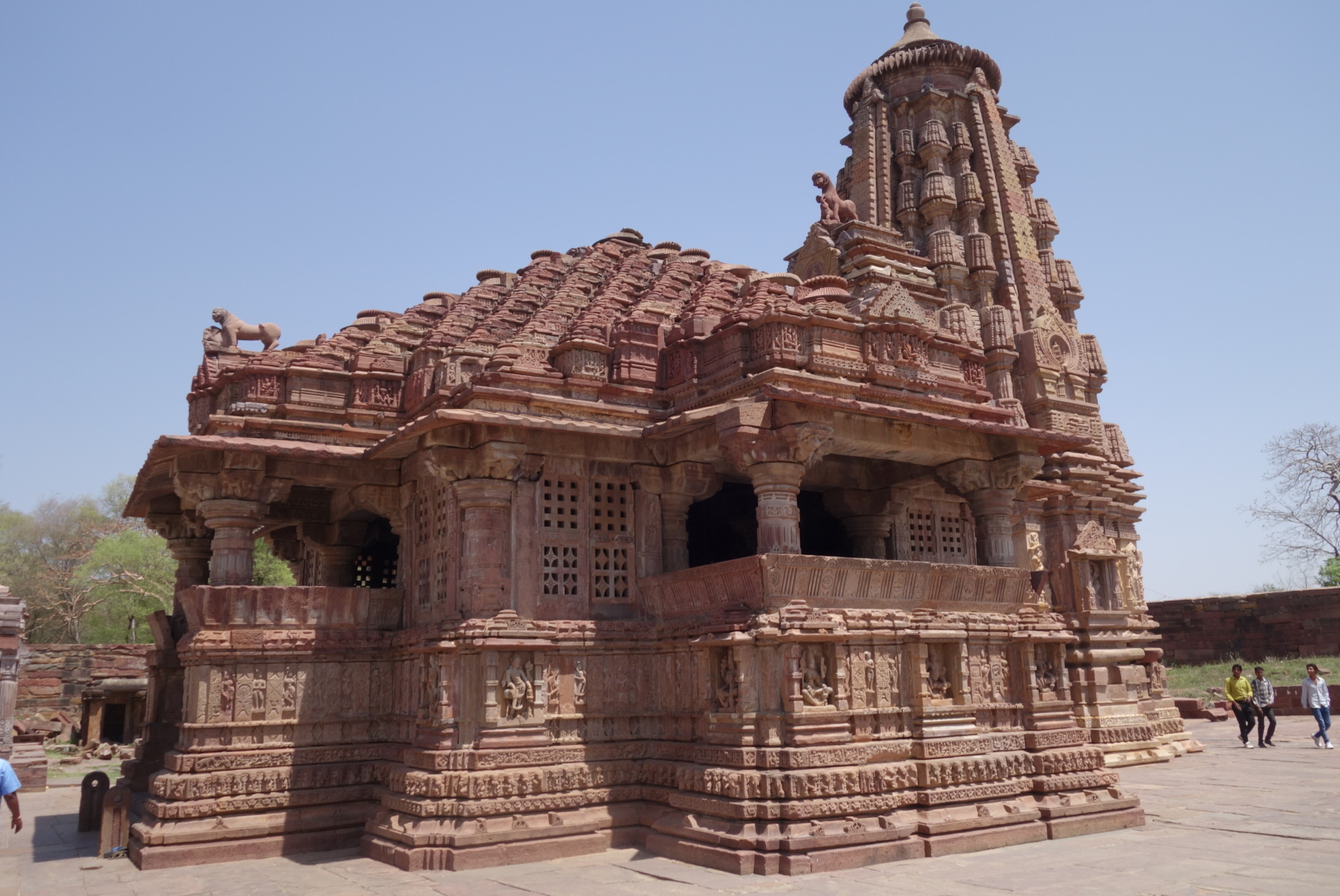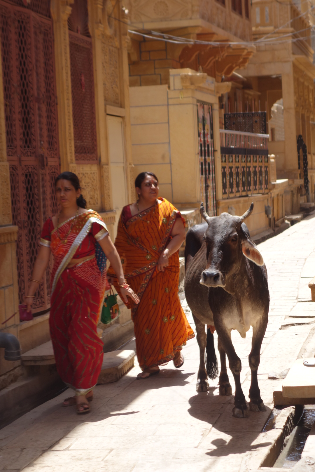 No time to relax, our guide, Navendra, was there and we were off. Somehow, Ramdev had managed to squeeze the car back out of the town and now the street was jammed with a religious procession. I always thought Jains were very esoteric, all about giving up earthly trivia and connecting with the big Ohmmm in the sky. Not these guys. They were all about spangley floats, careening down the street, each accompanied by a group of bizarrely clad and wild eyed, grizzled old geezers and boys, banging drums and blowing trumpets while a singer belted out the latest top-ten holy tunes from chromed speaker horns mounted atop the float. Each competing with the next, while motorbikes and tuk-tuks buzzed between not even trying to match the rhythm with their never ending horns. And everywhere, the great stoic cows.
