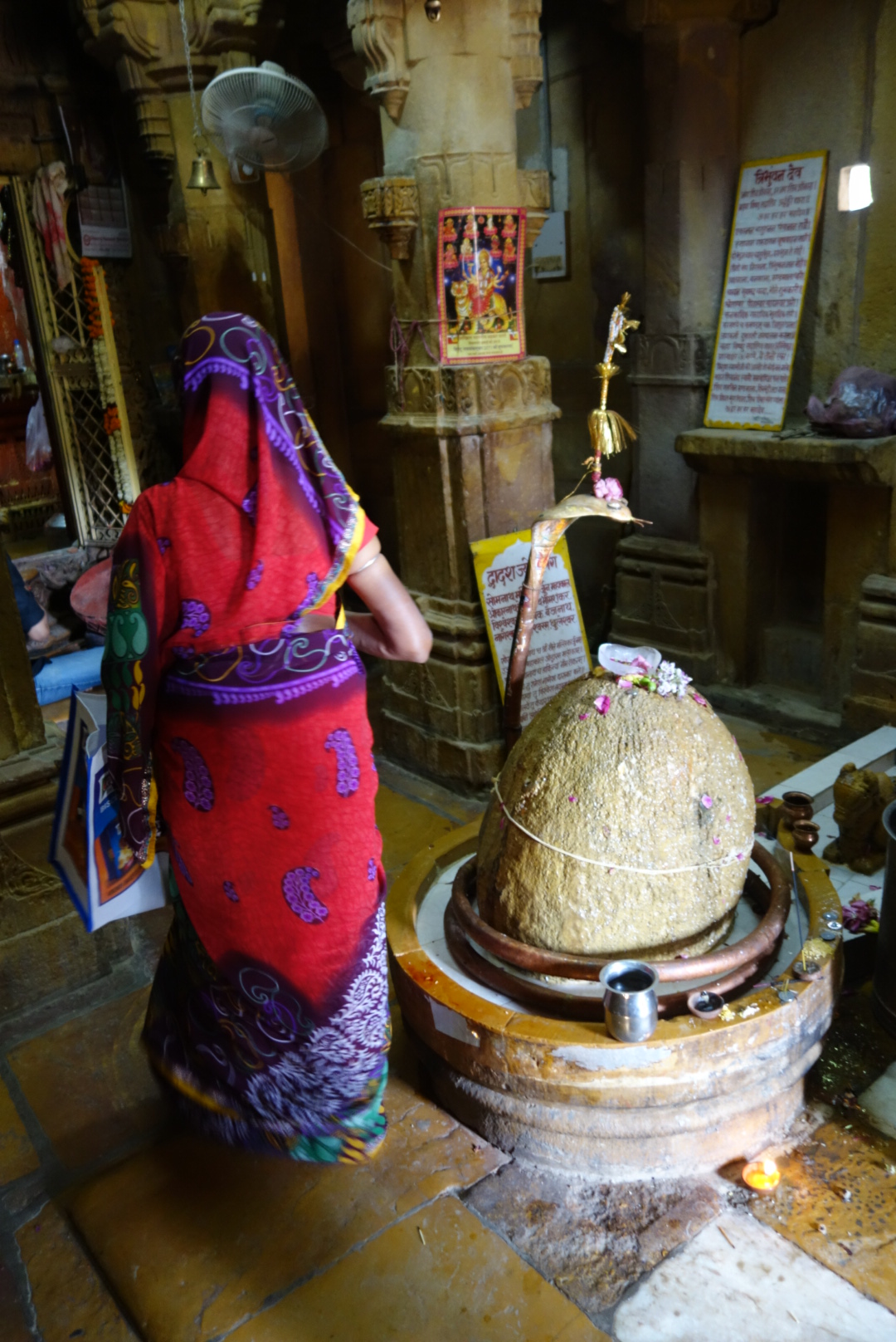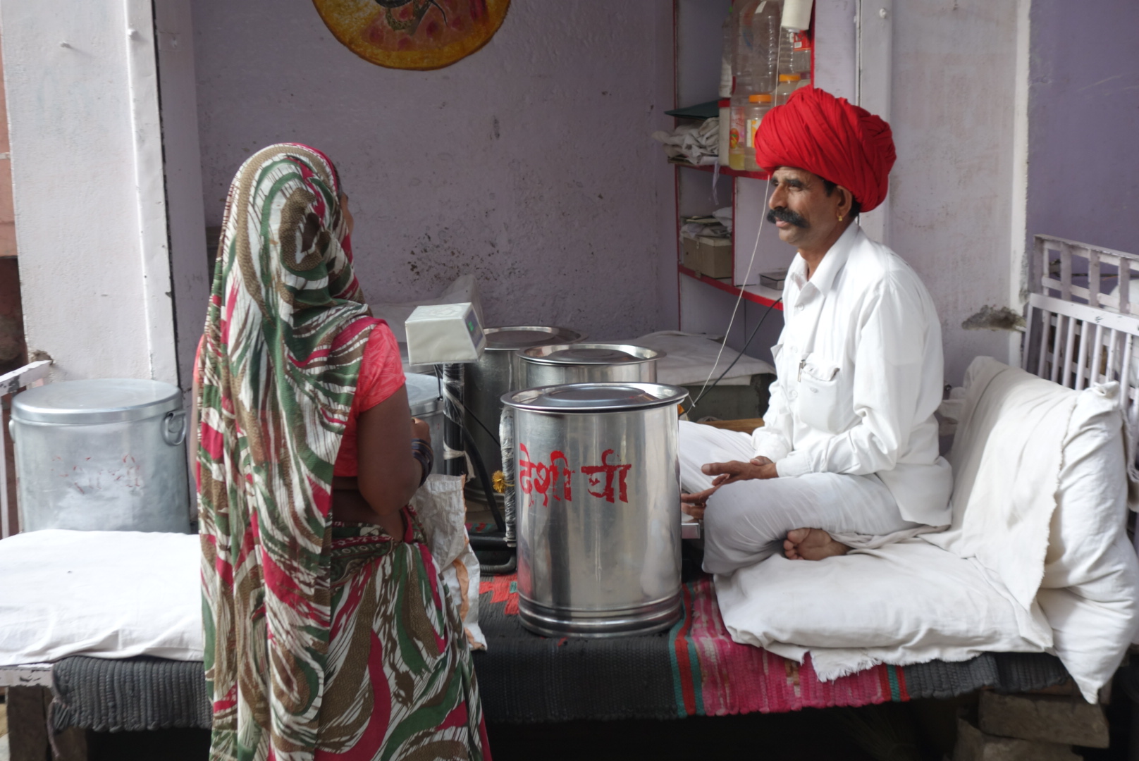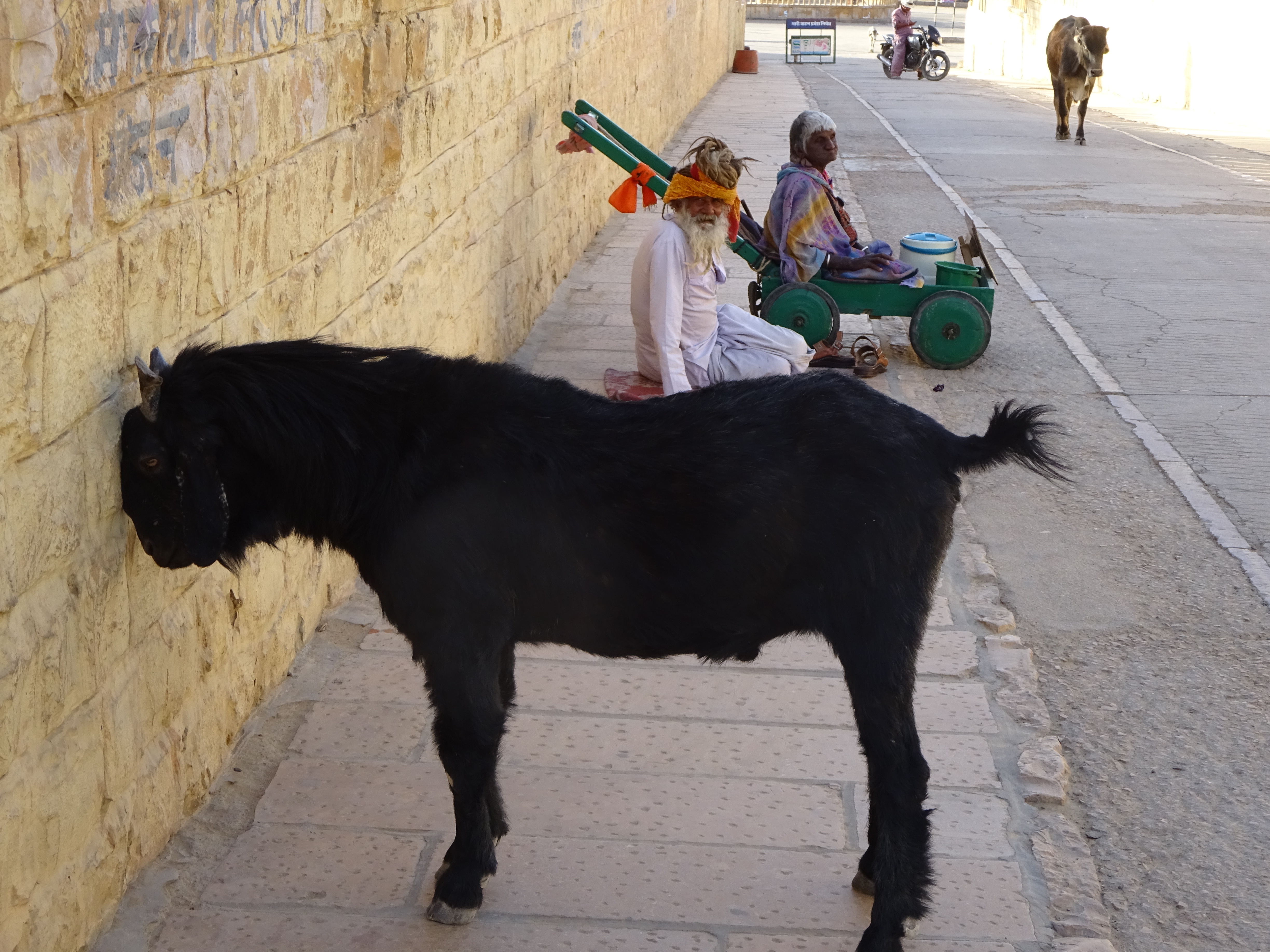 Back down through the town, we visited the Raniji ki Baori, a massive engineering structure built down into the ground. It’s a 46 metre deep step well that ensures that even in the driest of years, the town had a water supply. Although, drinking from it now might not be life enriching experience. We ambled back through the Bazaar. An old guy is ironing his pants on the floor, using an enormous cast-iron iron full of glowing charcoal. He must have a right arm that can lift trucks. Goats pirouetted on shop roofs, red turbaned black moustachioed dudes sold lassi and Jon made his first of many purchases, a huge brass milk churn which was not a welcome addition to the crowded back of the car, until I designated it the in-flight emergency commode and spittoon. While Jon bartered, a holy cow snuffled up behind Navendra and then used him as a snot rag. Bless you my son.