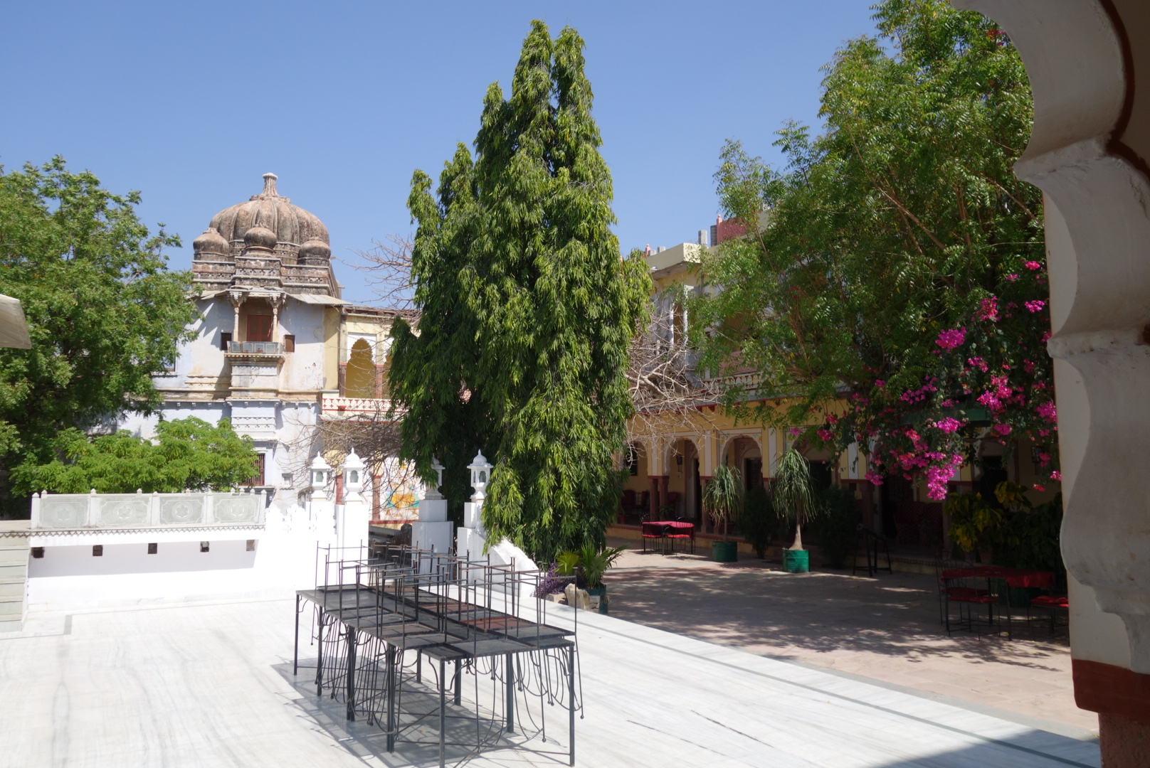 Ramdev manoeuvres through the old town gates, past cows and hairy pigs that dam the evil smelling drains. Somehow, in the chaos that is a single lane, multi-directional, high street, Ramdev pulls off a 3 point turn and blocks an alley from which a bunch of guys appear and grab our bags. Fortunately they work for the Dev Niwas hotel and we are ushered into a beautiful, peaceful courtyard. Fountains tinkle; plants scent the air and colourful mosaics adorn the white walls. It’s beautifully restored with splendid rooms and a rooftop view of the Fort.