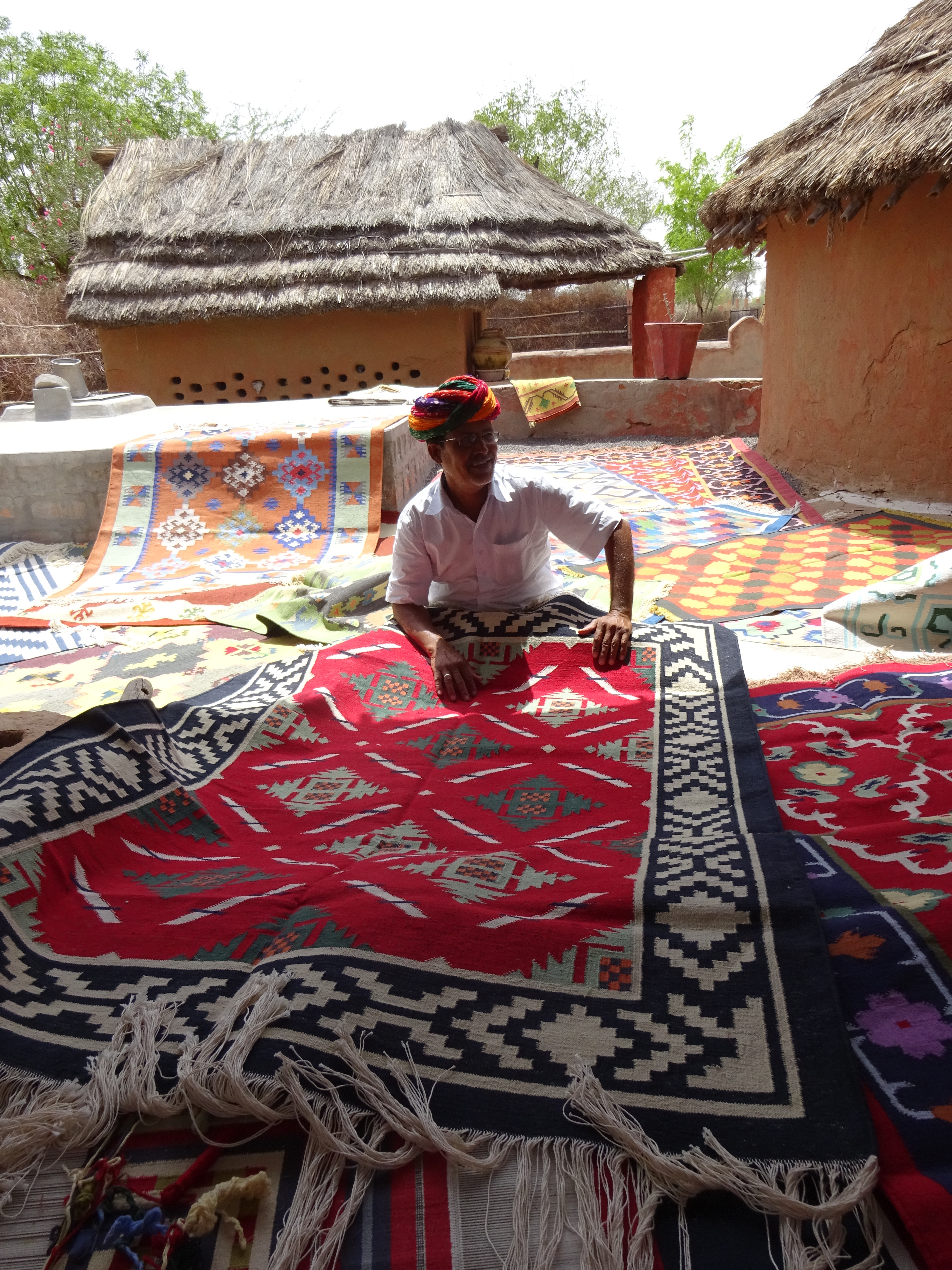To Jodhpur, where we met our guide Ragghu about 30K outside of town. He took us to several small villages out in the desert, which are known as the Bishnoi. 29 tribes who form a variety of communities, some of which are known for specific crafts. Do you smell a sale here? We started at the Potters and, as Dori and I are suckers for terracotta, we got some really cool stuff. On the way to the next village we spotted 3 separate Black Buck, which are a really beautiful Antelope and which Ramdev had never seen 1, in 17 years of doing this trip. There was also a small lake with Cranes, Spoonbills and 2 of the cutest little Owls sitting just feet away from us. The next village was the Dhurries. The boss here was fabulous. Doris’ mantra this holiday had been, “We will not buy a Dhurrie”. – We bought a Dhurrie. This guy could have sold us used dishcloths. He claimed that his house was made of cow poop, that he learned his English from the BBC World Service and that he couldn’t read or write, but he could make us laugh and use a satellite Visa card reader at the same time. And Jon and Liz bought a Dhurrie. Suckers.