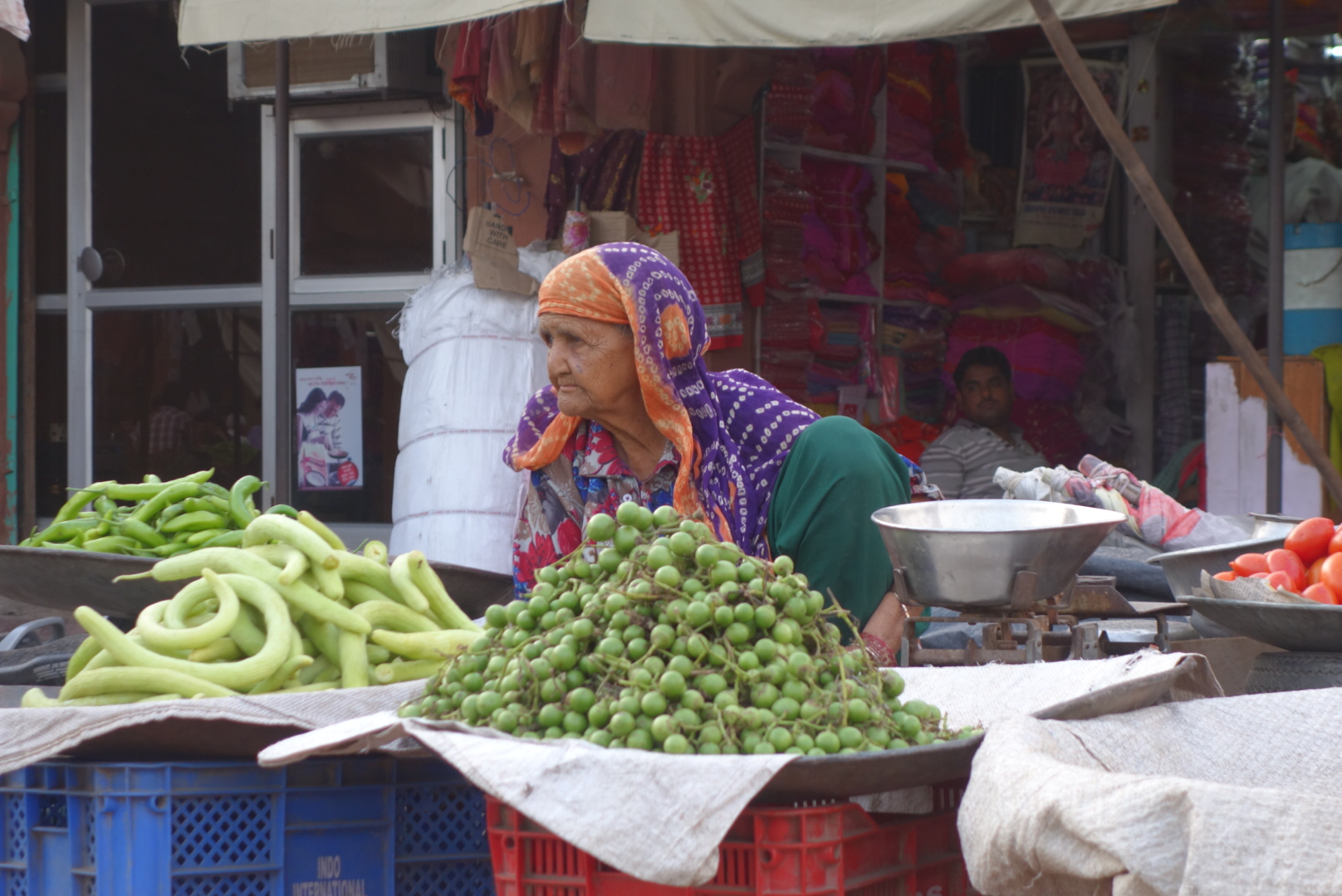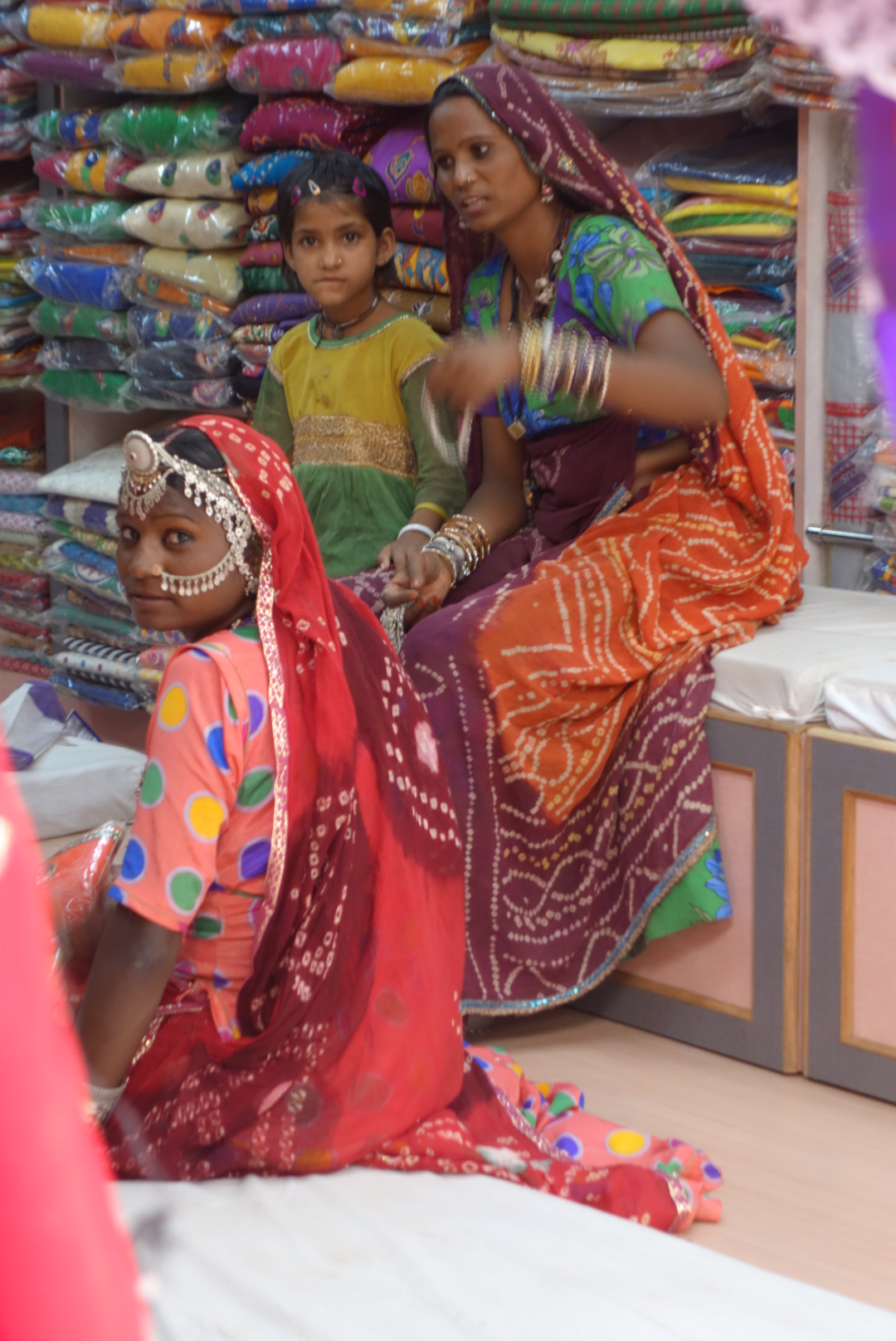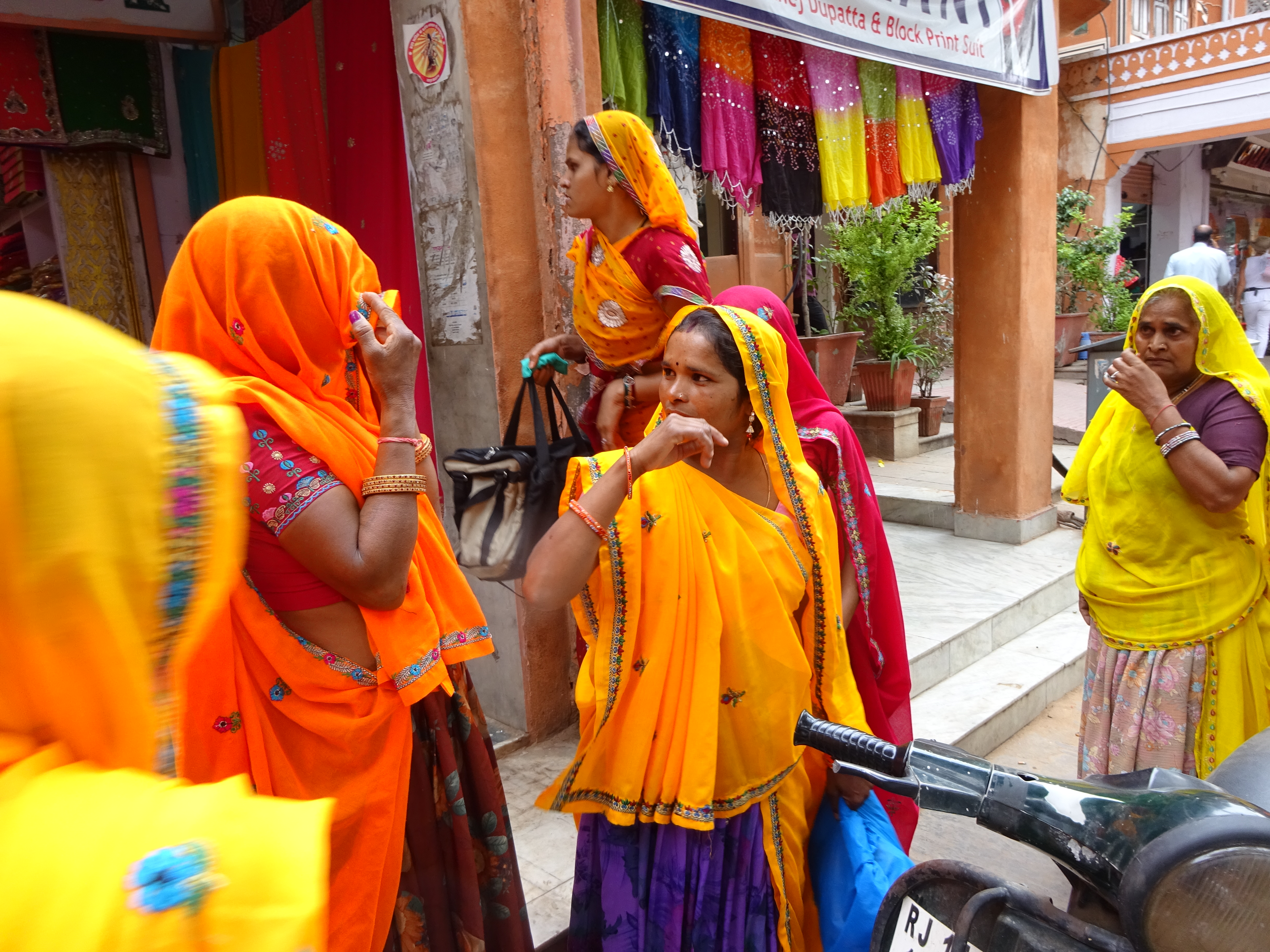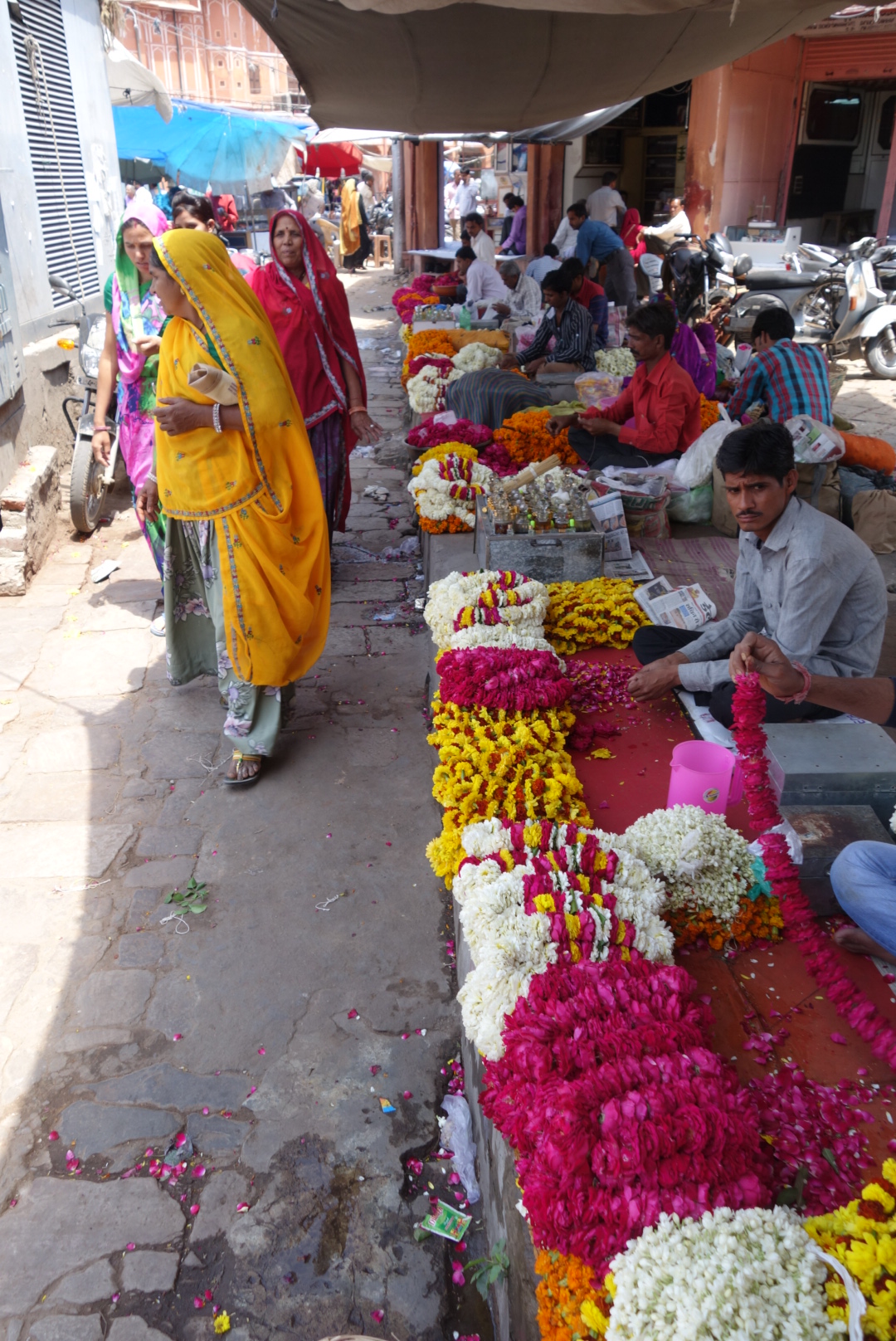 Ramdev dropped us off back in the town centre and we wandered markets full of flowers and garlands, the silver bazaar, where farmers in white turbans, smoked hashish and bought silver bracelets to clamp on the wife’s arm, their form of banking. Groups of women sitting on the floor round guys weaving intricate braids with their toes. Sari shops bursting with colourful saris, and bursting with women bursting out of their colourful saris, so kaleidoscopically bright it hurts your eyes. We settled for beautiful, hand blocked cotton pareos, that were just ridiculously cheap. And every textile shop on every street had just the tablecloth you were looking for, except they didn’t. The pressure to come in and ” look, just looking, looking is costing nothing, look, how beautiful, you want? you not want? what you want? I have. please, just look, so cheap”. It gets really wearing and eventually there is nothing for it but to go back to the hotel and get a beer.