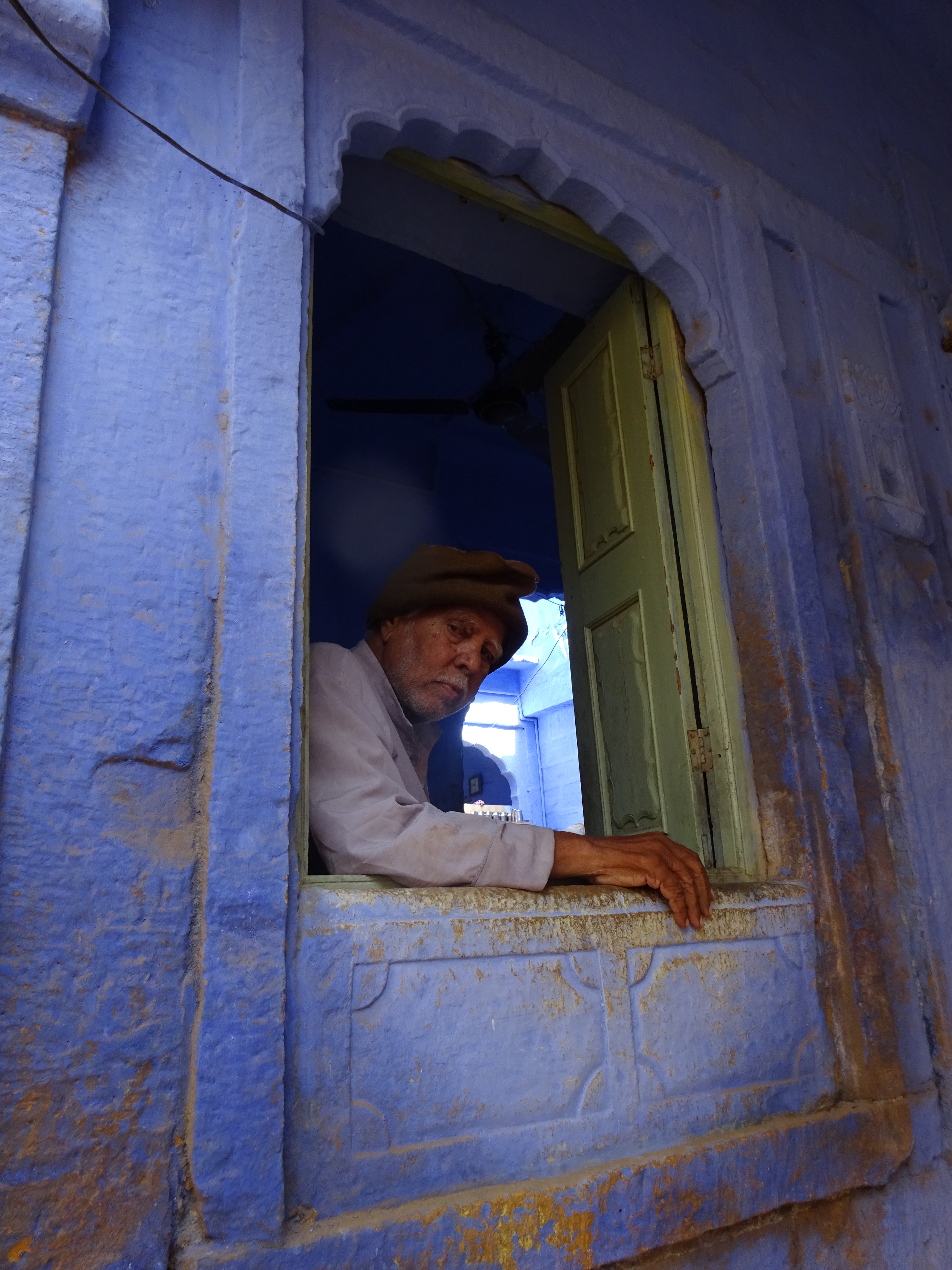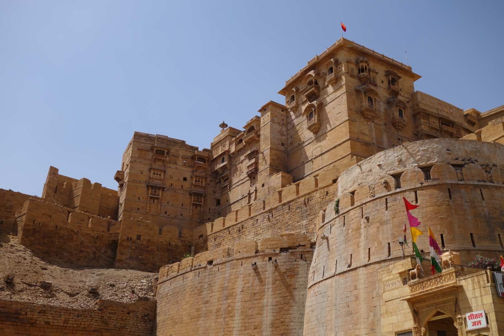 Out of the desert rises a huge rock, houses surround it, washed up around its base like flotsam, but it still looks impressive. A Fort encompasses the entire top. It’s not tall like Mehrangarh, it’s low and contoured to the rock, sort of Star Wars meets Lawrence of Arabia. We park Ramdev at the gates, load up 2 Tuk-tuks with bags and us and helter-skelter upwards through narrow winding alleys. People have to climb into houses to let us pass. Only the inexorable cows can cause us to detour until we arrive, breathless, at the Victoria.