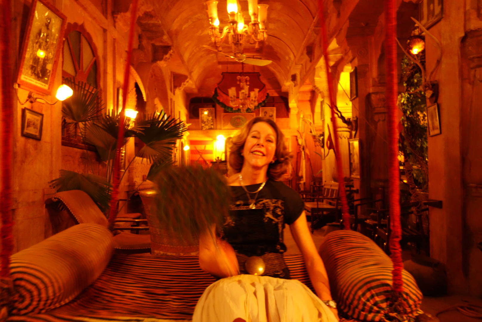 As is the case in most of these Palace hotels, no two rooms are the same. Ours didn’t qualify as a room, it was more of an estate. 4 poster bed, arches, niches, study, boudoir, dressing room, divan, whatnot and a bathroom big enough for Quiditch, with one of those massive baths on legs. We ordered G&T’s and, after a luxuriate, headed down to dinner. There is a fine dining room, straight out of the Ritz, but we settled for the main room which is just as palatial. This was to the great delight of the waiters, who proceeded to treat us Royally, even to the extent of dressing Jon in a Maharajas Turban and betrothing him to a beautiful Indian Lady on the adjacent table. I don’t know if Jon thought this was a joke, but as far as I could tell, he still owes for 2 elephants.