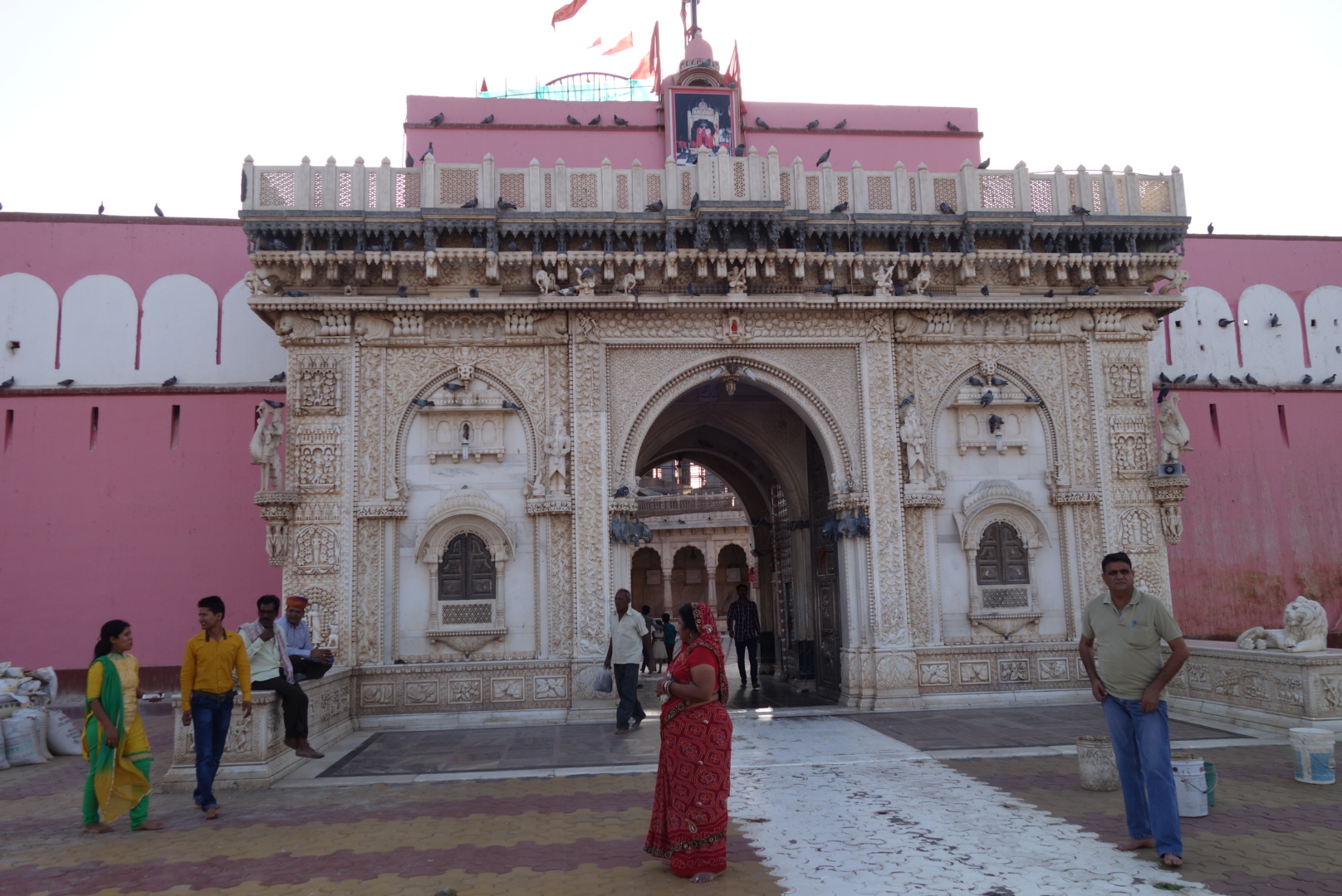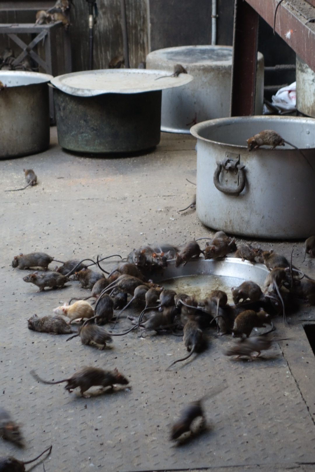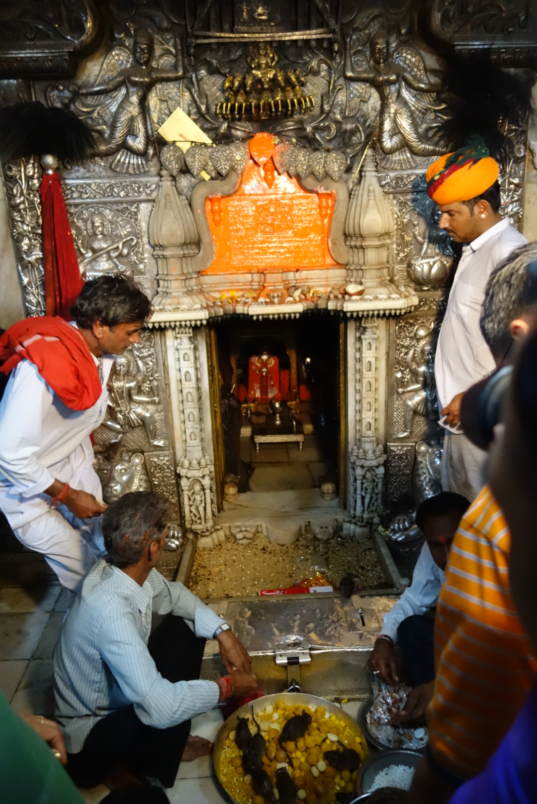 Then on to Karni Mata Temple. Best known as the Rat Temple. Suffice it to say that this is a Temple full of Rats. There were almost as many stories about ‘Why?’ as there were rats and, there is a shed-load of rats. As with most temples, you take your shoes off before entering, after which you are walking in rat poop. It’s not of great Architectural significance and its only real claim to fame are the residents. They gambol all over the place, right up to the threshold but never cross it. The Temple keepers feed them and they get into everything including the votive offerings to the Gods. There are huge pans of coconut milk around which they all sit with their bums in the air, lapping contentedly. There are a couple of white rats which it is supposed to be very good fortune to see and we did. It’s bizarre and it says a lot about Hinduism and, based upon the human to rat ratio here, I am guessing that there are a number of Indian restaurants in Hong Kong that would qualify for Temple status.