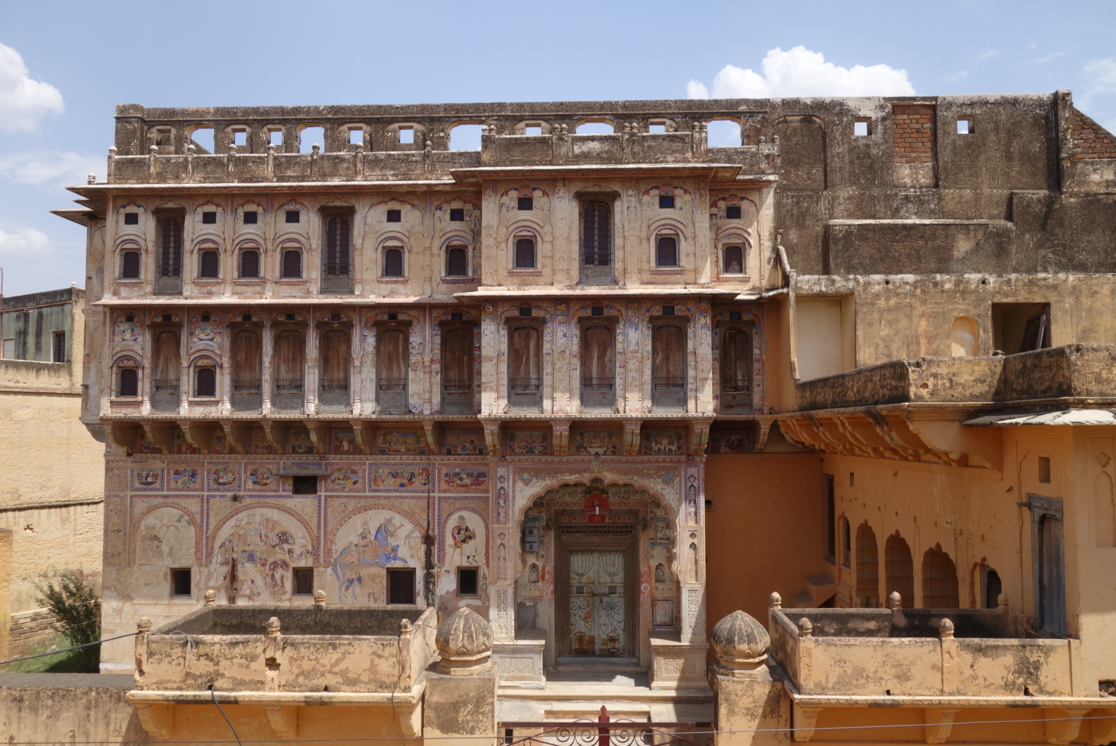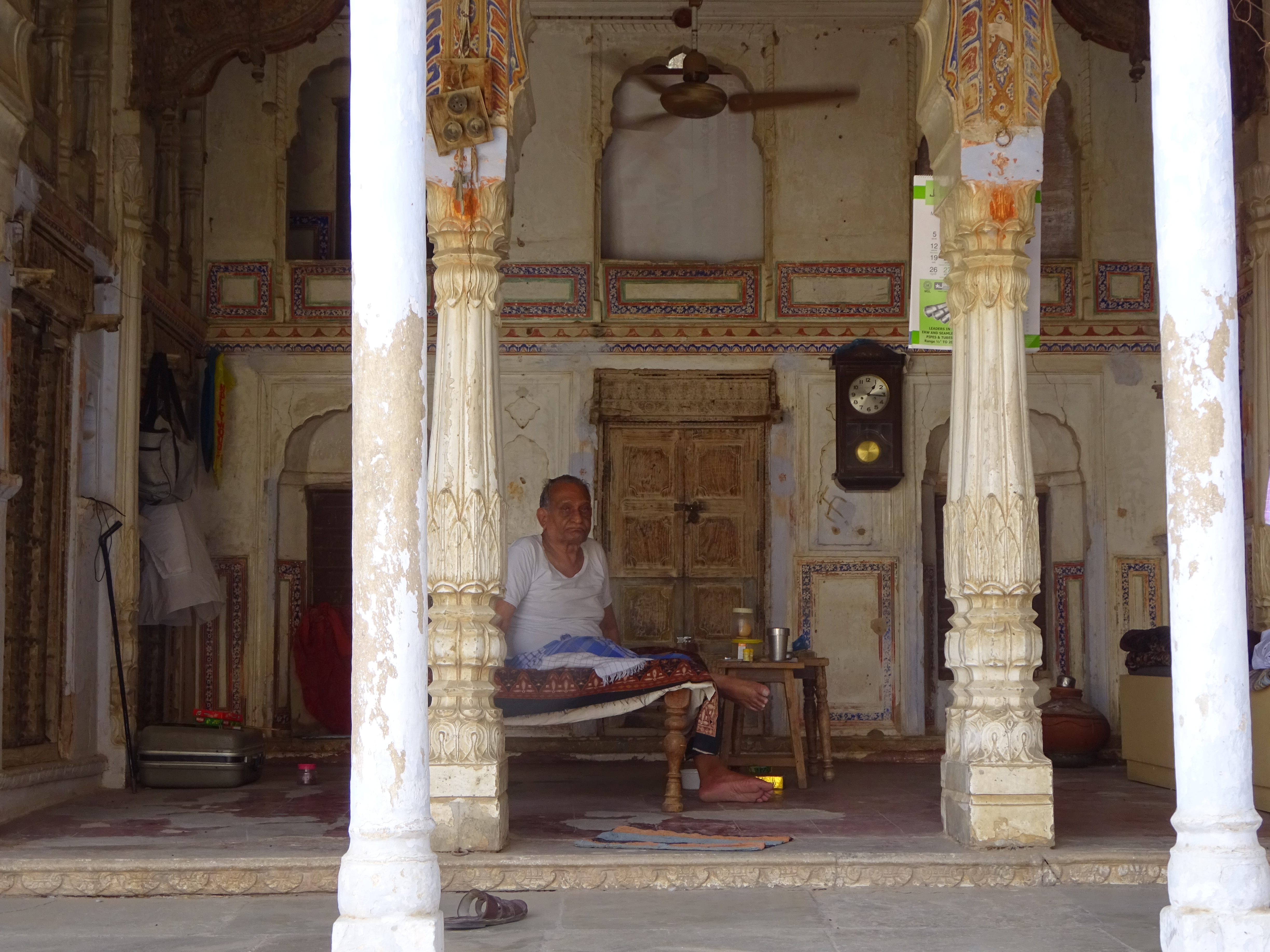 Shekhawati is a series of big villages whose entrepreneurial residents made good money from trading with the caravans on the old Silk Road, however, in time as the caravans reduced, they began to pose a commercial threat to the British East India Company. The BEIC was never a keen proponent of competition, so they pushed them out, but as transport was moving seawards, these guys went to Bombay and Calcutta and made it big time. They then thumbed their noses at the BEIC by sending cash back to the villages and building huge Havellis. Then it got into a competition as to who had the biggest Havelli and whose had the most frescoes. At some stage, the cash dried up or the kids just stopped bothering to come back to the old home village and they were abandoned. Now, these places are not ghost towns, they are very lively, but they are stuffed with ghost Havellis. Great crumbling edifices of past riches, full of cows and pigeons and squatter families who will show you round for a pound.