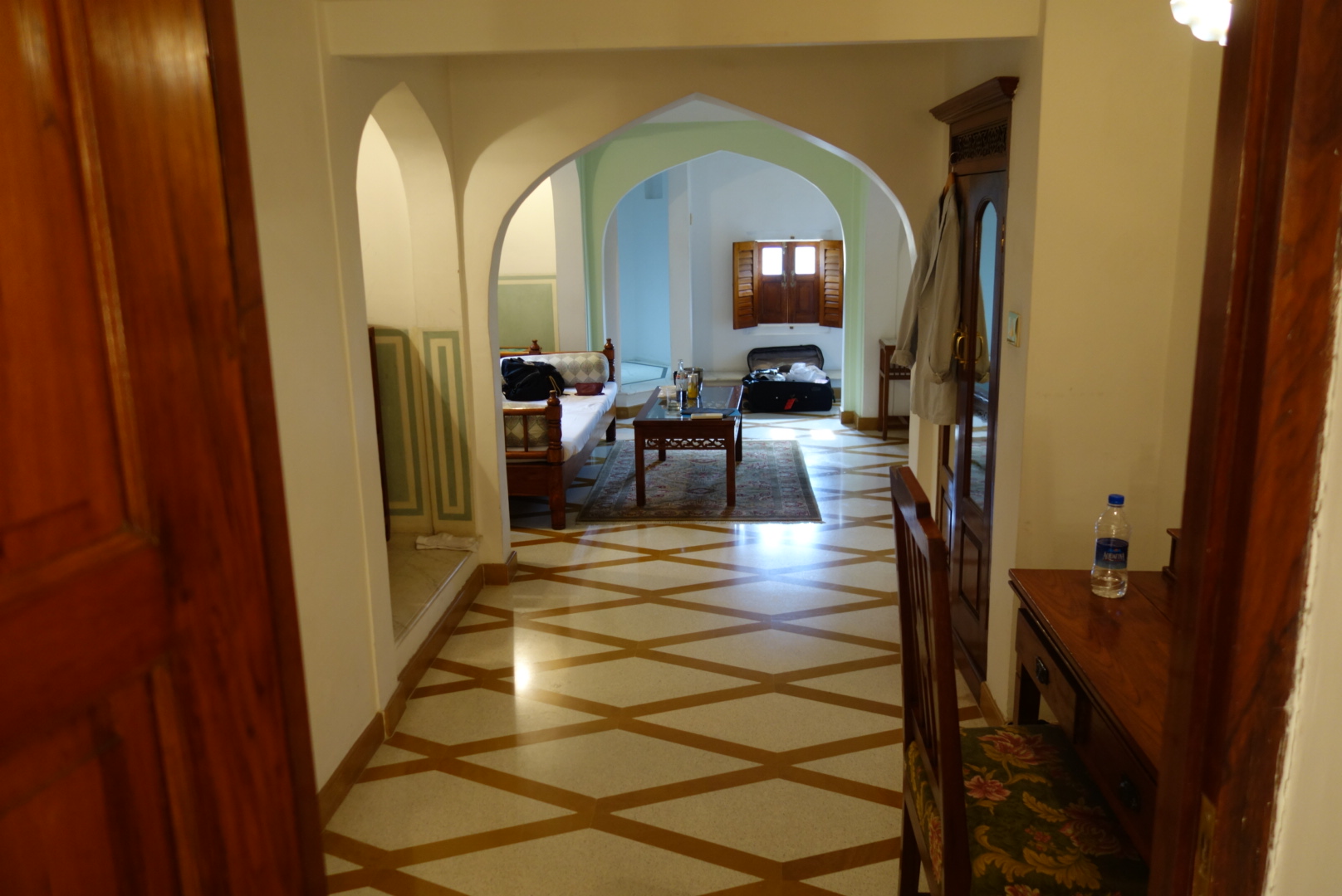 We turned off the main road into Samode. Tucked into a small valley, the village is shady and quiet. A cobbled street winds through it until, at the back of the village, a huge gated wall blocks off the entire valley. We drove in and climbed through a series of even bigger gates until we entered the courtyard of the Samode Palace Hotel. I’m told that they used this for the filming of “The Far Pavilions”, I’ve never seen the film, but I could believe it. Fronted by a large, lush garden, the Palace climbs the valley head in a series of steps, each with the traditional courtyards between becoming increasingly private. The place is meticulously maintained and operated and is totally fabulous.