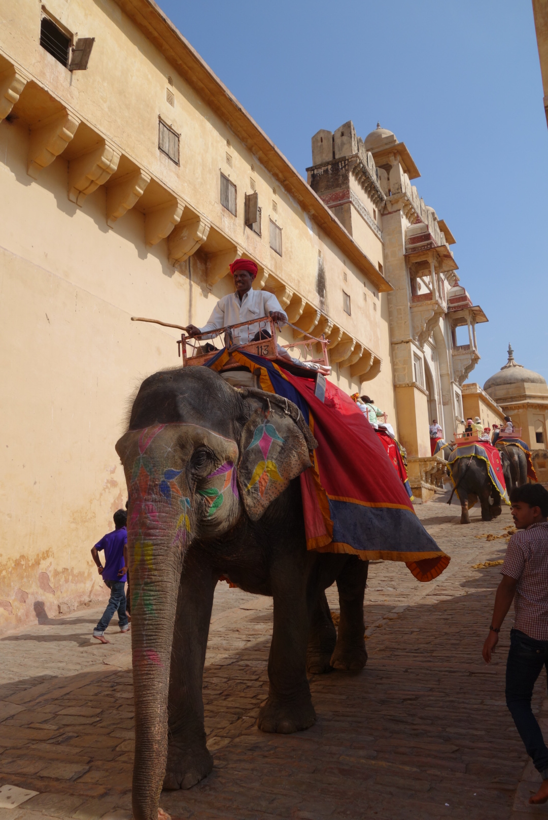 The main reason for Jaipurs’ attraction is the Amer Fort. Situated above a valley lake about 7K outside Jaipur, this is the fairy tale Indian Fort. Bold and impressive, it still manages to be mysterious and elegant. Crowds arrive early morning to take the Elephant ride up the winding road. Even though the Elephants are only allowed to make 3 trips/day in the morning cool, we were still not cool with it and preferred to walk. Instead, taking lots of photos of the magnificent painted beasts (Elephants and Tourists both) and it made a refreshing change to be stepping in Elephant poop as opposed to cow.