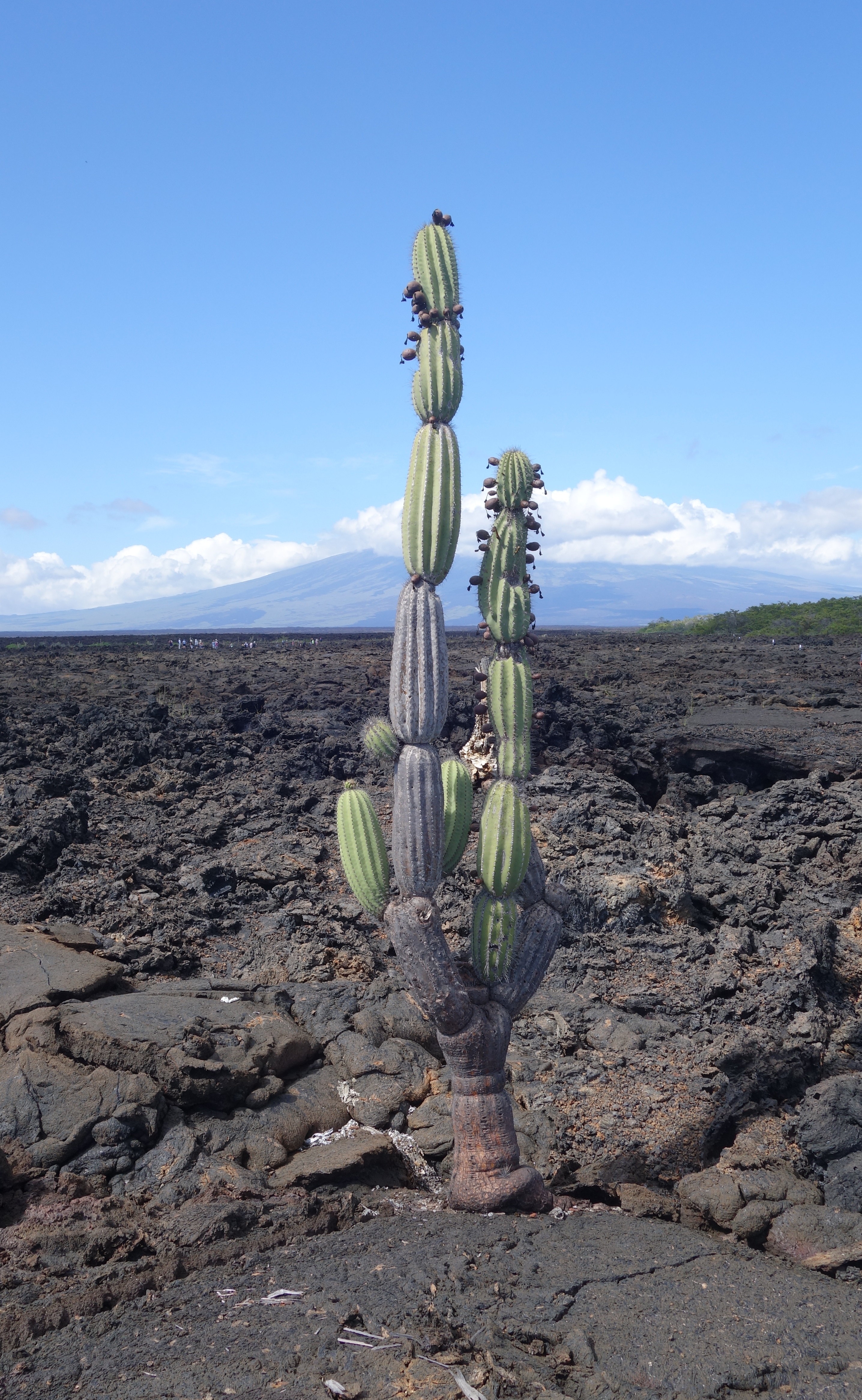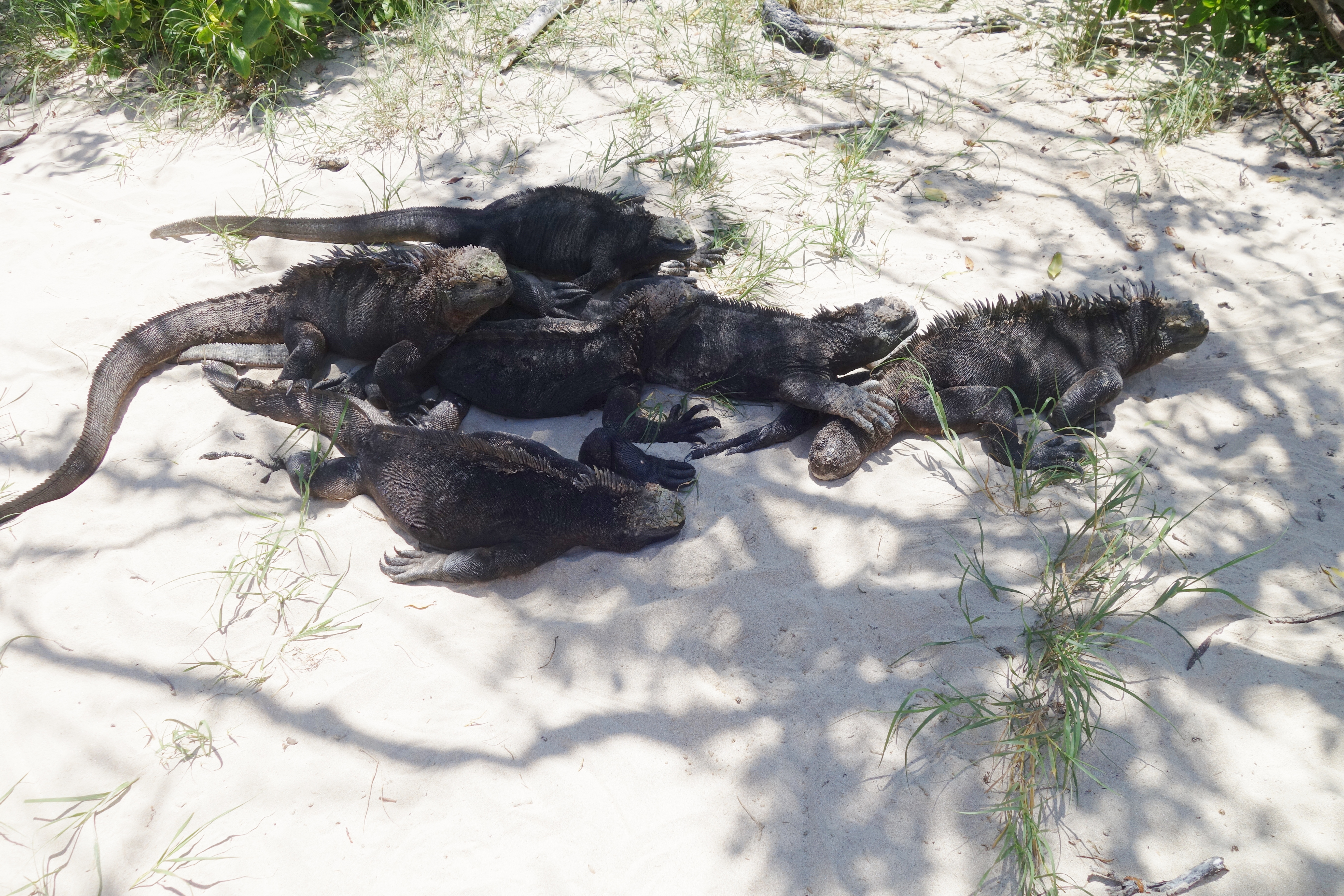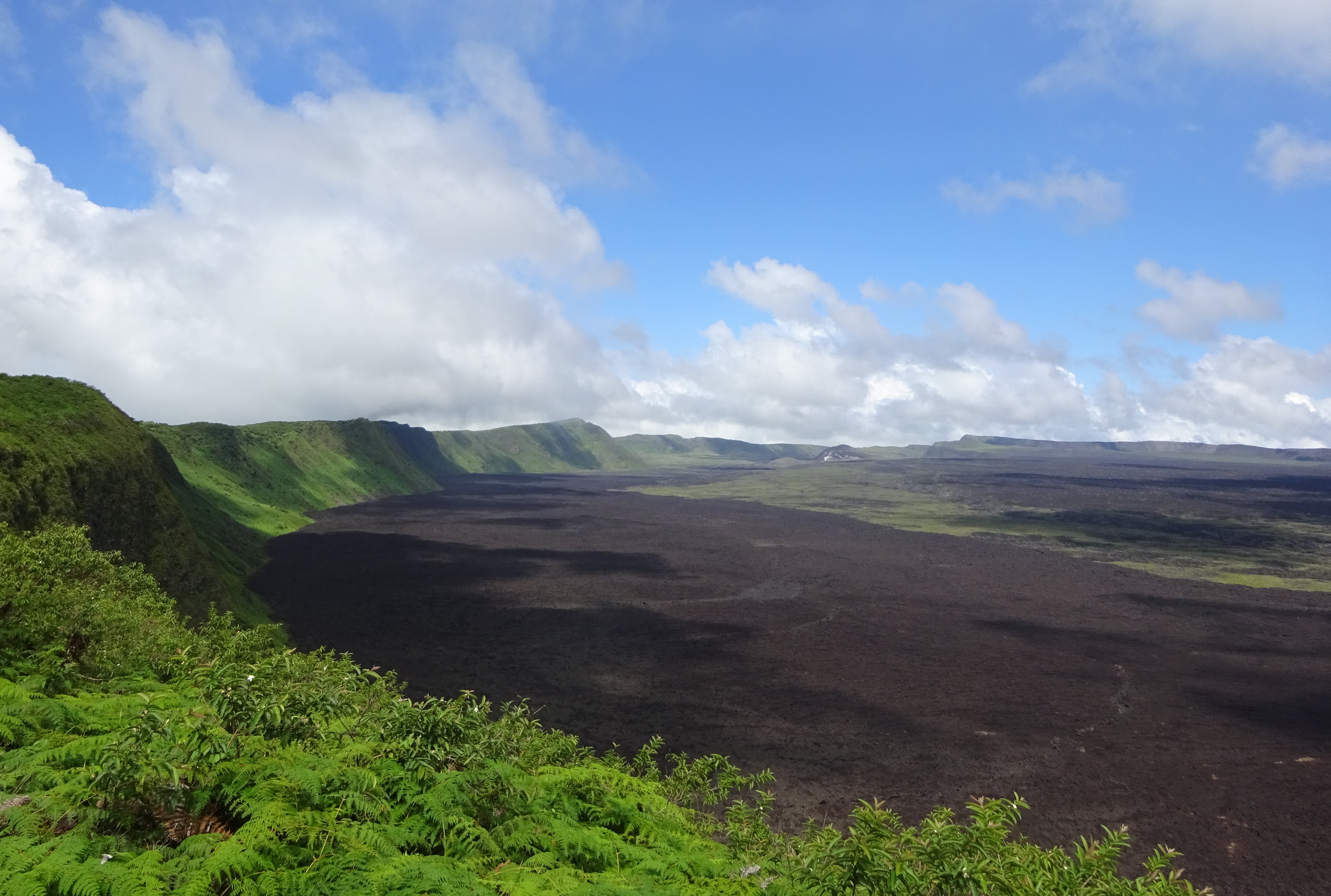 A bus takes us up the Sierra Negra Volcano, leading to a good aerobic walk through grass and woodland to the caldera rim. Sierra Negra is quiet now, but not long since, an eruption caused a massive lava flow which was mainly contained. It still steams in places but it is mainly just a vast sea of black, fringed with emerald bluffs, majestic and beautiful. Very Jurassic Park. Contrast this with the beach where the heat hits like a hammer.