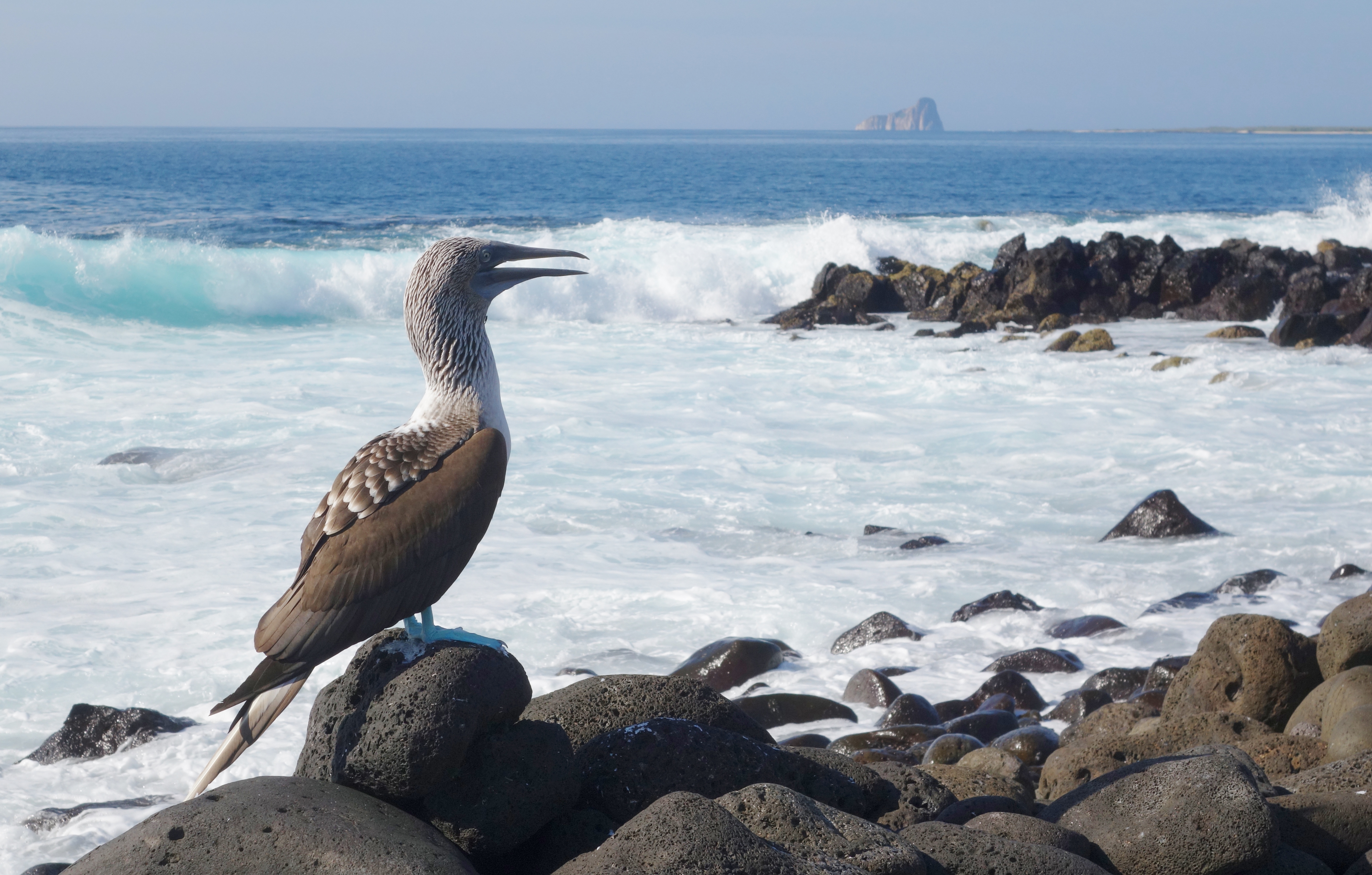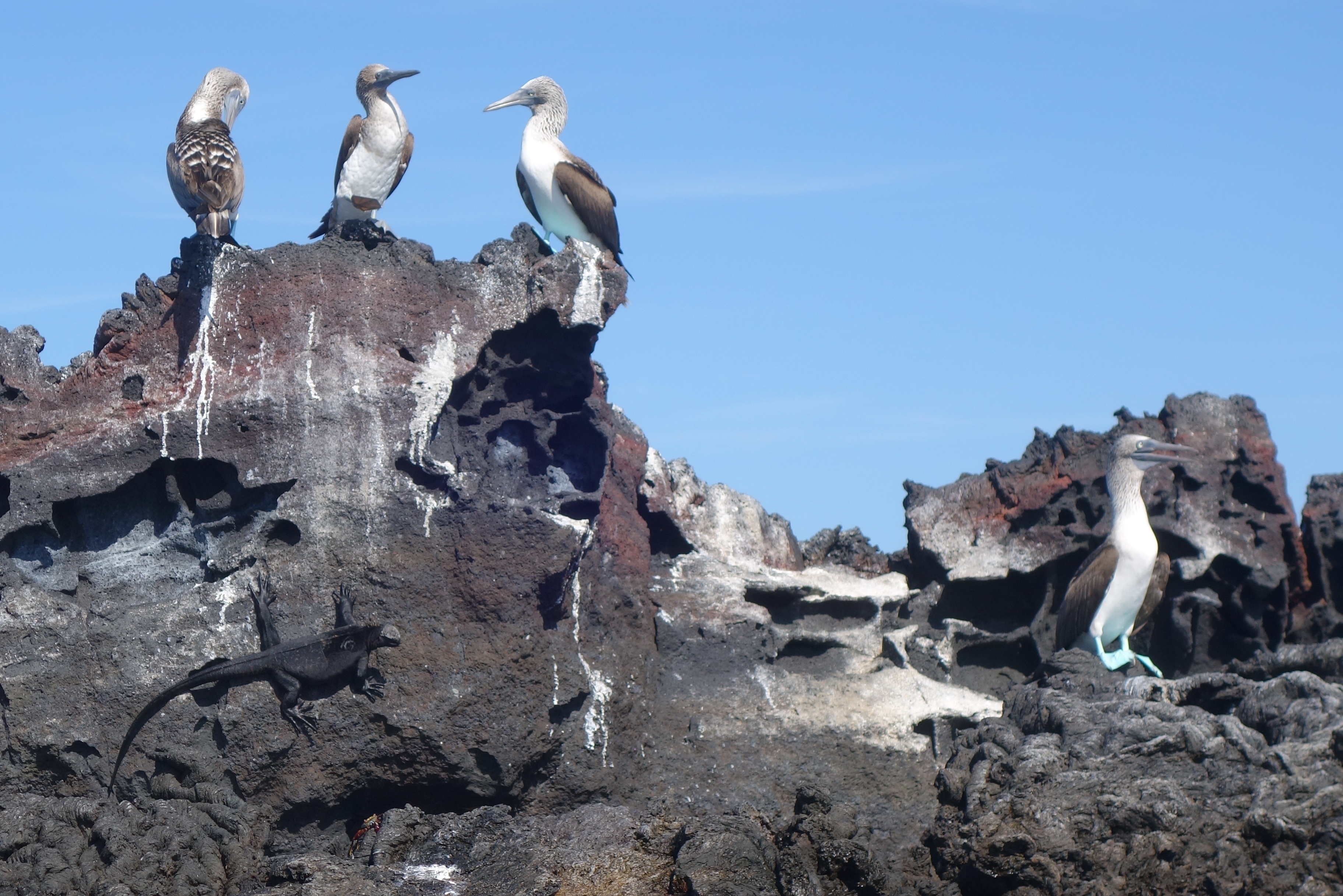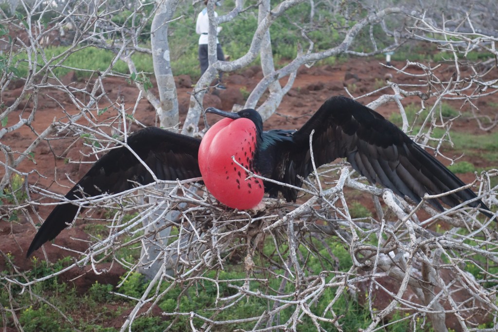 It’s not exactly a Garden of, and it is far from being perfect, but it is going to be our home for the next 7 days and we grow to love it. No sooner have we dropped our bags in our cupboard cabin, than we get to meet the rest of the guests, load up all 16 of us into the Zodiacs and head off to a small island nearby called Los Lobos, for a short walk featuring Frigate Birds. These look like large Pterodactyls, but the males have a bright red space-hopper attached to their throat which they inflate and then sit in the tree tops until some female takes a fancy. We also get to see our first Blue-footed Boobies, which are possibly the coolest dudes in town.