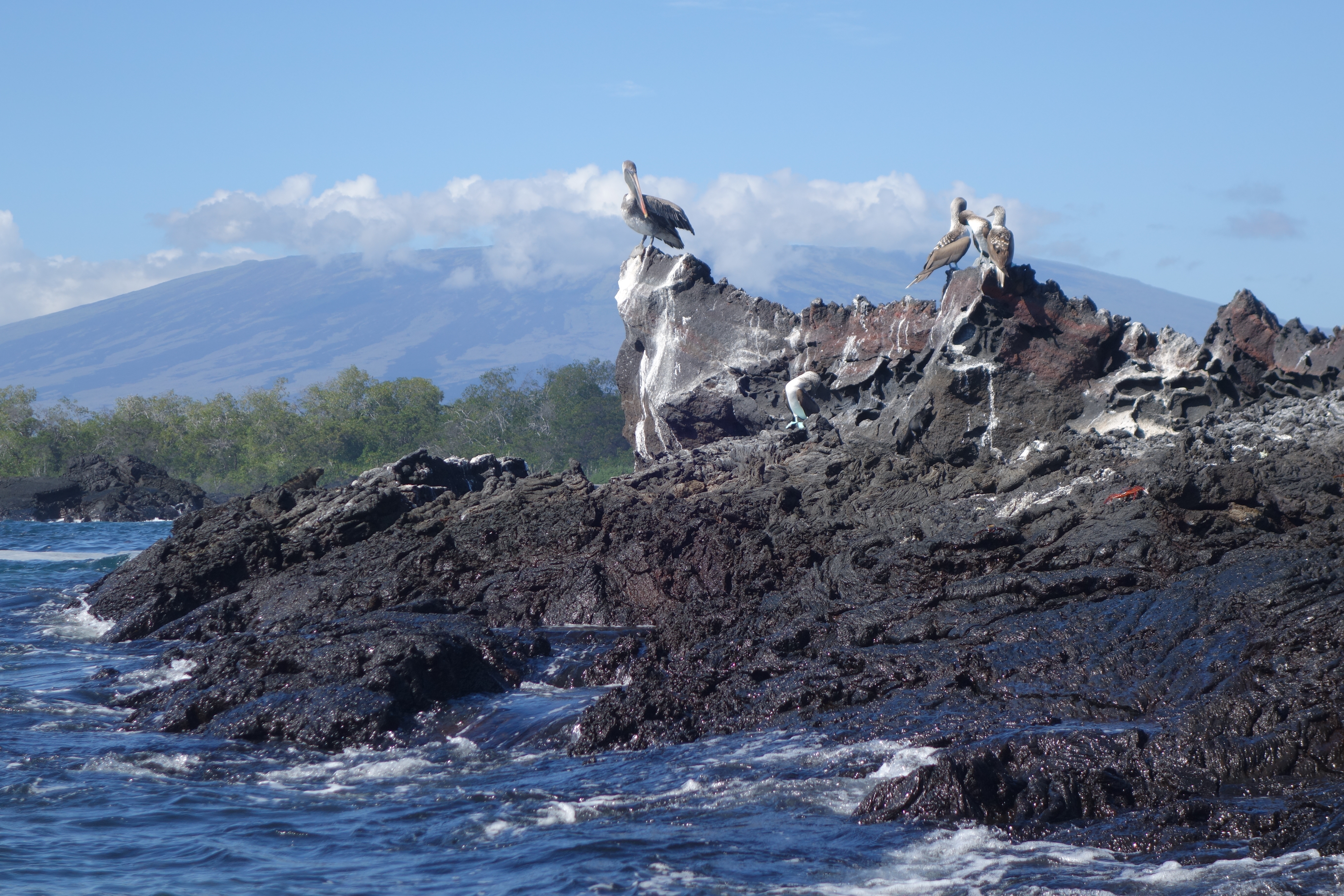 During lunch we sail on to Bahia Elizabeth for snorkeling and this time it’s time to suit up. The water is way cooler, thanks to the incoming Humboldt current, but we get to swim with Green Turtles. Onwards North to Tagus Cove, tucked between Isla Isabella and Isla Ferdinanda. There are rocky islets with tiny Penguins and flightless Cormorants.