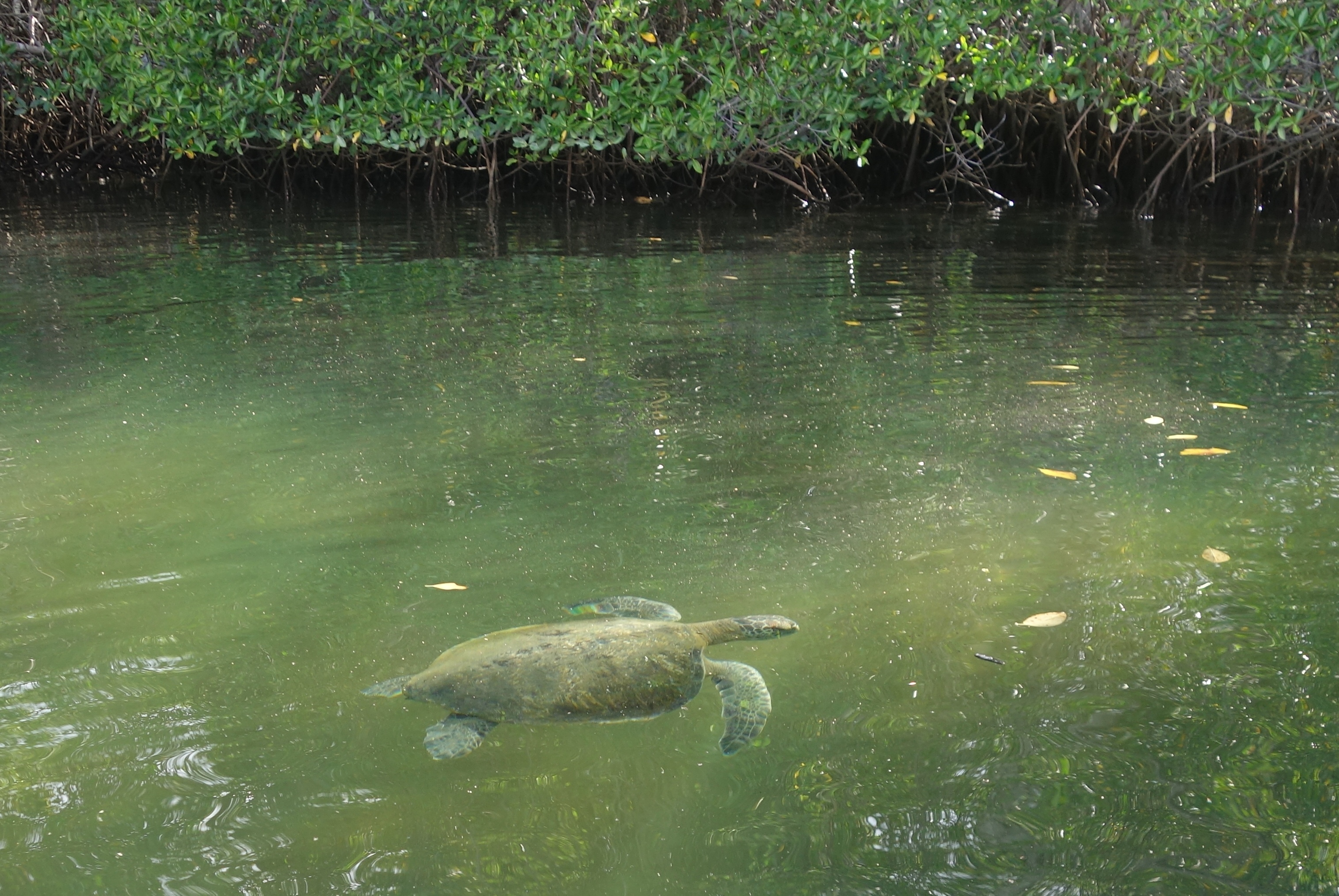 Eventually the Zodiacs float into a long, mangrove shrouded lagoon. The sea surface is a mirror and, at the far end, Turtles come to rest. The motors cut and we paddle through glass. Finches and Canaries sing their thing as all around us there is an underwater ballet as Turtles swoop and dive.
