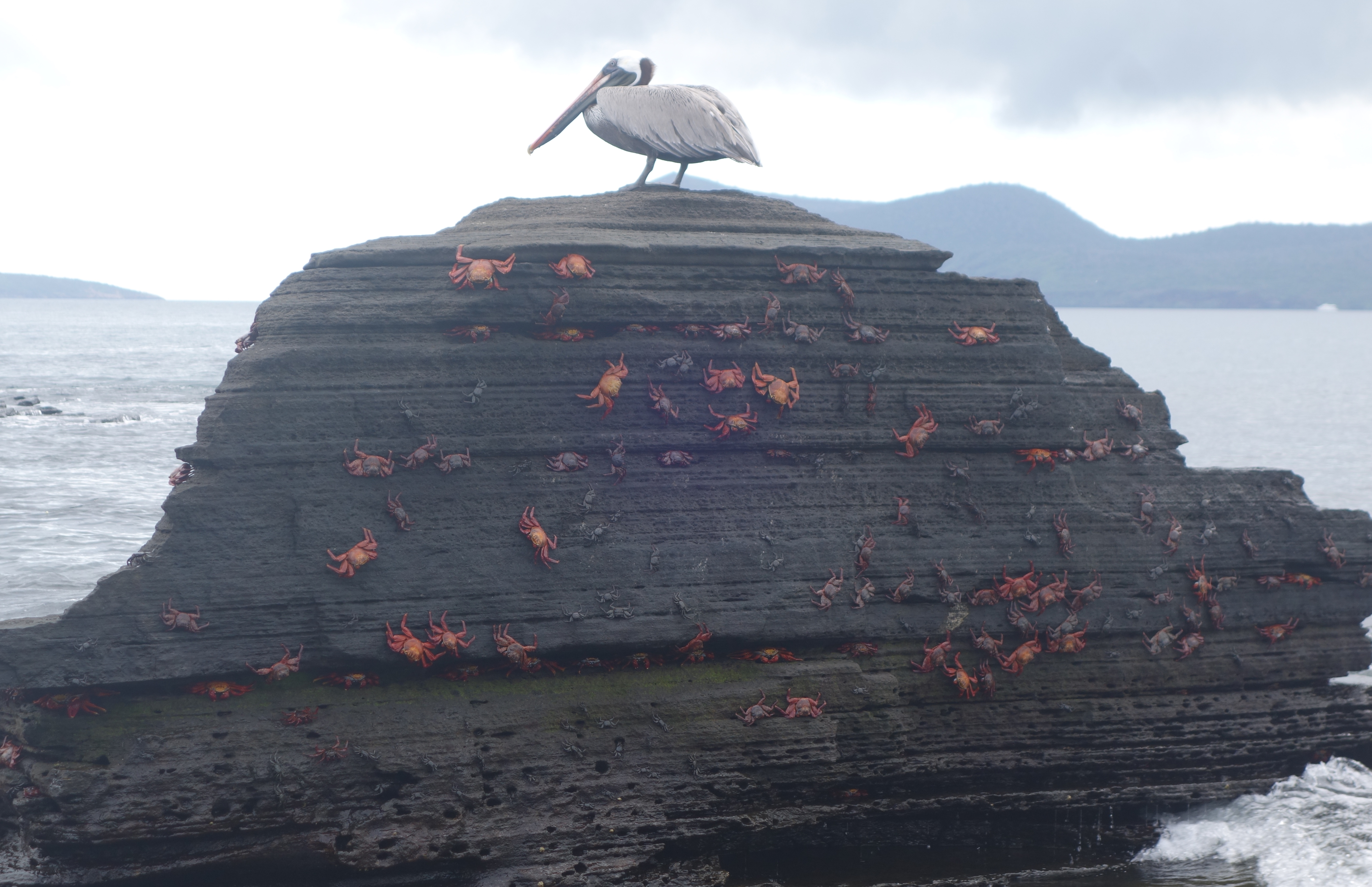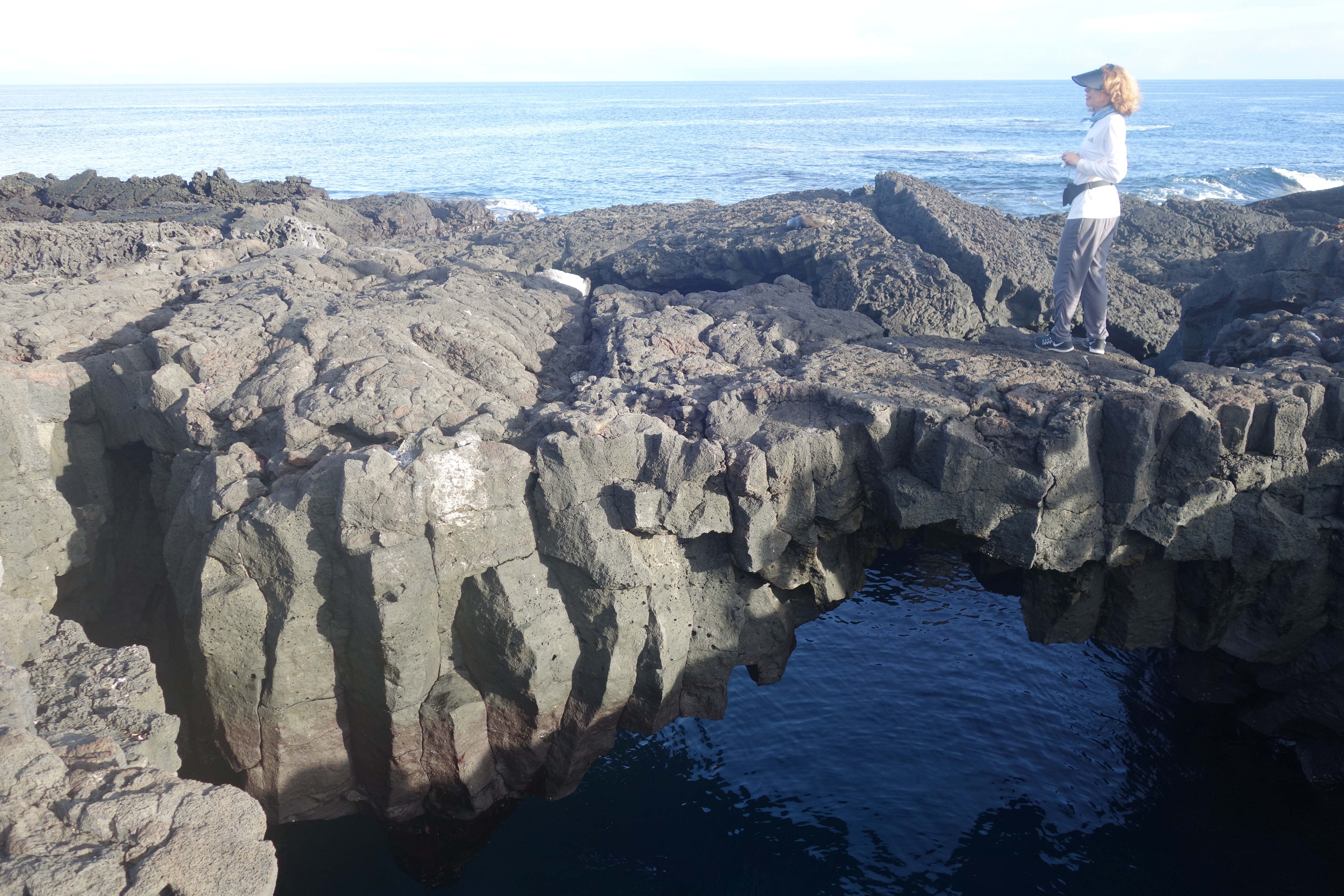 We land on more black volcanic rock, but this is much older so that there is lots of vegetation above the shoreline and the coastal edge is softly eroded into beautiful shapes with rock bridges crossing small canyons that funnel the booming tide into white water geysers. Fur seals, Oyster Catchers, Herons and a different species of Marine Iguana. This one is slightly browner. Whoopdedoo! Excited?.. Not exactly. But the rock formations are weird and wonderful and the tidal surge is enervating, so I’m happy. Down at the black sand beach, the striated rock has been carved into caves and bridges. Bright orange and red Sally Lightfoot crabs are plastered all over the sheer rock surfaces.