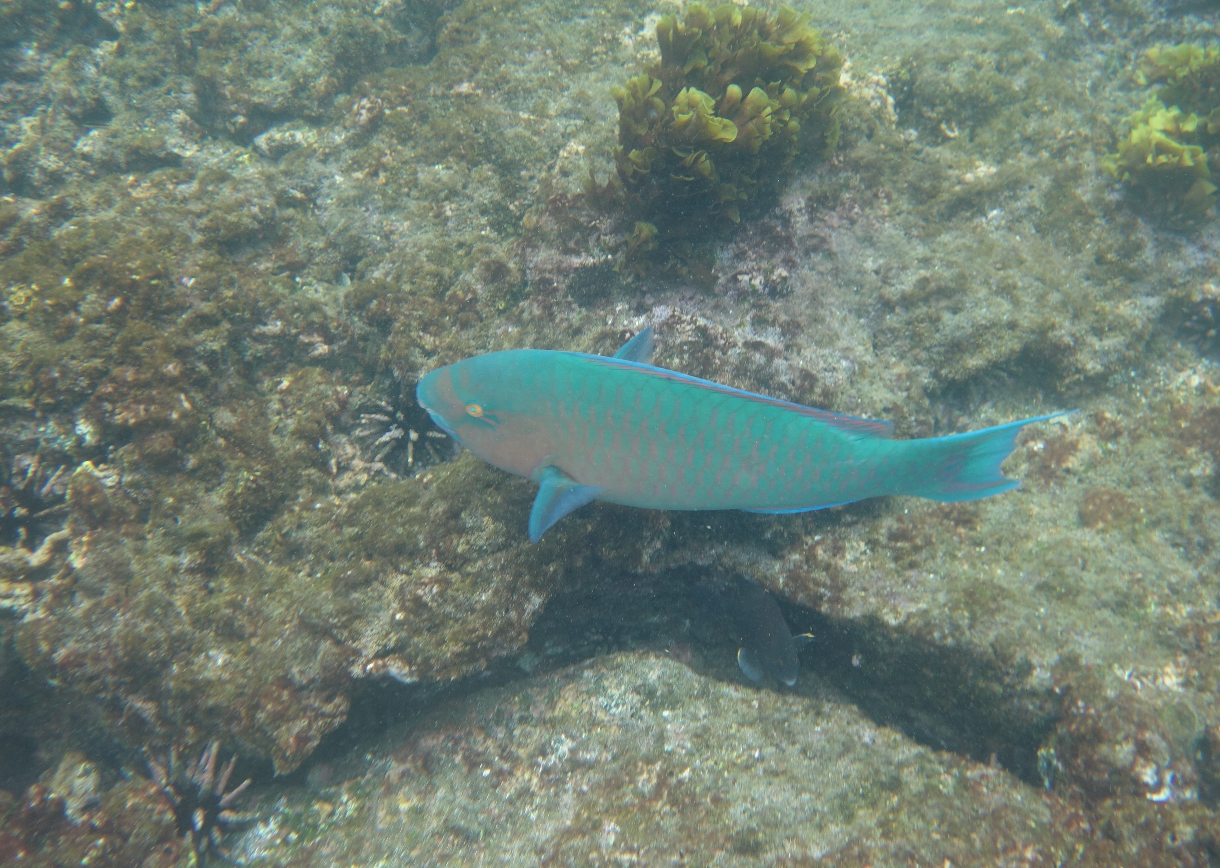 Boobies, Pelicans and Fur seals hang about and a big bull male comes across to check me out when I wander too close to his harem. As if! We snorkel off the beach along the rocky shore. Lotsa fishes and a huge spiral conch with a vermillion snail inside. We sail on to Isla Rabida which, by contrast, is red volcanic rock. It’s not our favourite and pretty boring, except for a beautiful, golden Seal pup, waiting for Mum to come back and fill his belly. We snorkel again and this time there are fields of violet and aquamarine Sea Anemones, gardens of Orange Cups (A coral I have used a lot in tanks, but never seen in the wild), the biggest turquoise Parrot fish in the World and a White Tipped Reef Shark. I am in the water with a Shark and have not filled my wetsuit! Result!