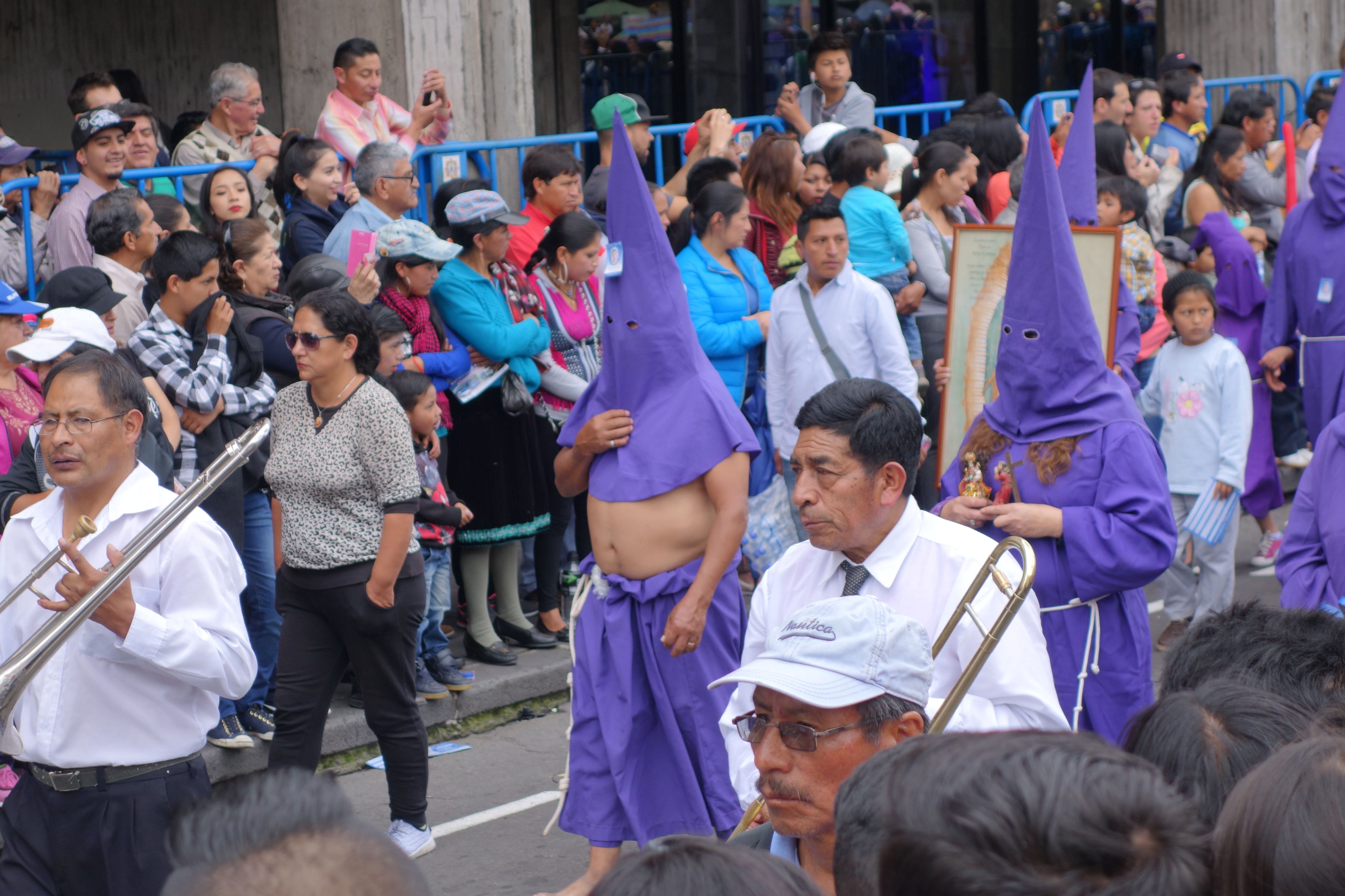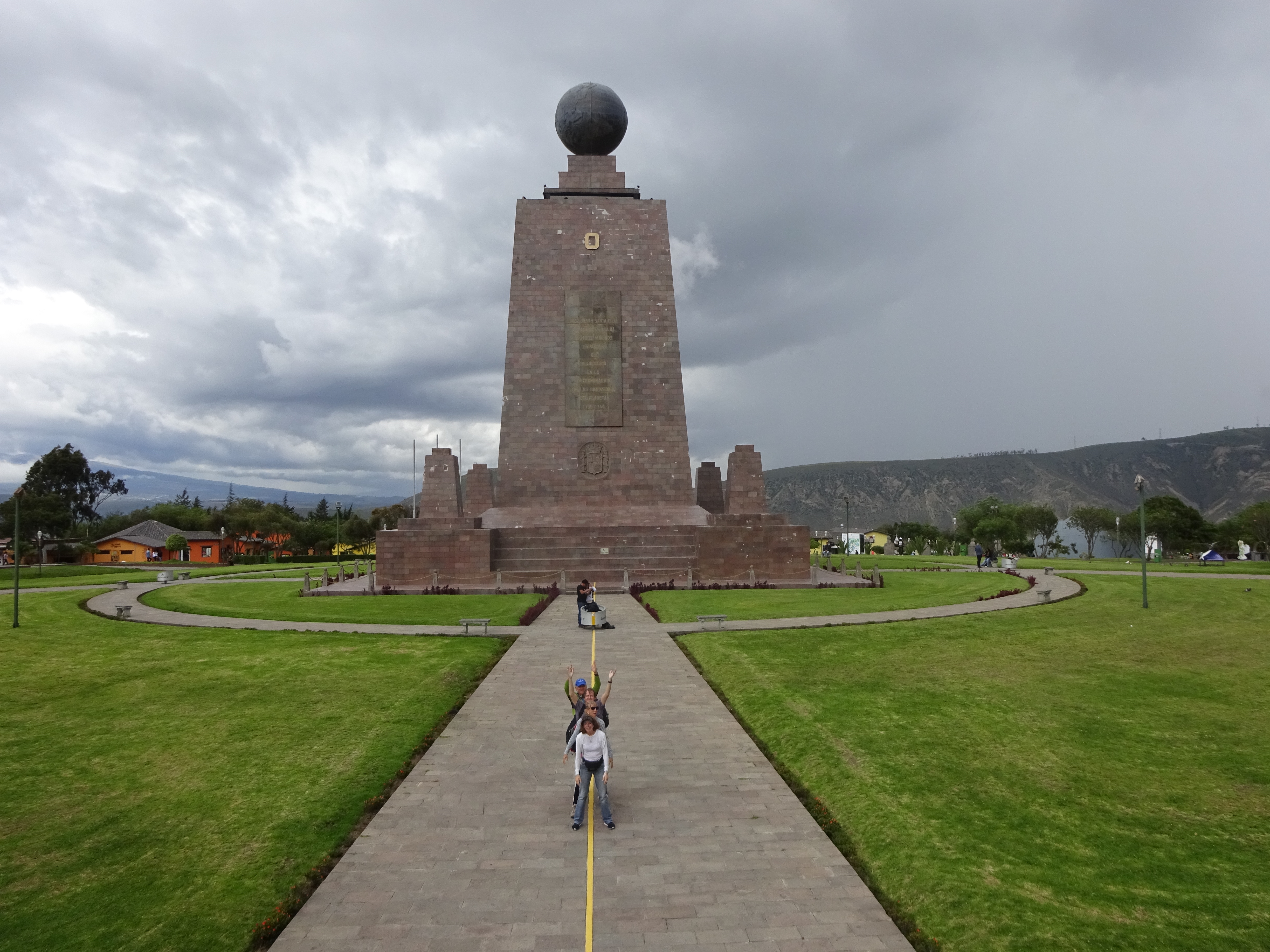 We also get to see the Holy Week procession (Be still my beating heart) where sweating guys and gals in purple KKK outfits accompany about 15 Jesus lookalikes carrying their crosses and with enough ketchup on their heads to baptise a Big Mac. We head out of town to see the Equator Park. A bunch of French Cartographers came here in 18somethingorother to establish the exact location of the Equator. They had 3 goes before settling on the exact location and building an enormous monument.