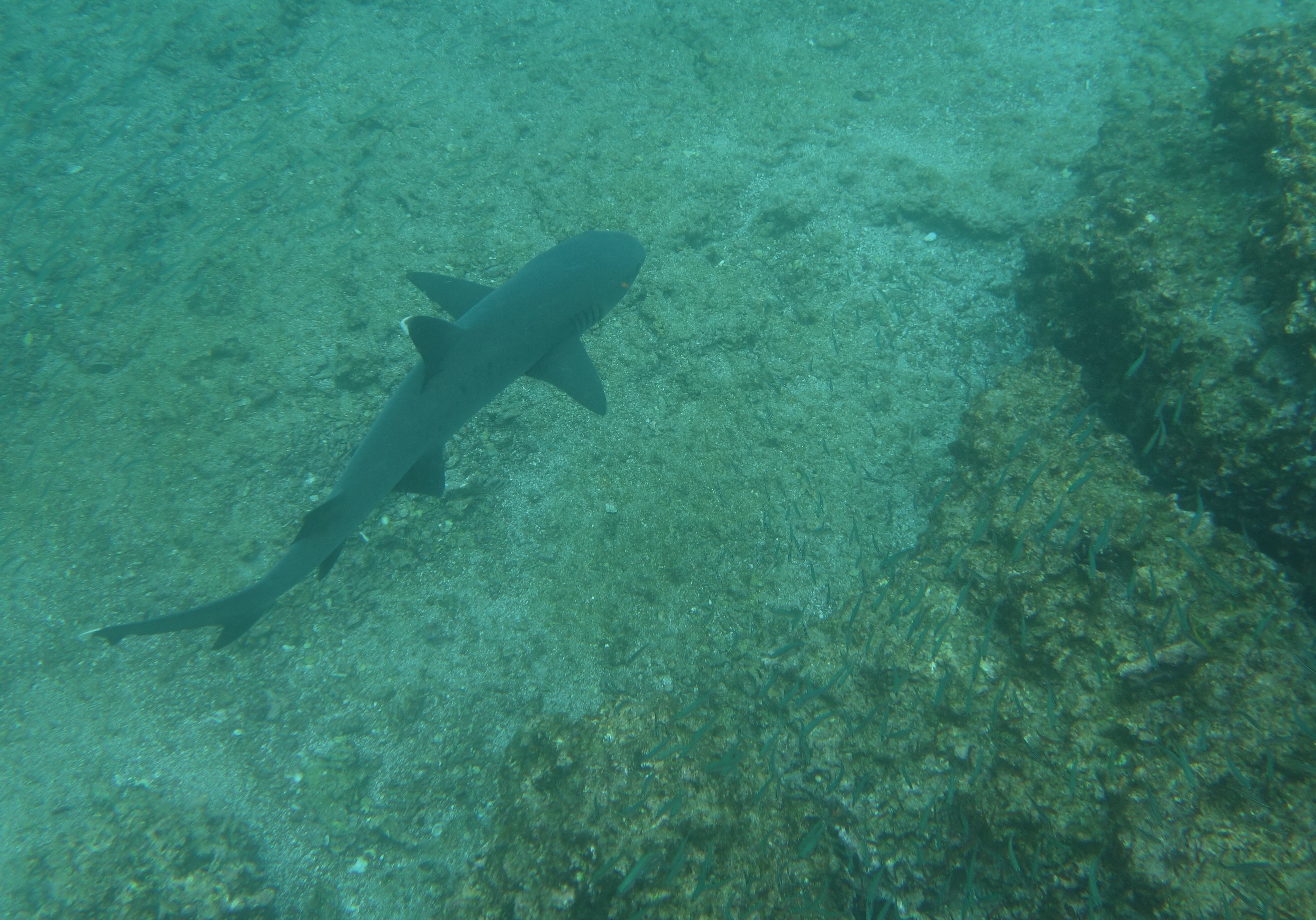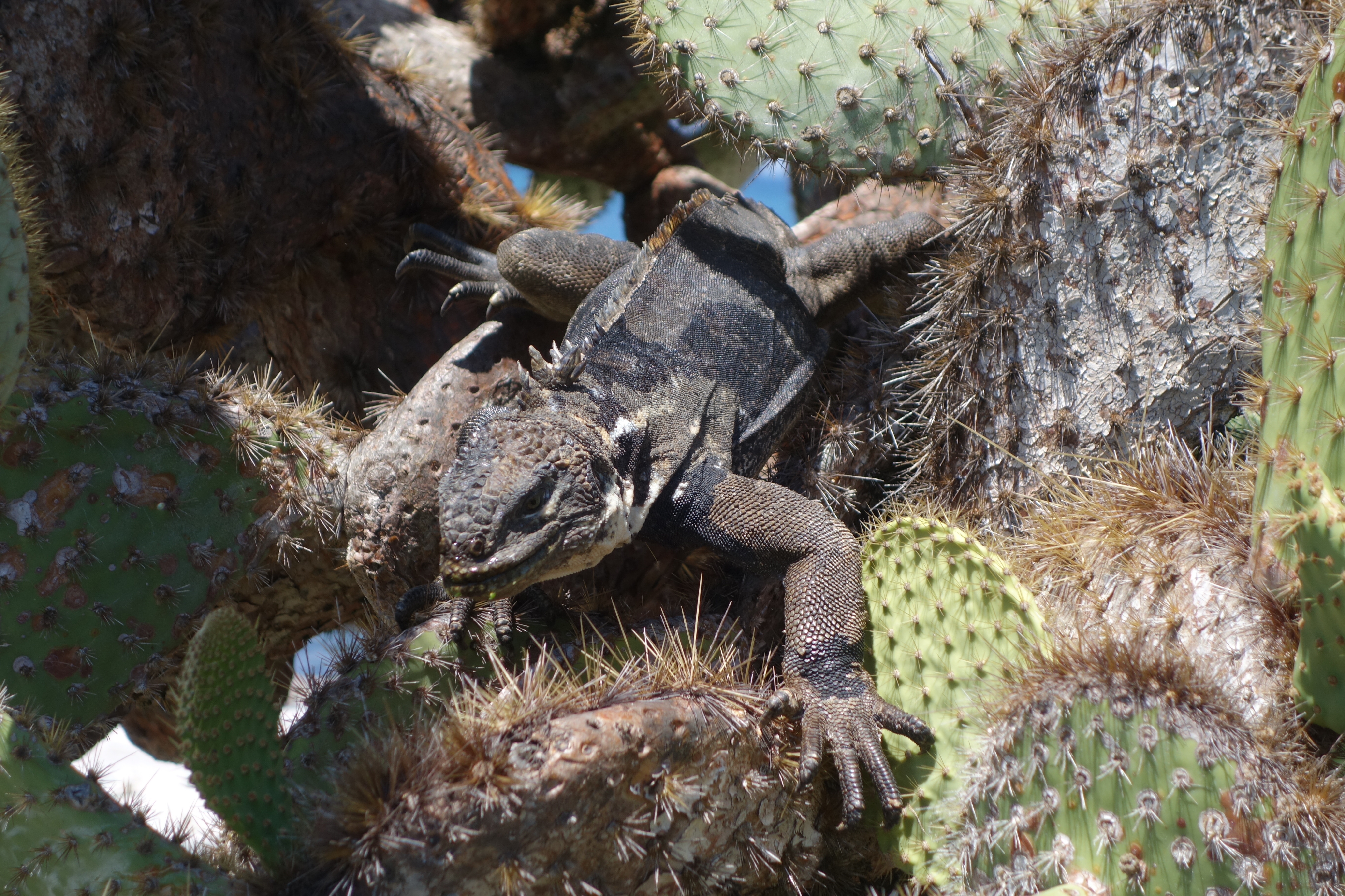 Seal pups are playing amongst the rocks while a 3 metre Tiger shark cruises past, looking for a snack. By dinner time, we have sailed to Puerto Aurora on Isla Santa Cruz. This is home town for the boat and most of the crew. It’s a pretty little town with a sufficiency of T-shirt shops and bars and we manage to convince ourselves to stay up until 9.30 so that Dori can get her wifi fix. Baby black-tipped reef sharks circle the pier lights as we head home.