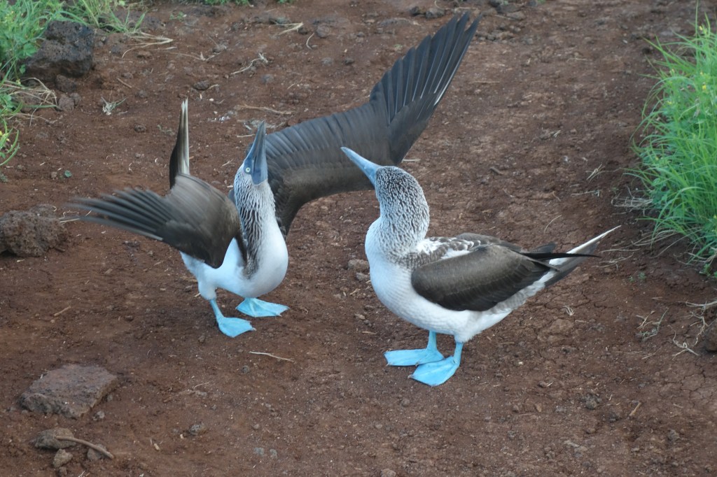 Lady frigates swoop in to check out the dudes before shagging ensues. On the path in front of us, Blue Footed Boobies do the Boobie dance. Luminous blue feet are raised side to side, beaks kiss, wings arch and whistles erupt as Boobies make babies.
