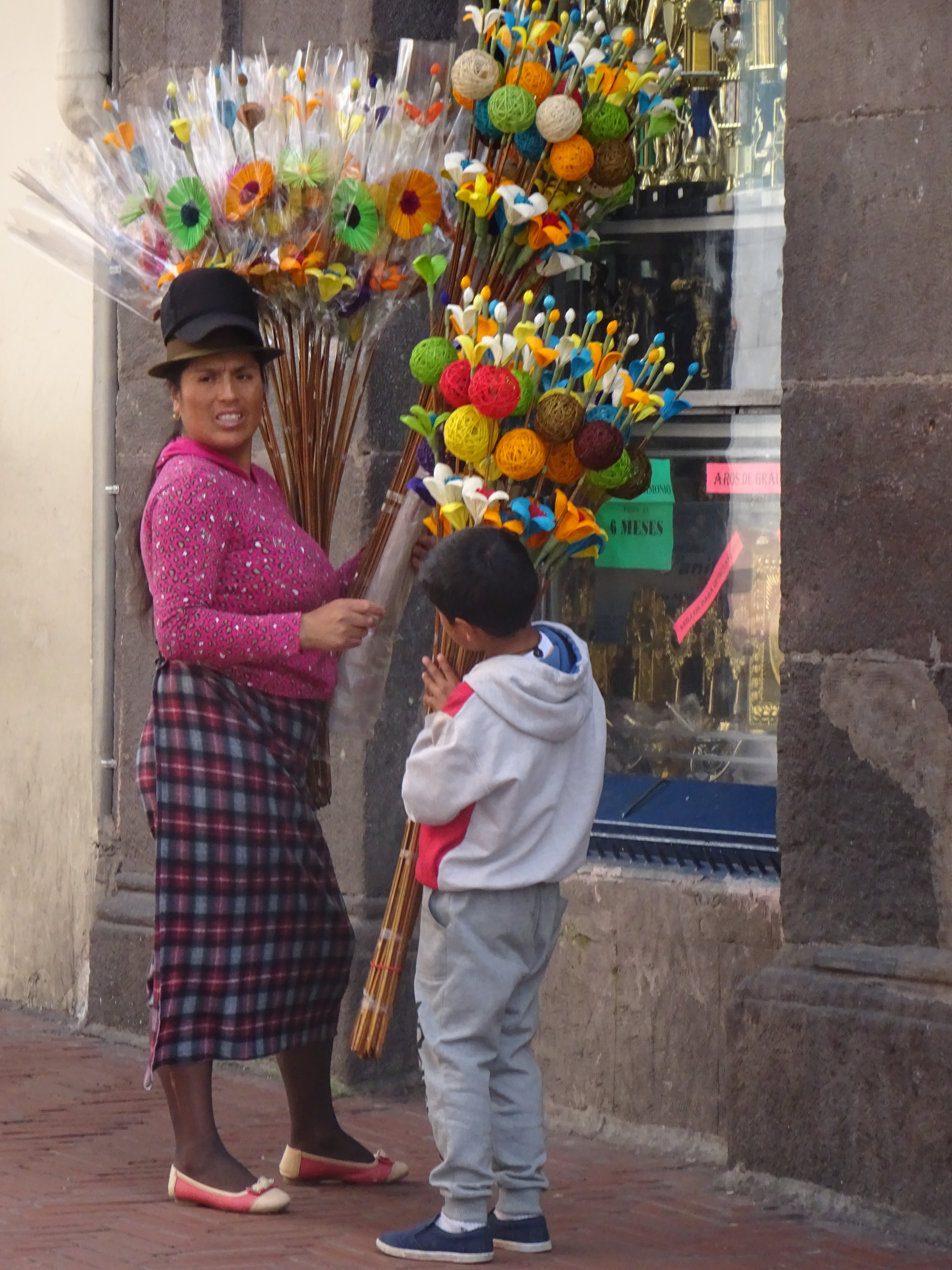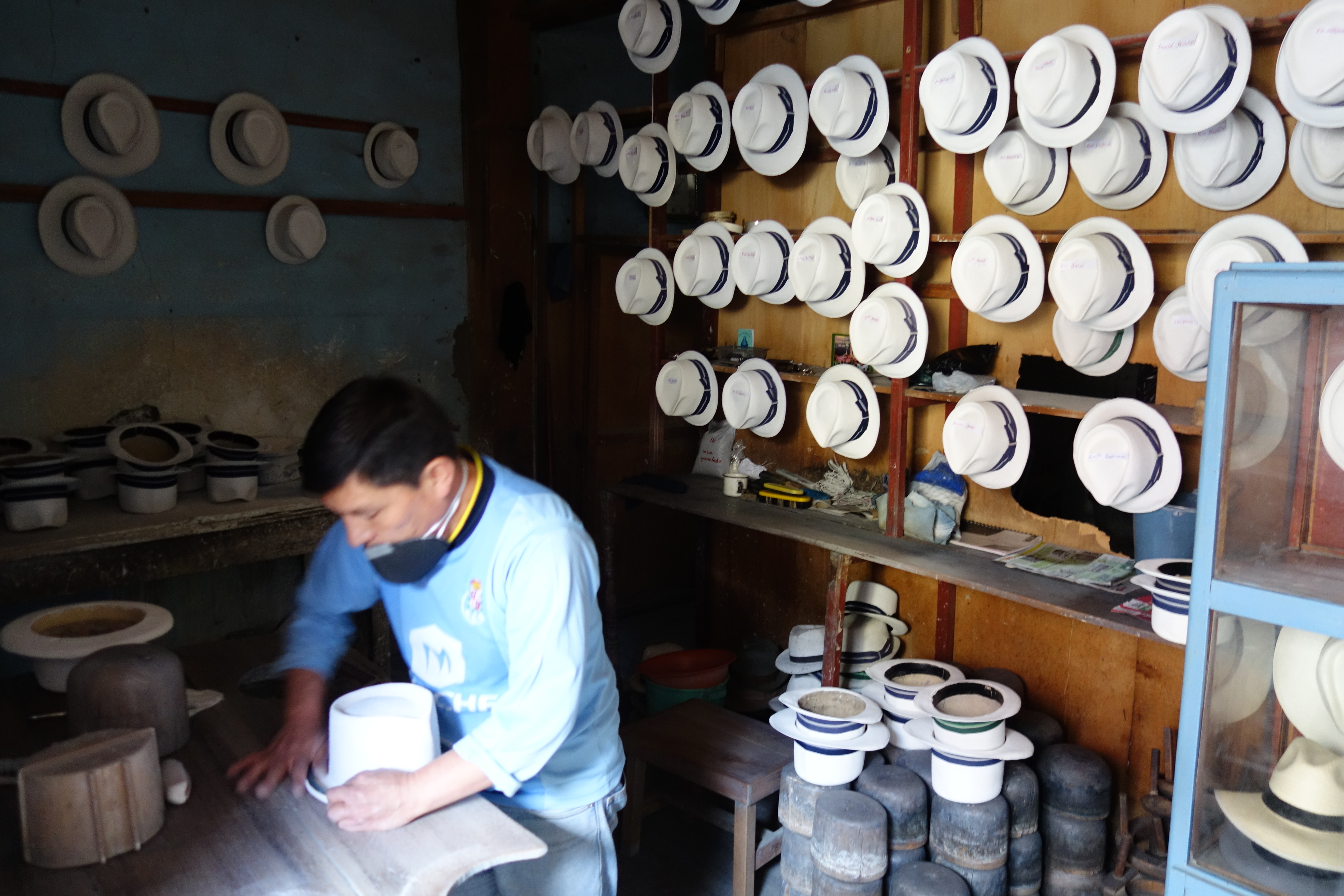Around the corner, Jon spots a glint in a tiny hole-in-the-wall workshop. Inside, an old Gentleman works in an Aladdin’s cave of mirrors framed in punched metal painted with bright lacquers. They are gorgeous and it takes us about an hour to empty the place. Dori is very happy. Further down the street is a man who repairs hats. All the indigenous ladies wear a white trilby that seems to be made of plaster-of-paris and this guy provides a renovation service. For a dollar, he also allows silly Gringos to put them on and pose for photos.